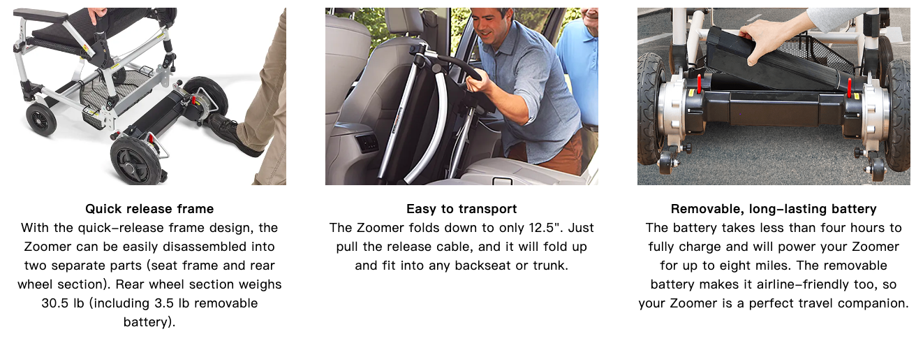 • FAA compliant and safe for travel — Now you can take that dream trip you always wanted.  Take your Zoomer right up to the gate, remove the battery and carry it onto the plane, and the airline will take your Zoomer to stow it below. As you come off of the plane, you can get right back in your Zoomer and Zoom through the airport with ease.