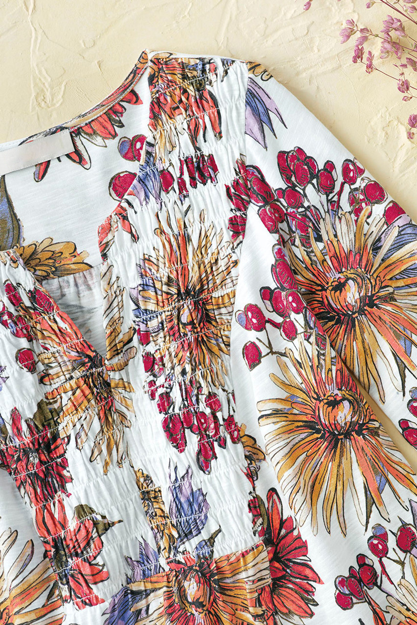 A bold splash of florals, accompanied by a medley of flattering details – front smocking for comfort and drape, plus a shirred back yoke. Slightly shaped bodice flows into a swingy A-line silhouette, with raglan 3/4 sleeves. Imported.