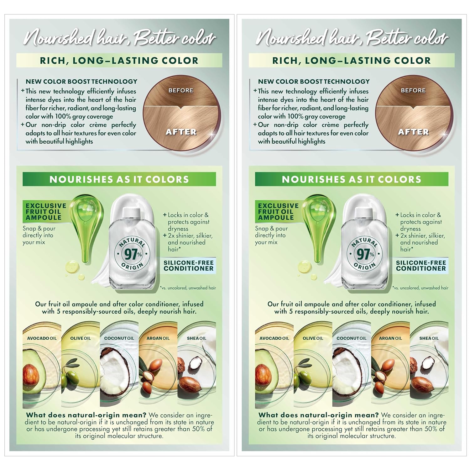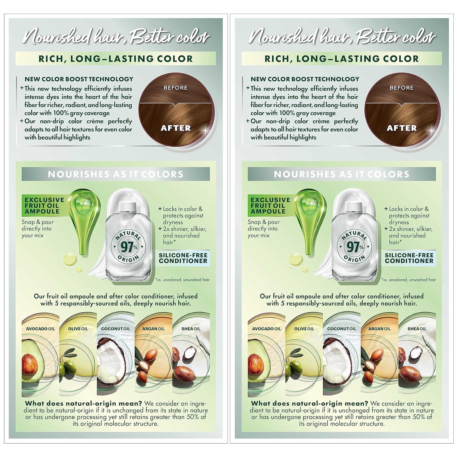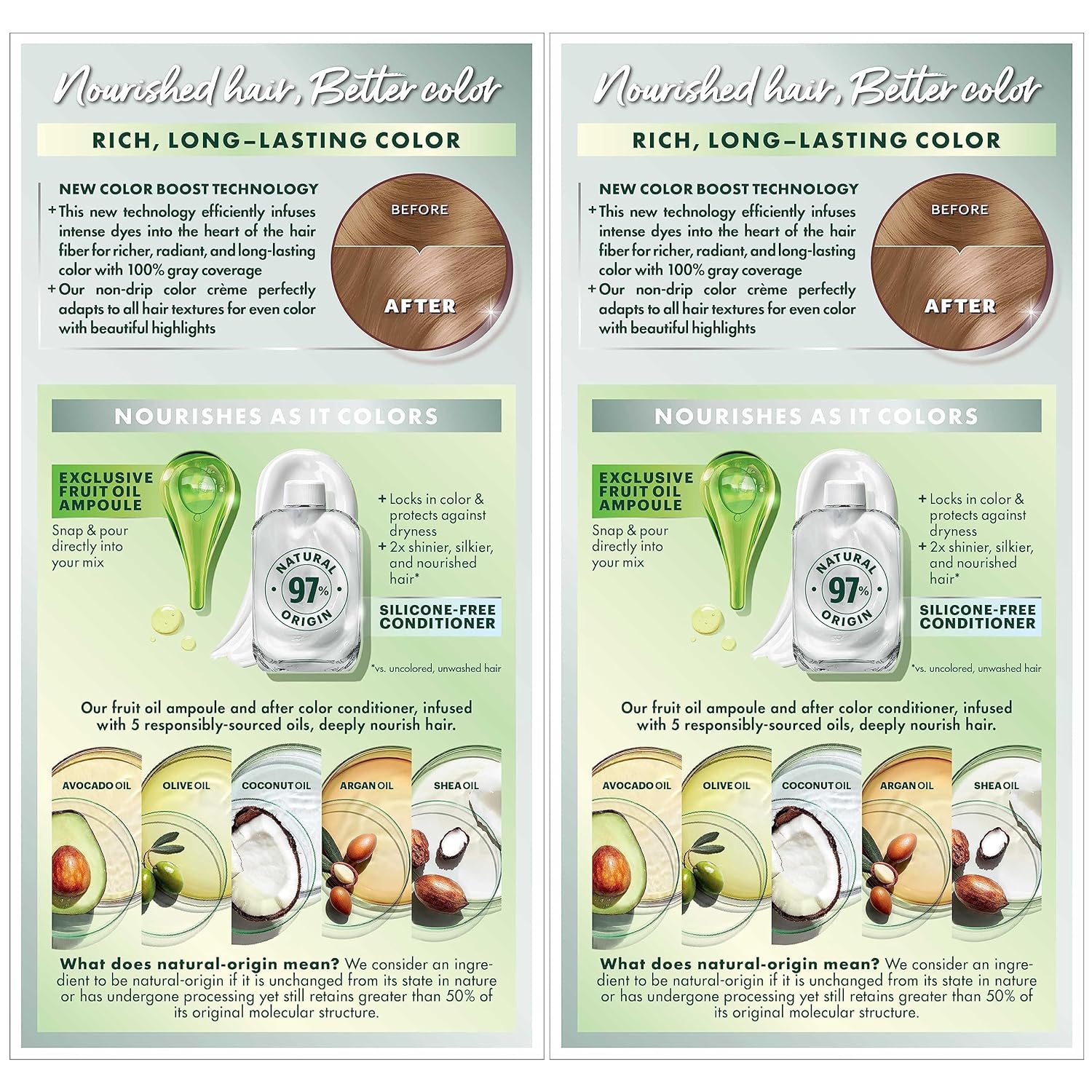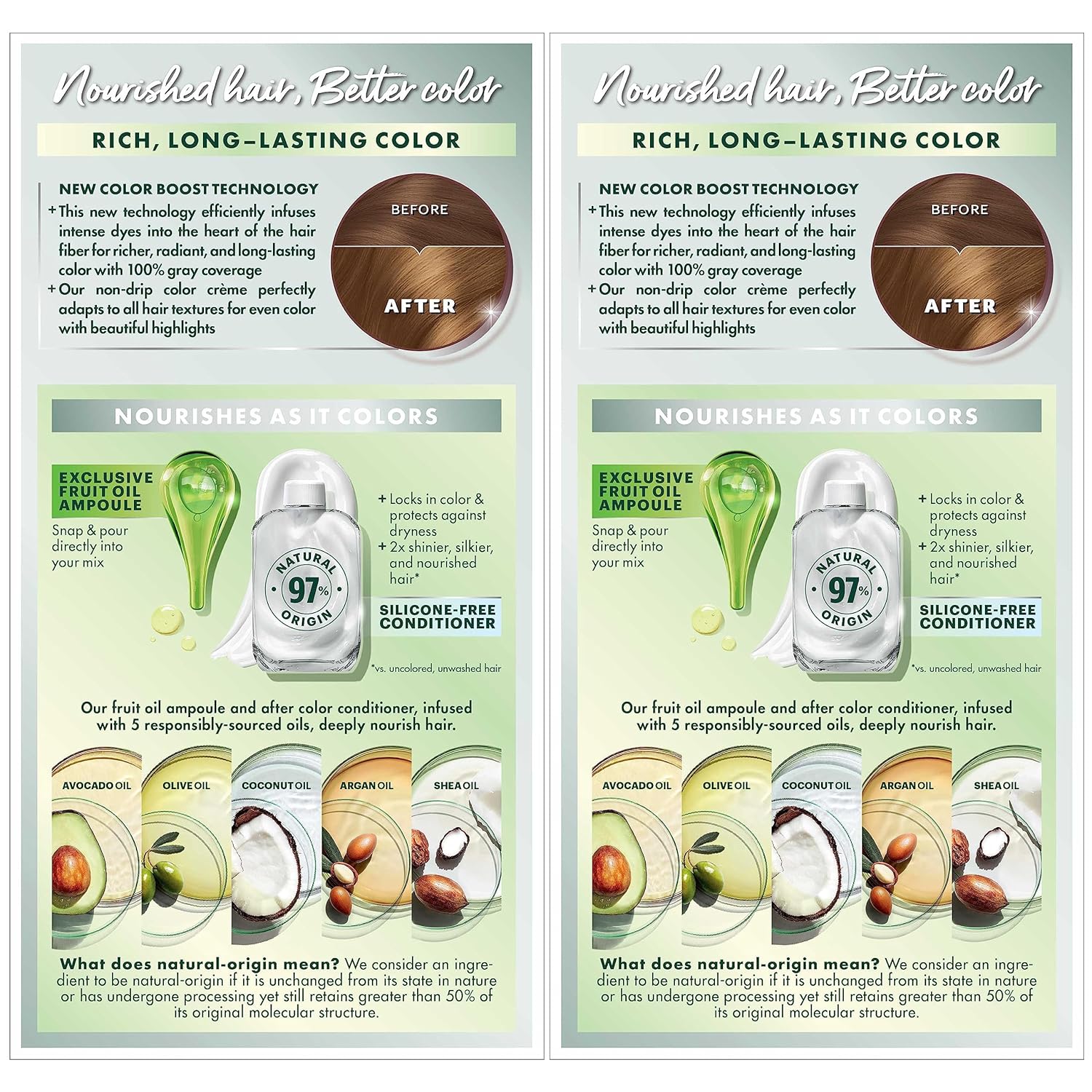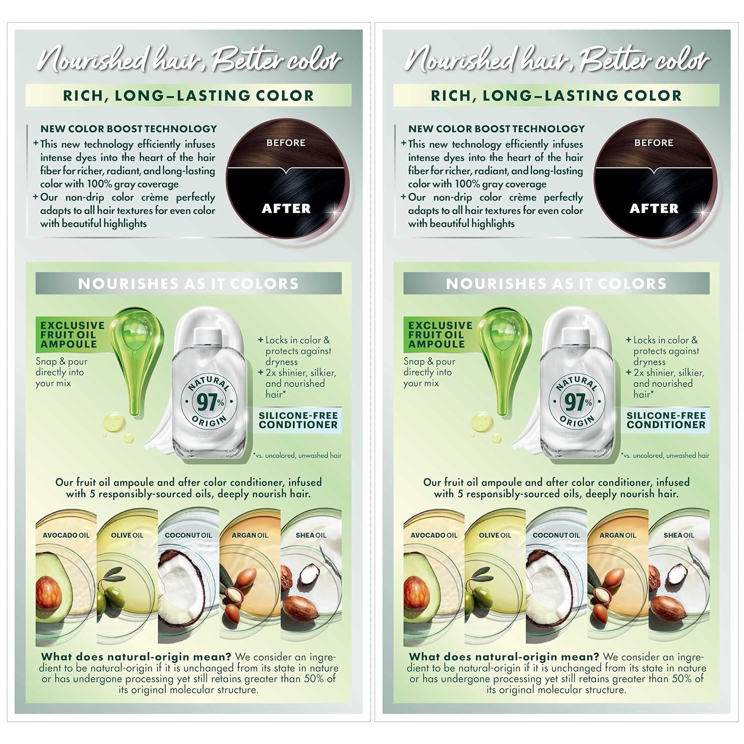 - Exclusive fruit oil ampoule, that is poured directly in the mix, after-color conditioner is enriched with 5 responsibly sourced oils: avocado, shea, olive, argan, and coconut oil for shiny, silky and nourished hair