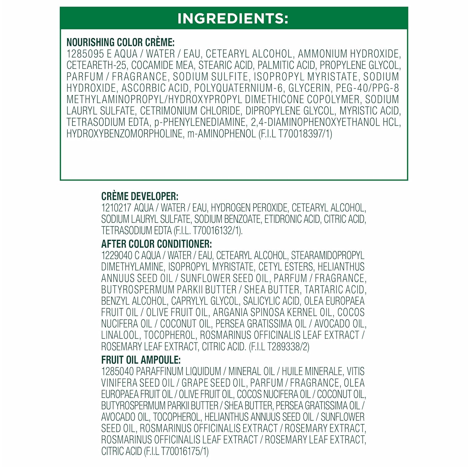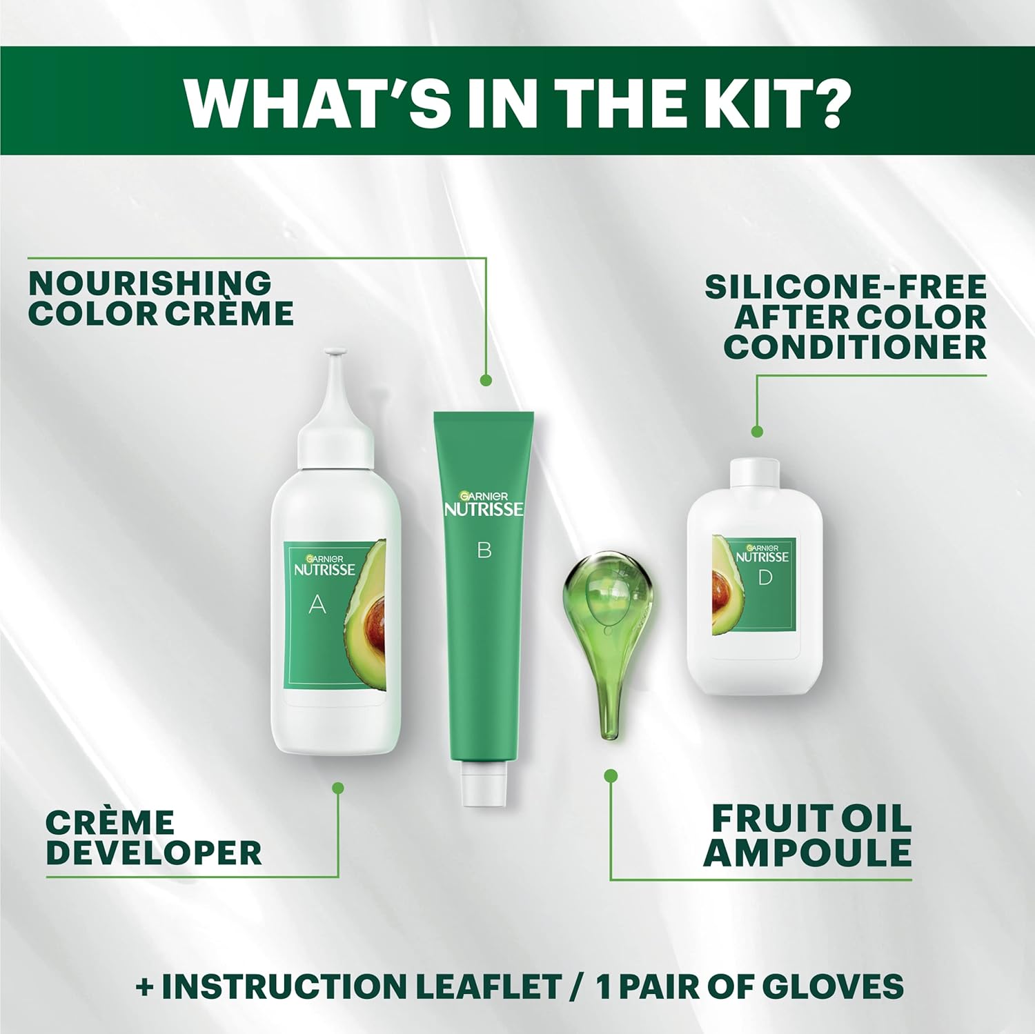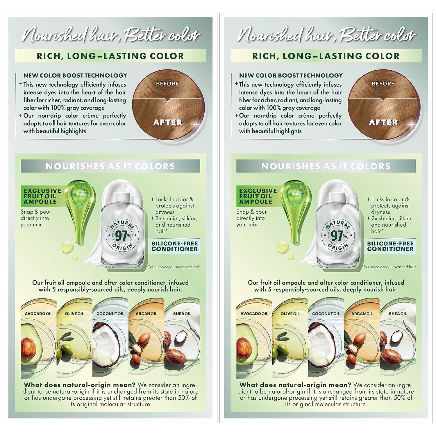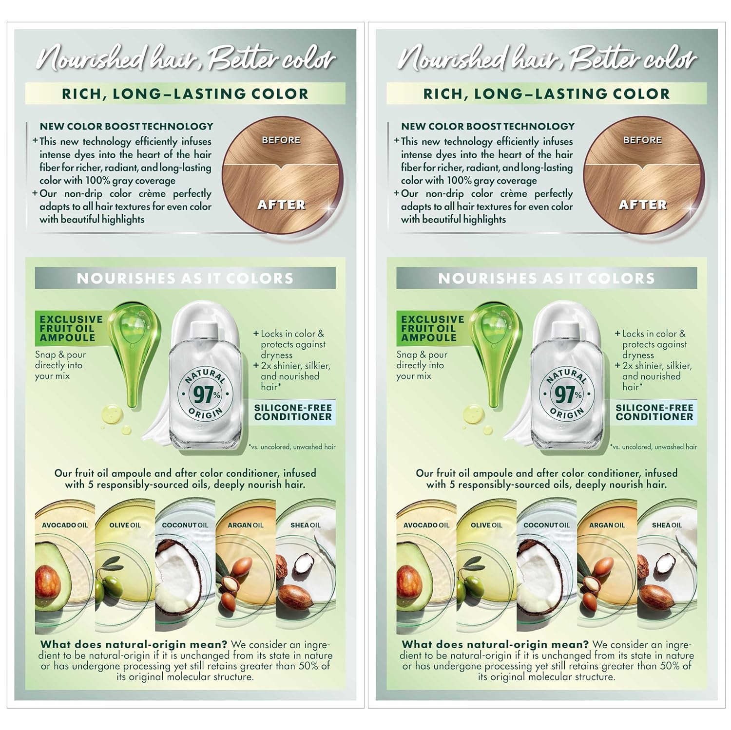 - Exclusive fruit oil ampoule, that is poured directly in the mix, after-color conditioner is enriched with 5 responsibly sourced oils: avocado, shea, olive, argan, and coconut oil for shiny, silky and nourished hair