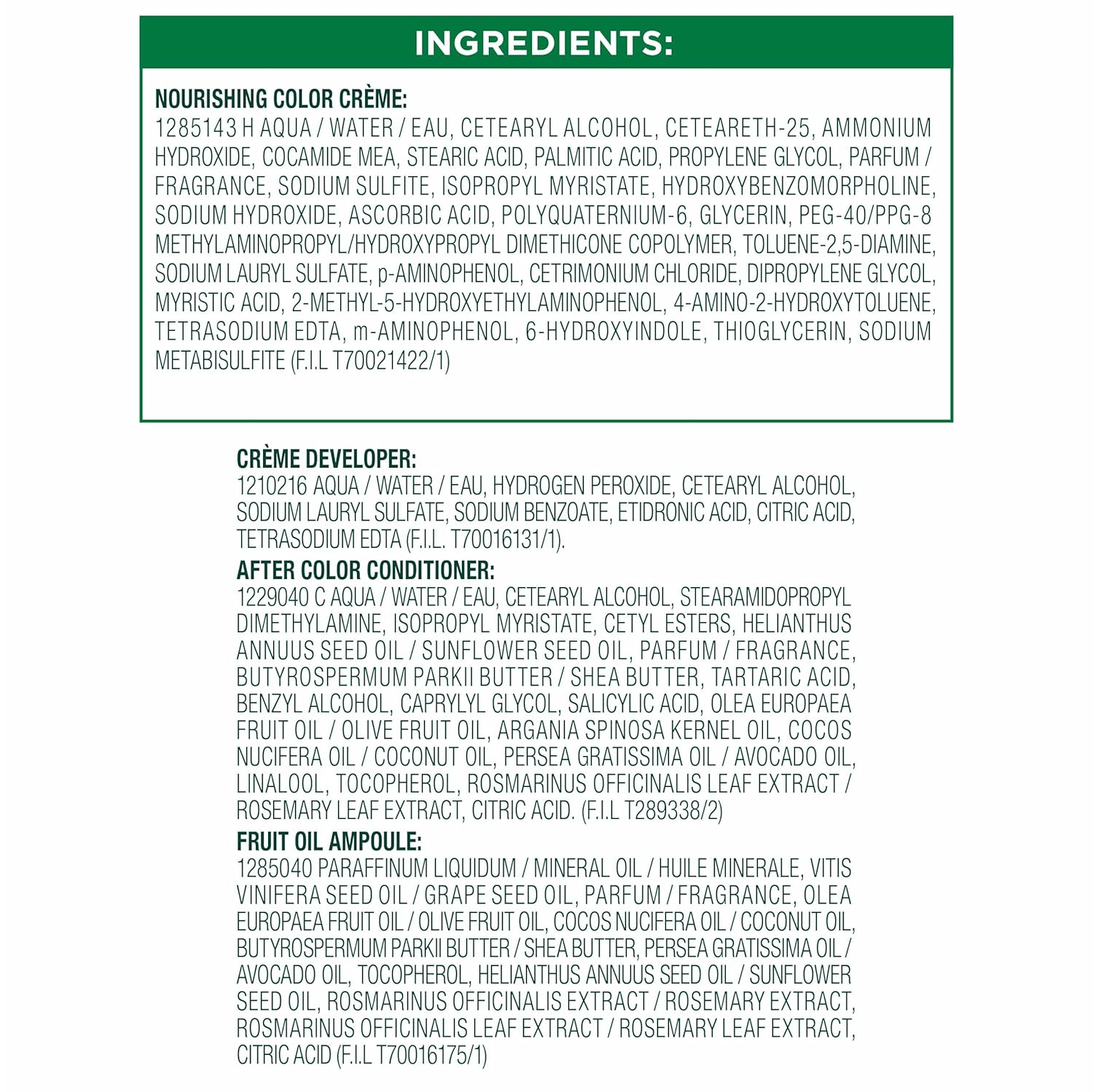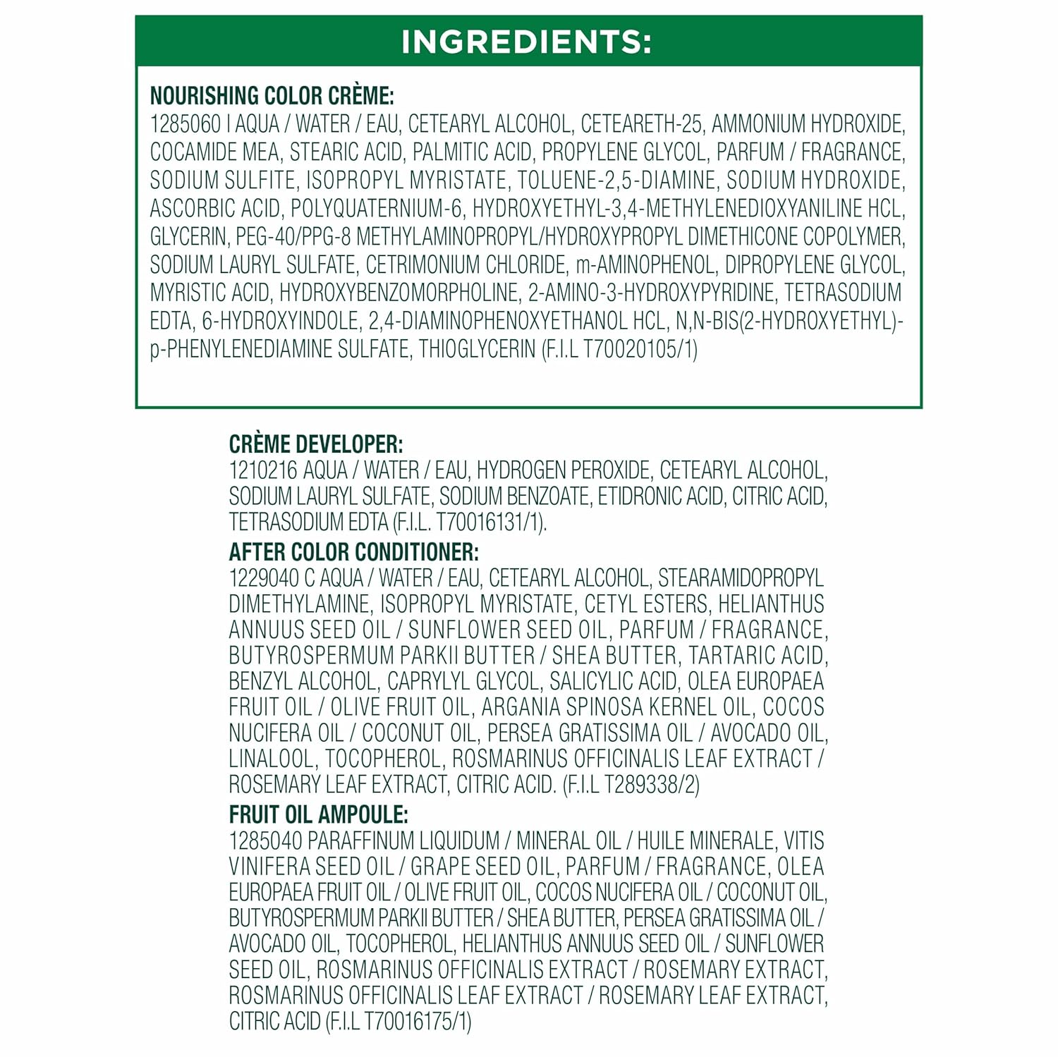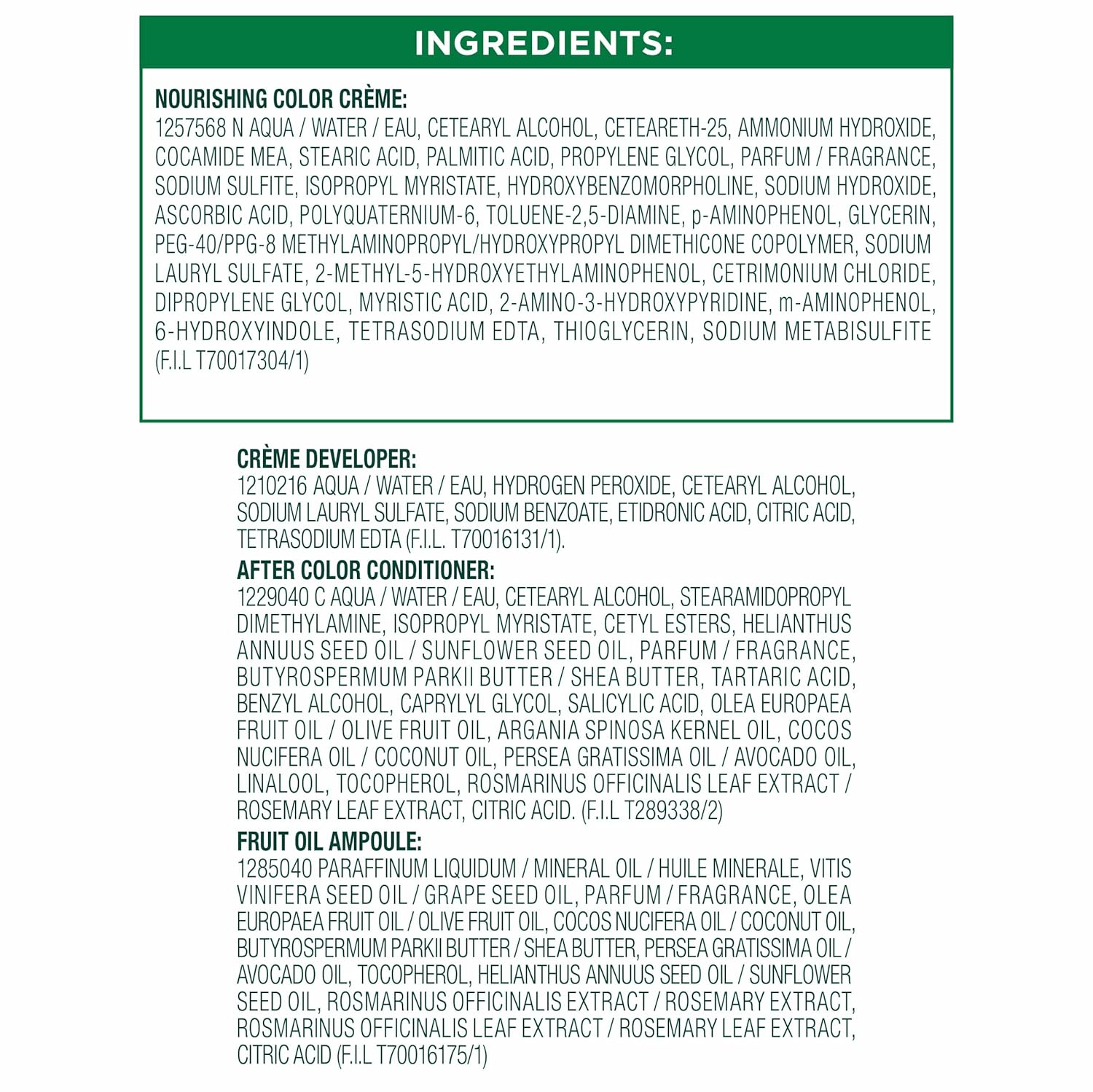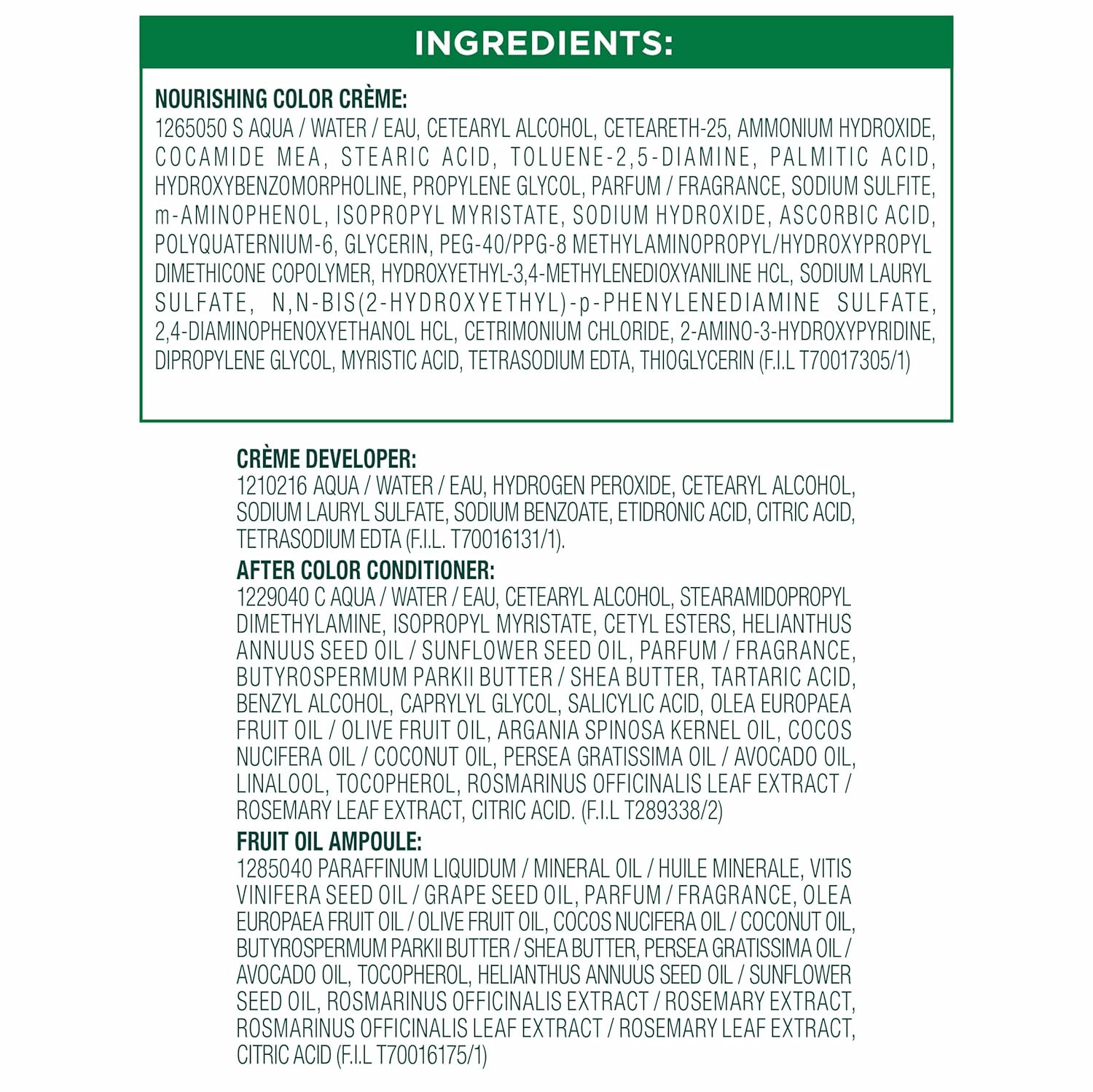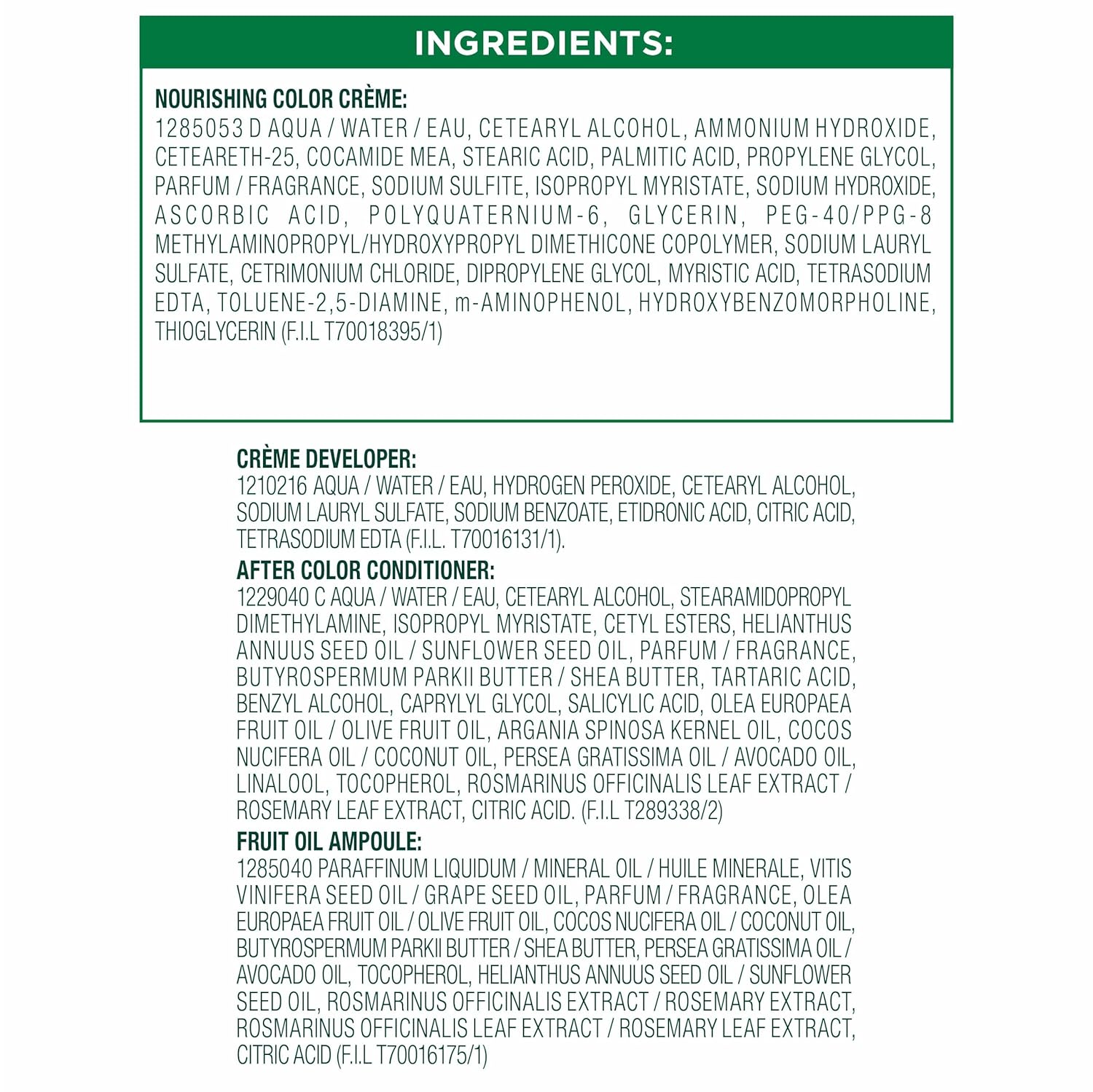 - Exclusive fruit oil ampoule, that is poured directly in the mix, after-color conditioner is enriched with 5 responsibly sourced oils: avocado, shea, olive, argan, and coconut oil for shiny, silky and nourished hair
