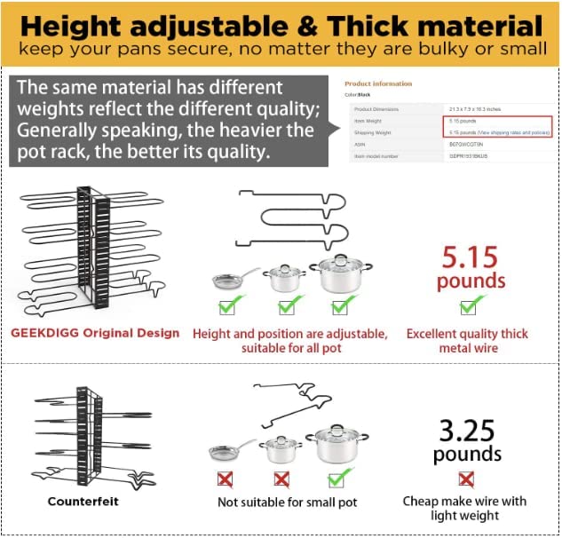 【Large Storage Capacity】This height and position adjustable pot holders store up to 9 frying pans, sauce pans, griddles or pots of various sizes. It’s a perfect solution for storing all the pot and pan, saving you lots of space in thekitchen or in cabinet and countertop.