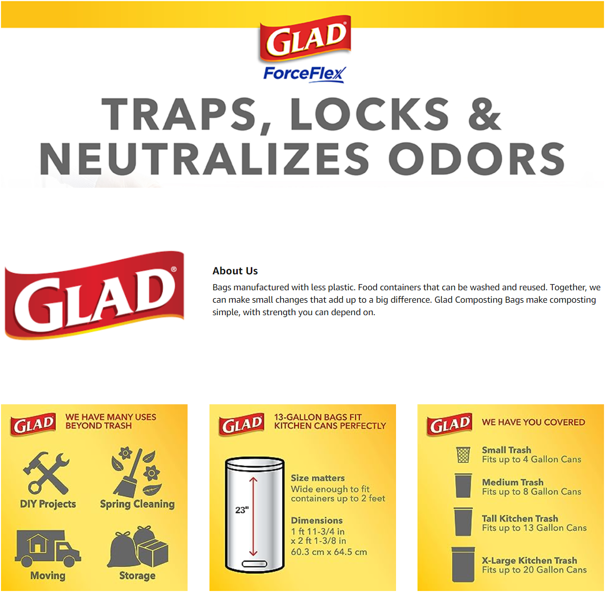 - PRODUCTS WITH LESS PLASTIC: Glad ForceFlex MaxStrength Tall Kitchen Trash Bags are made with less plastic than the competition** without sacrificing strength