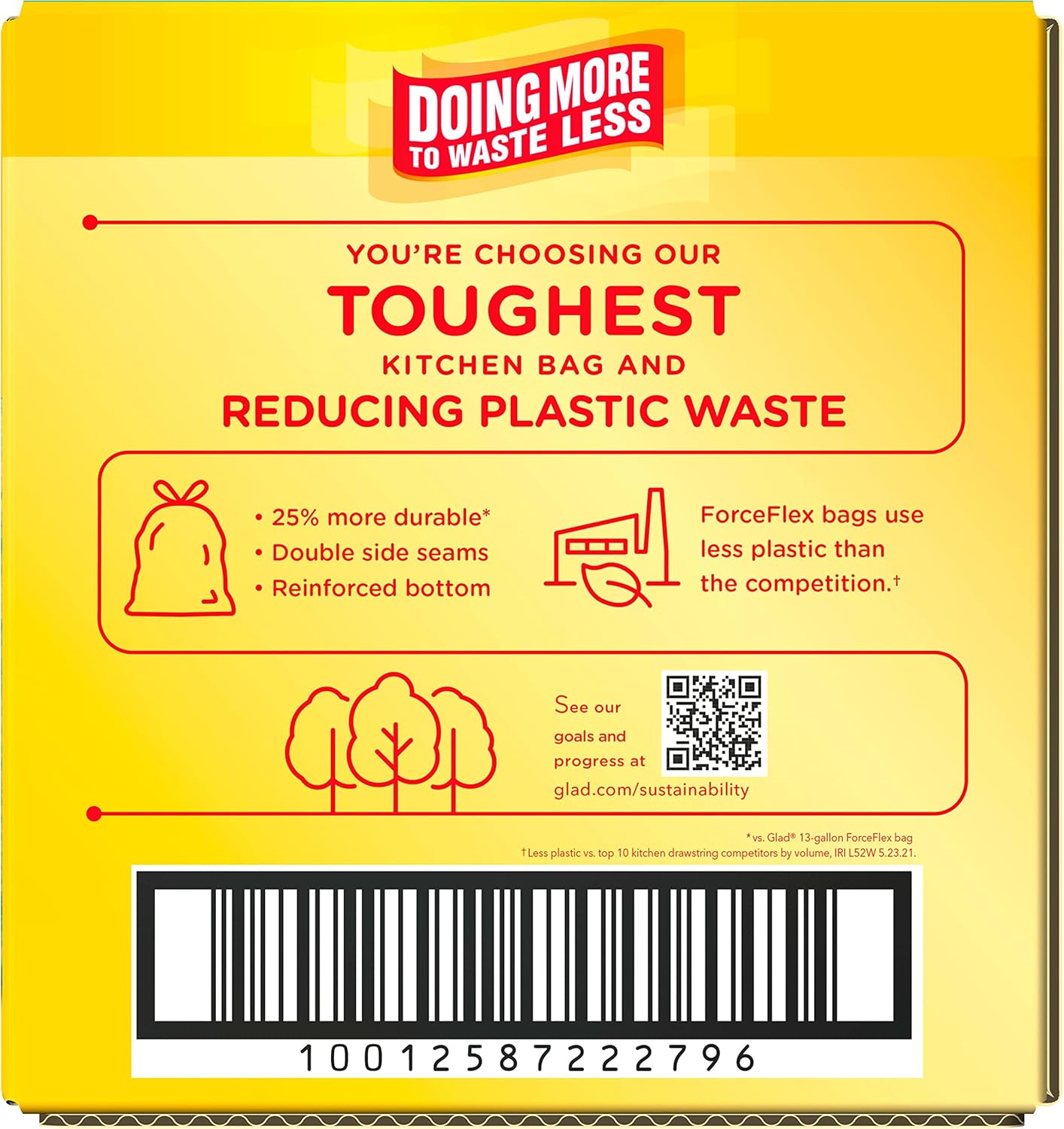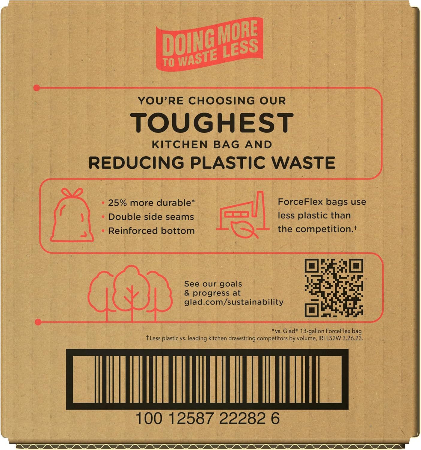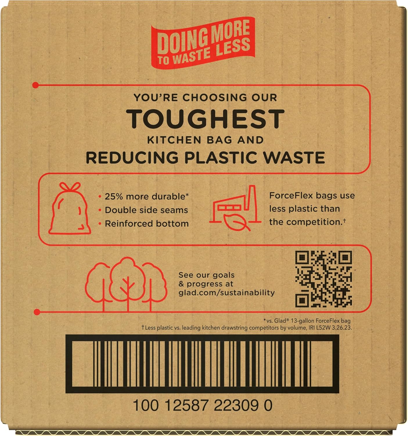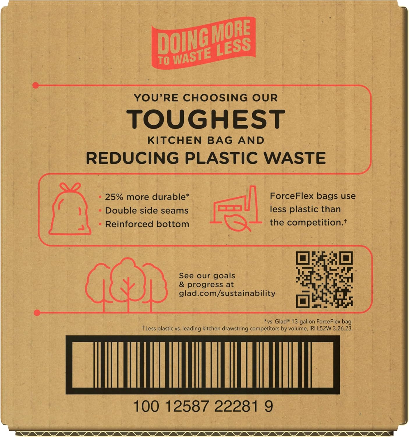 - 25% MORE DURABLE*: Glad ForceFlex MaxStrength Tall Kitchen Trash Bags are 25% more durable versus Glad 13 gallon ForceFlex tall kitchen bags; packaging may vary