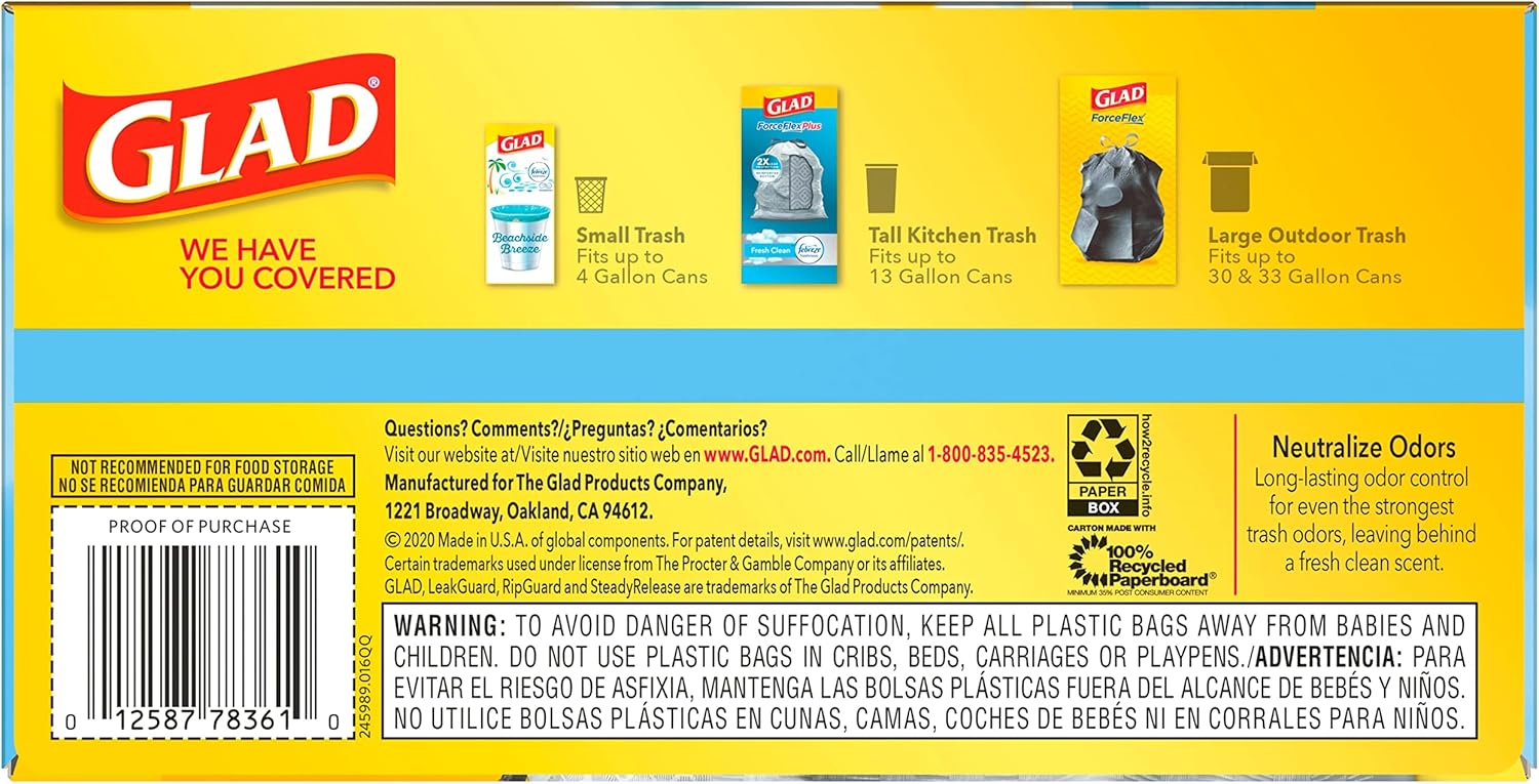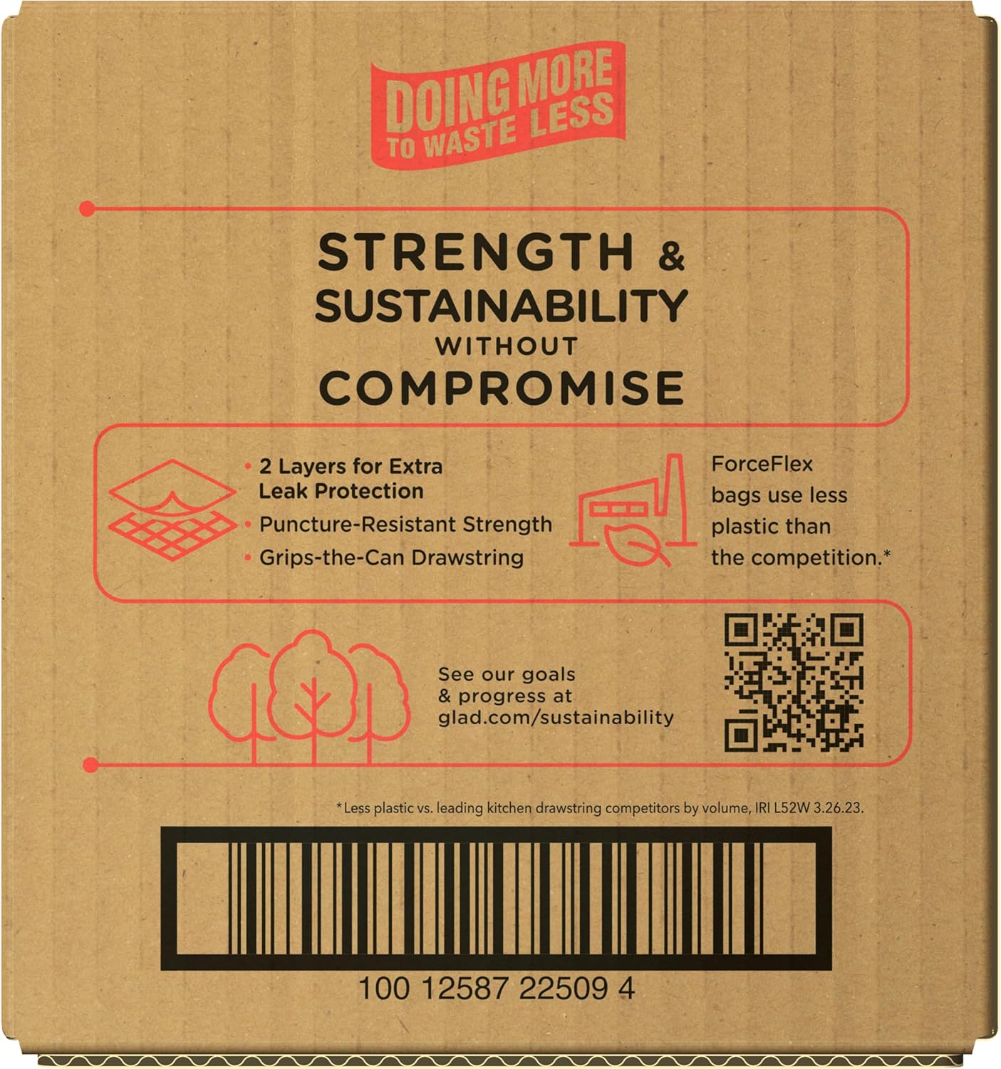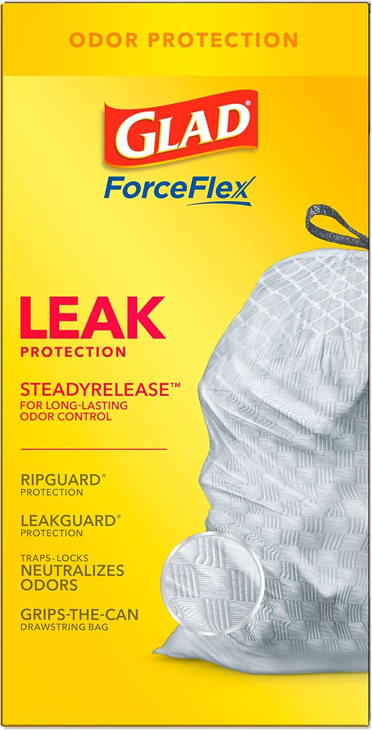 - FORCEFLEX STRENGTH: Glad’s trusted ForceFlex technology allows the bag to stretch and expand over heavy loads with sharp edges, delivering durable strength; packaging may vary