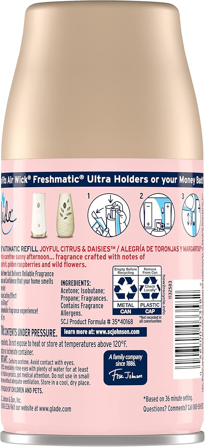 - Glade clean linen fragrance spray refills deliver a fresh burst every 9, 18 or 36 minutes for a timed fragrance release using Glade's Automatic Spray Dispenser