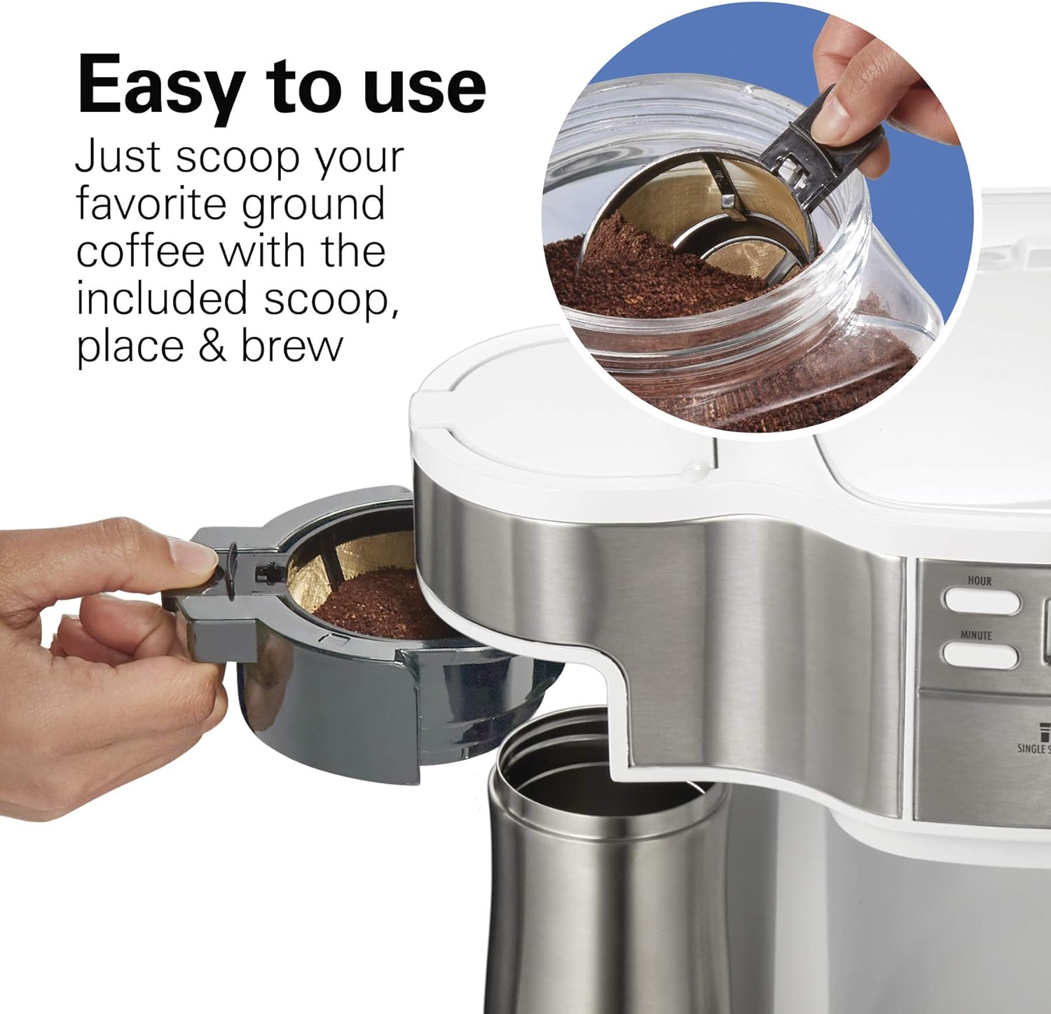 - EASY TO USE. With the included mesh scoop, adding your favorite ground coffee to brew a cup of coffee couldn’t be easier: just scoop, place and brew. There's no need to use a separate scoop or measure coffee before brewing. Control panel and display, with an hour and minute buttons to program the brewing time up to 24 hours beforehand