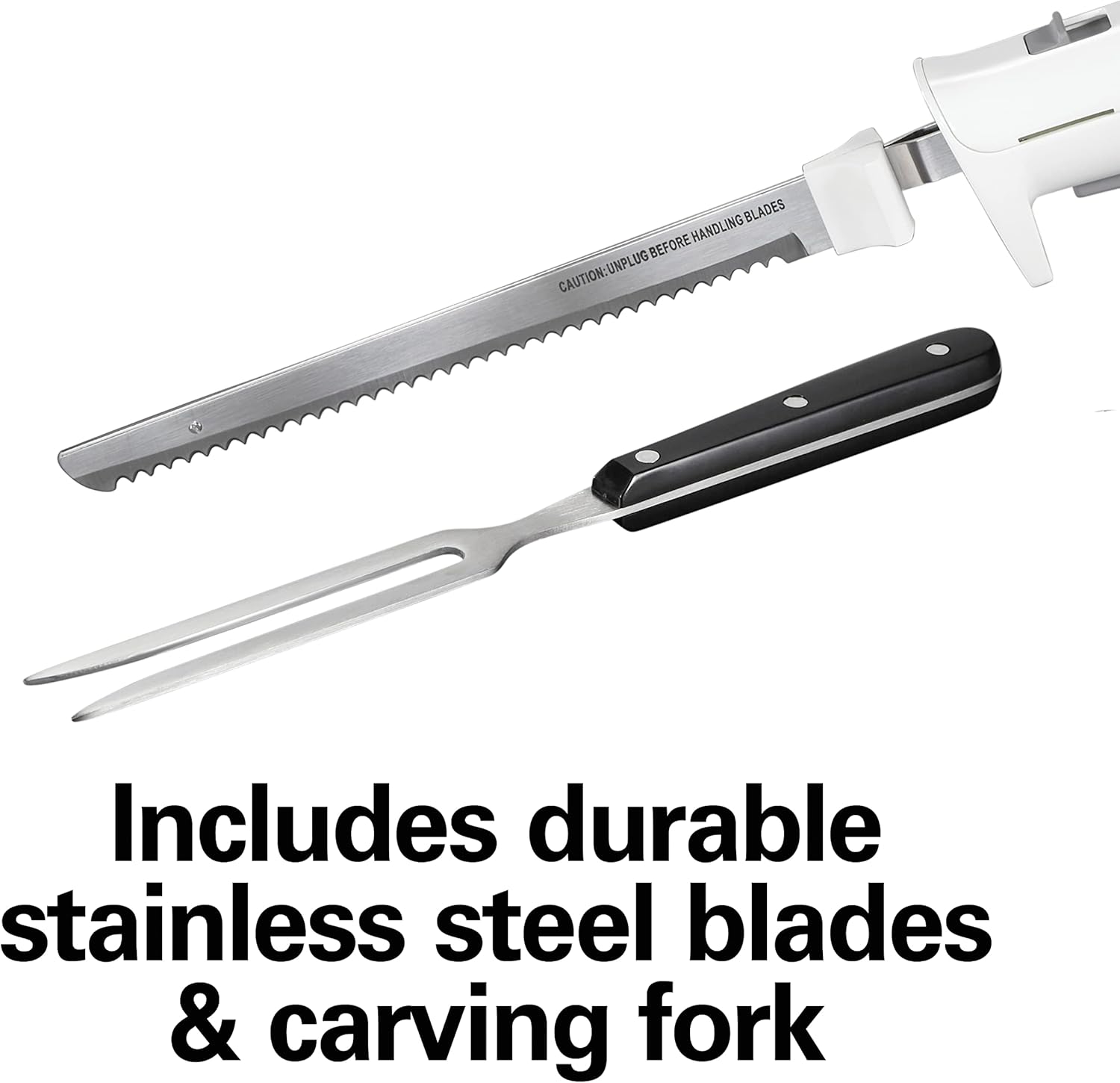 | Model Name | Hamilton Beach Electric Knife Set for Carving Meats, Poultry, Bread, Crafting Foam & More, Reciprocating Serrated Stainless Steel Blades, Ergonomic Design Storage Case + Fork Included, 5 Foot Cord, White |