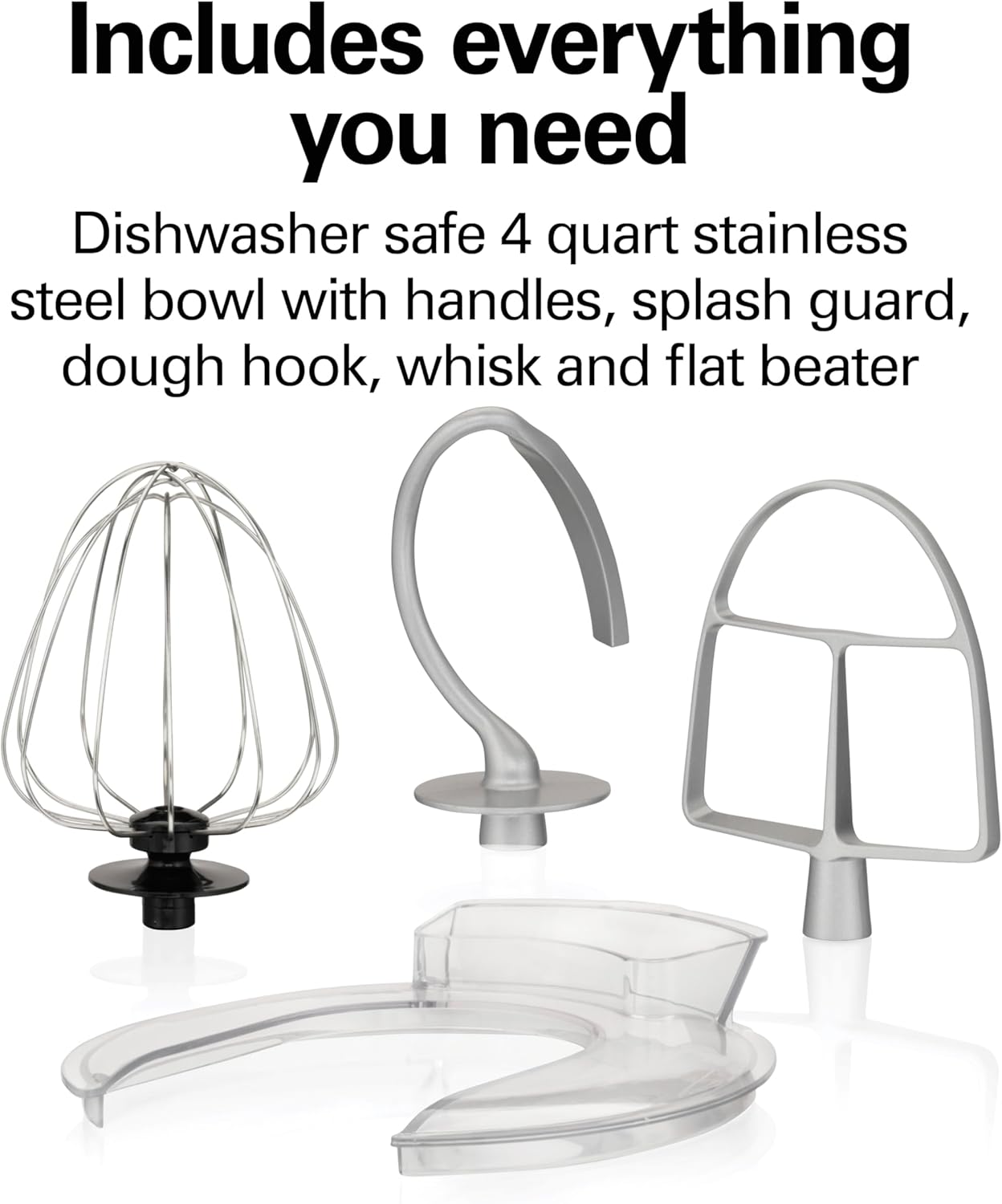 - INCLUDES EVERYTHING YOU NEED: In addition to the stainless steel bowl with handles, the stand mixer comes with a splash guard, dough hook, whisk and flat beater. The bowl and the stand mixer attachments are all dishwasher safe.