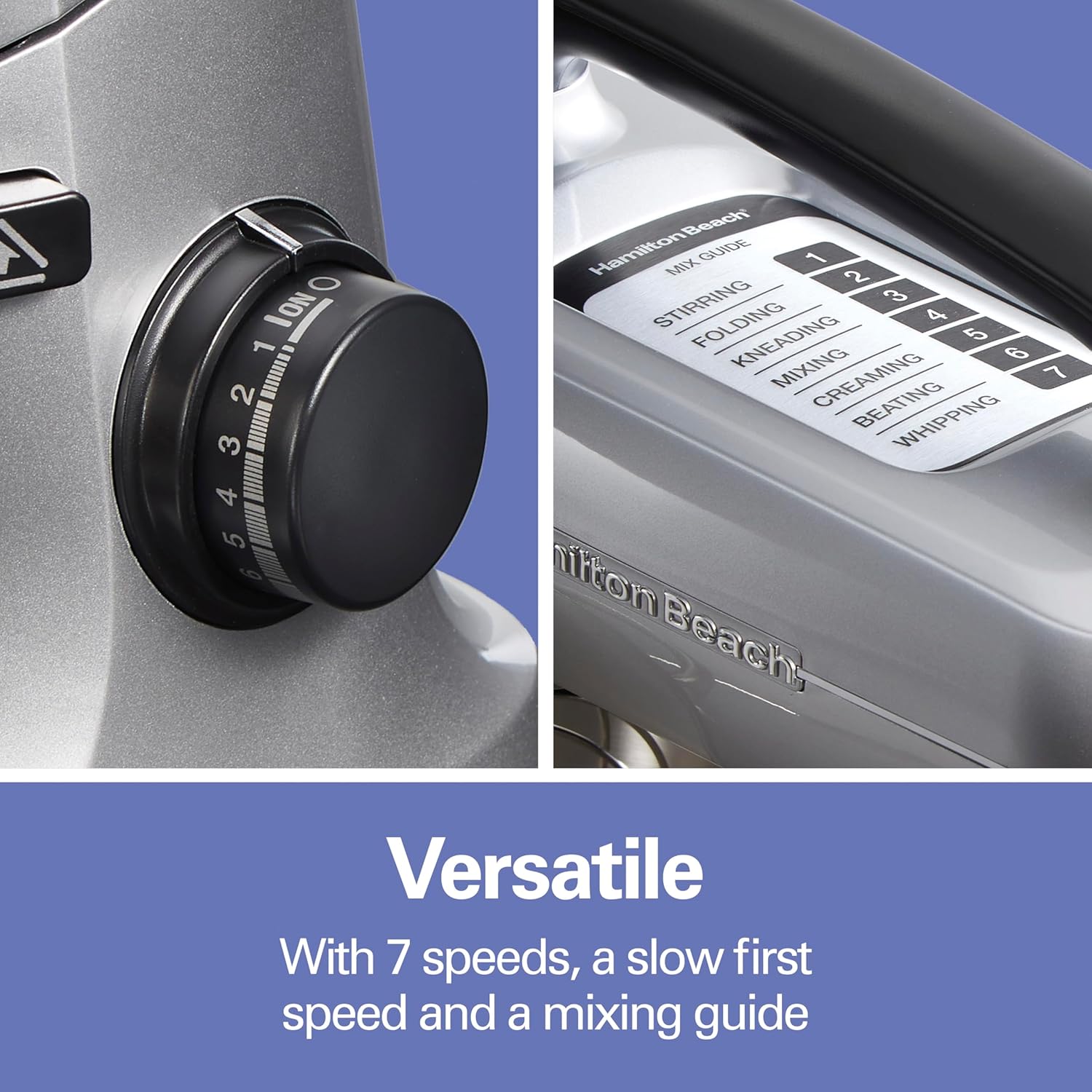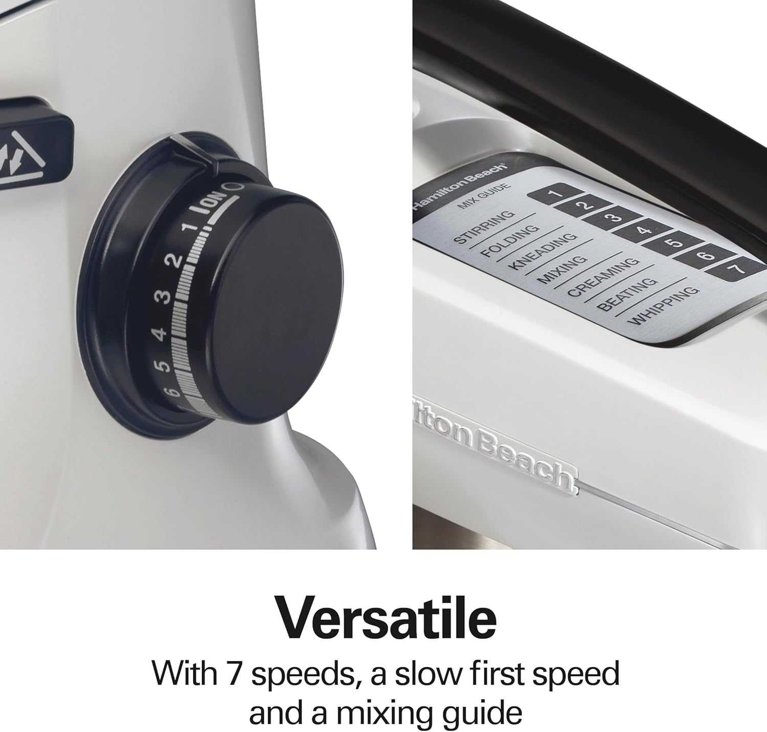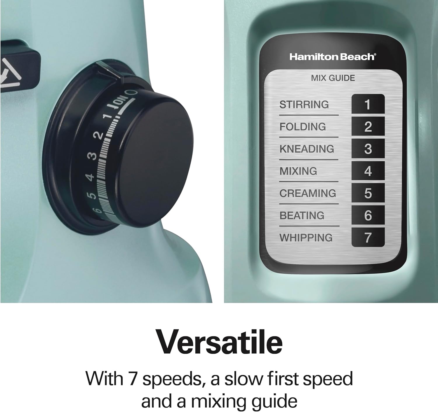 - VERSATILE — 7 SPEEDS, SLOW FIRST SPEED & MIXING GUIDE: A helpful guide on top of the electric mixer helps you choose the right speed for the job. The slow first speed is great for kneading bread and reducing splatter when adding dry ingredients to wet ingredients.