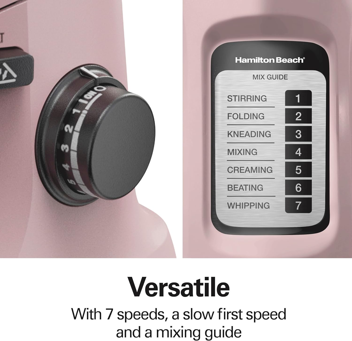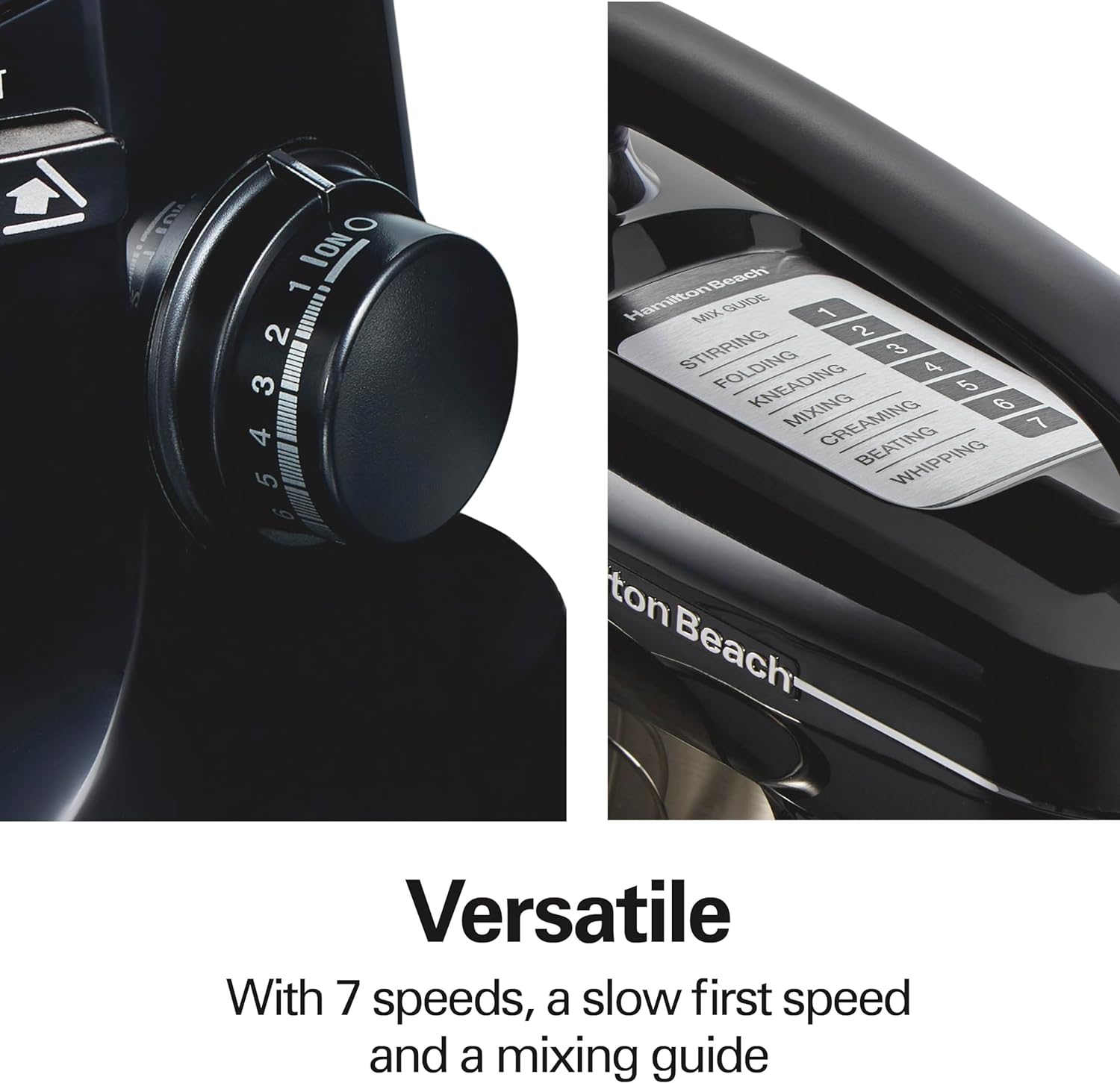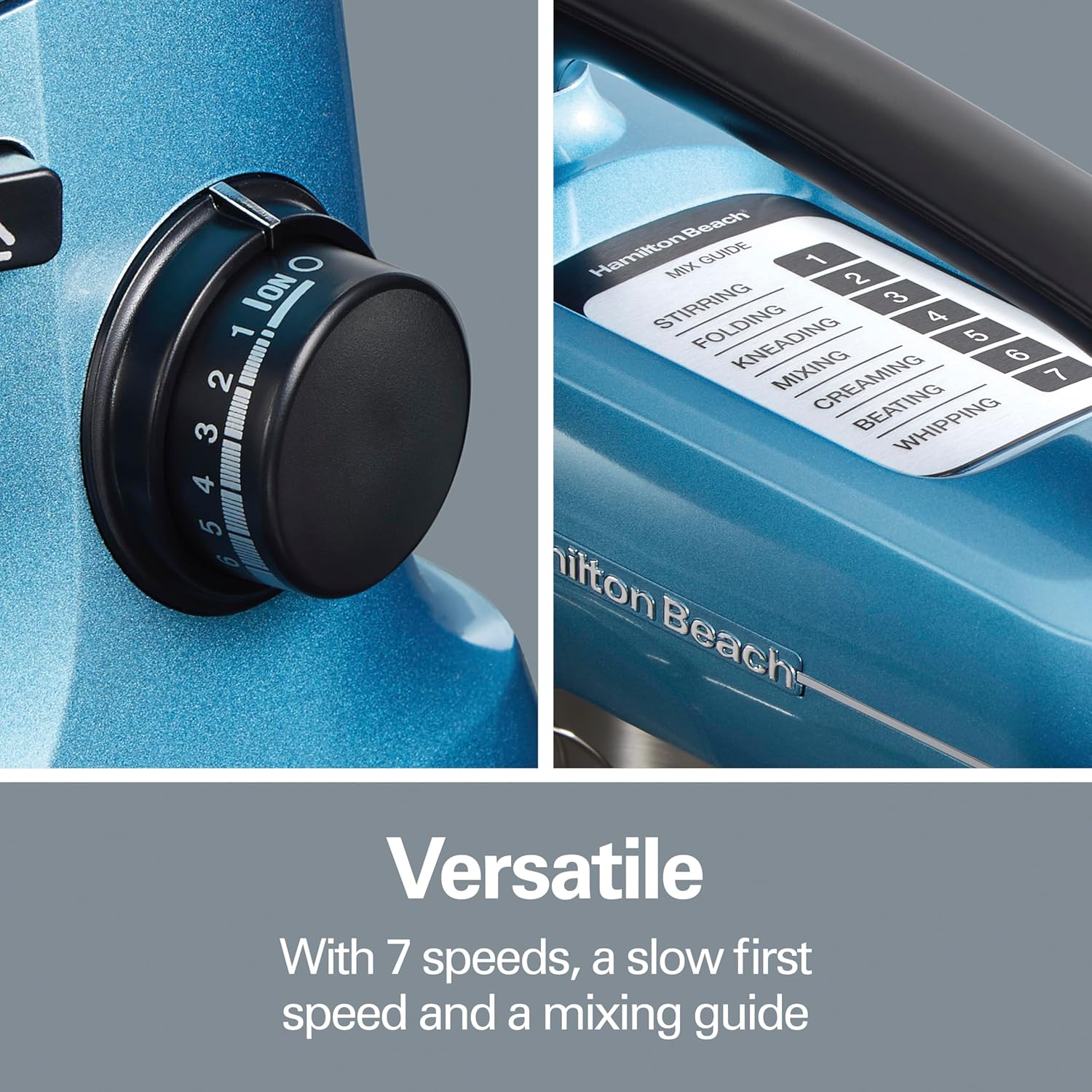 - VERSATILE — 7 SPEEDS, SLOW FIRST SPEED & MIXING GUIDE: A helpful guide on top of the electric mixer helps you choose the right speed for the job. The slow first speed is great for kneading bread and reducing splatter when adding dry ingredients to wet ingredients.