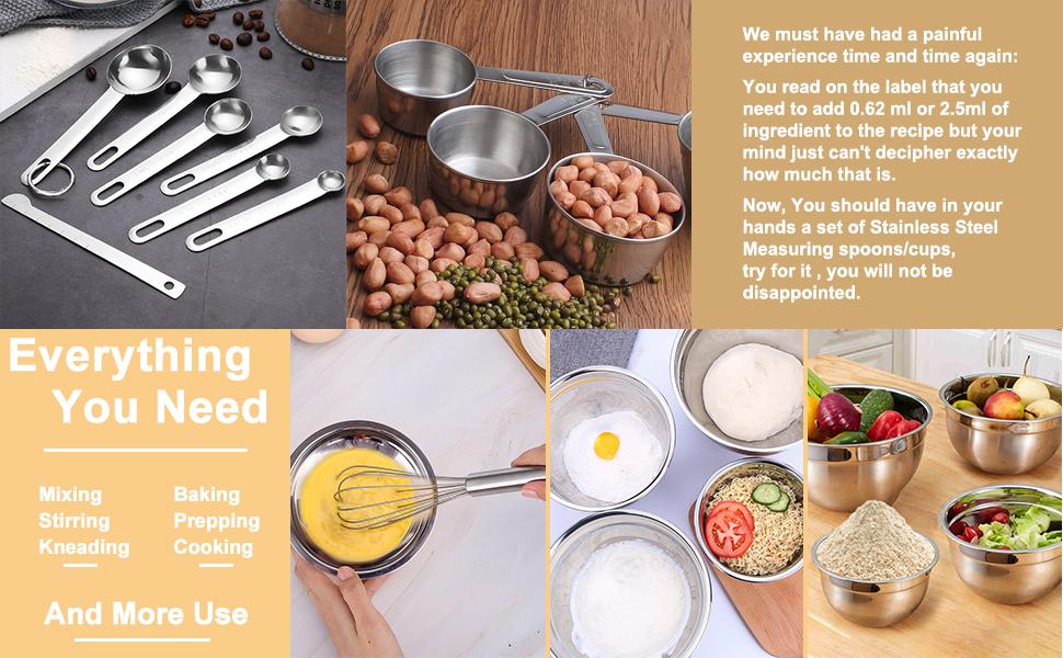 - 4 PCS Measuring Cups: sizes 1 cup, 1/2 cup, 1/3 cup, and 1/4 cup. Easy to read engraved sizes showing 'mls' for dry and liquid measurement. Measuring cups and spoons are made of food grade 304 stainless steel. They are rust resistant, ensuring your cooking remains safe and healthy, with a long service life.