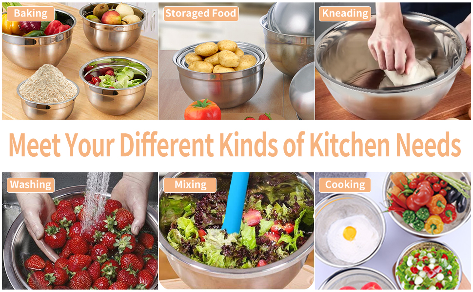 - 4 Stainless Steel Mixing Bowl Set: Come in different sizes 7, 6, 4.5, 2.5 Quart nesting bowls. Wide, flat rim ensures a sturdy grip for mixing, whisking, baking, cooking preparation and much more, This kitchen Bowls made of premium stainless steel, taste resistant, better shock-proof, rust-proof and easy to clean, could be nested storage for saving space.