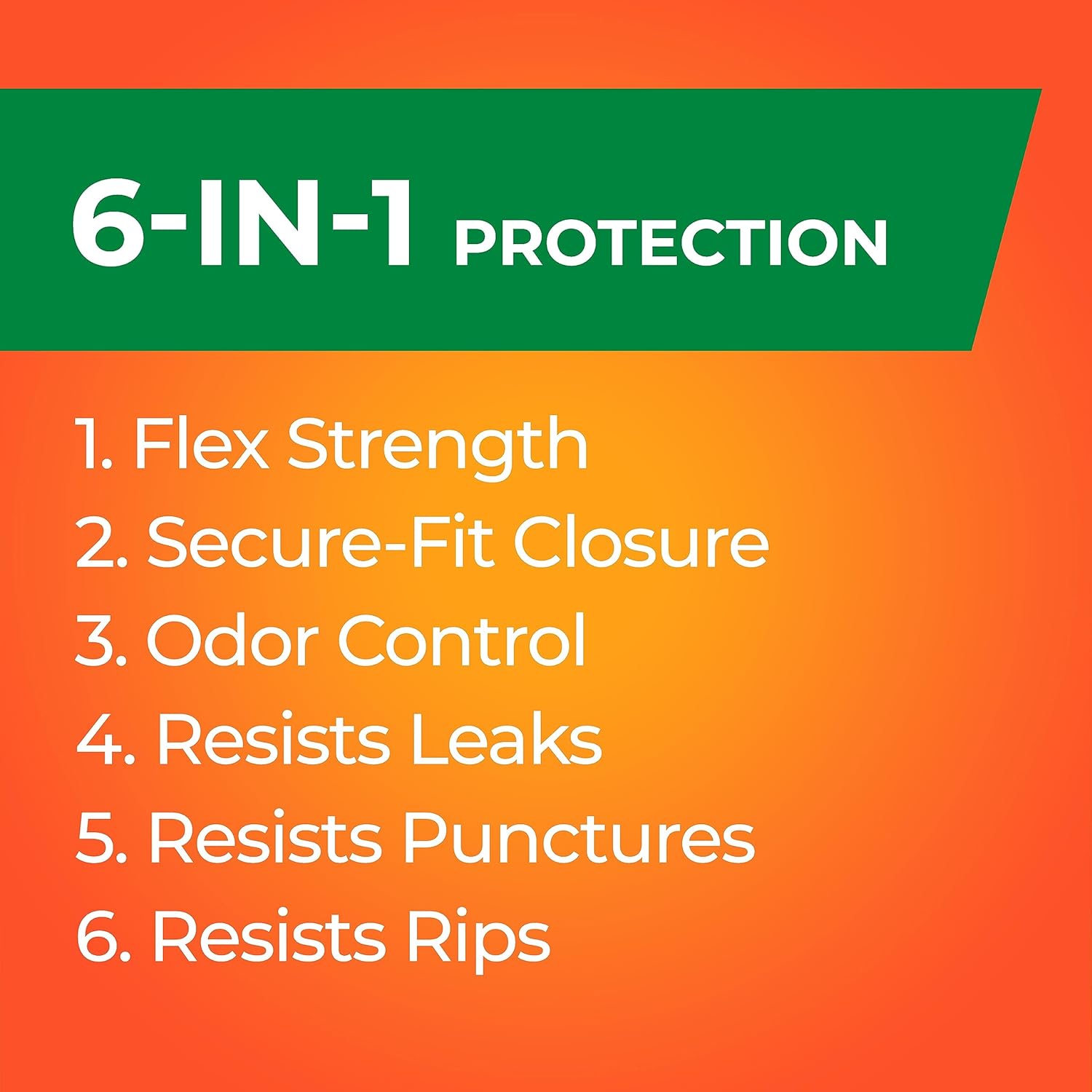 - Triple-Action Technology—These tall kitchen garbage bags stretch and expand to accommodate oversized loads without punctures, leaks or tears