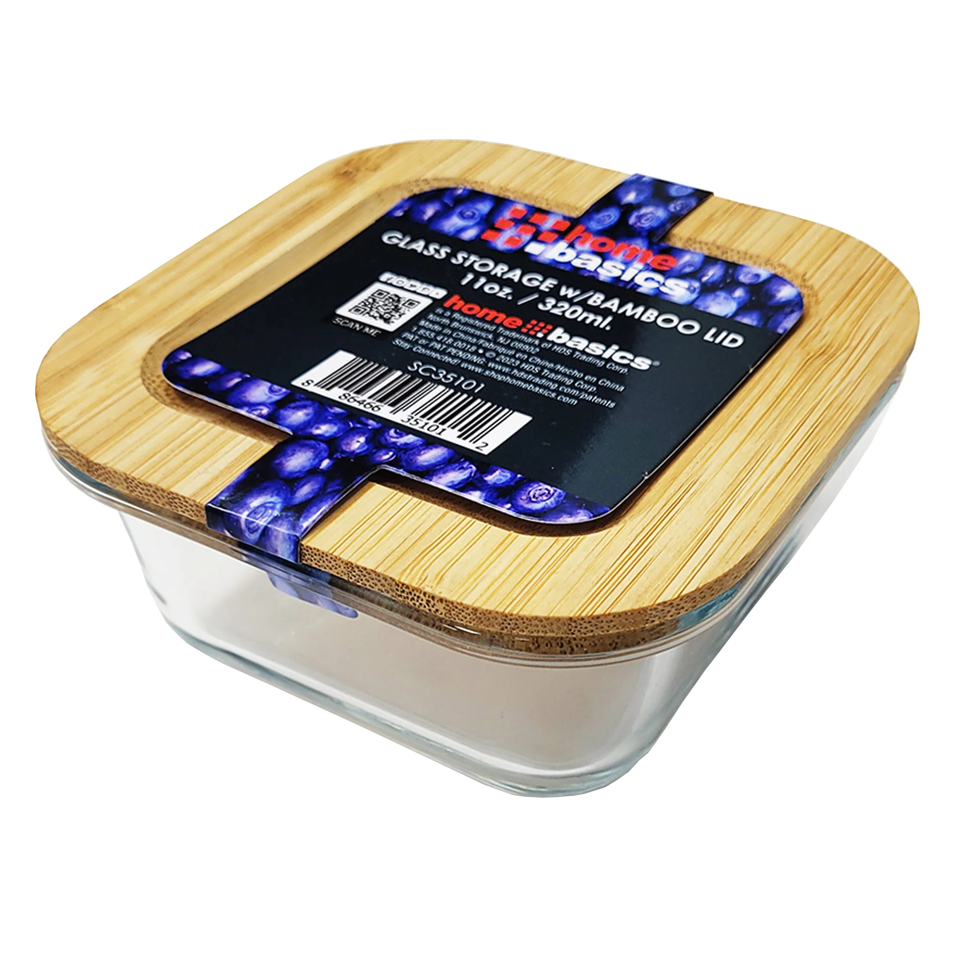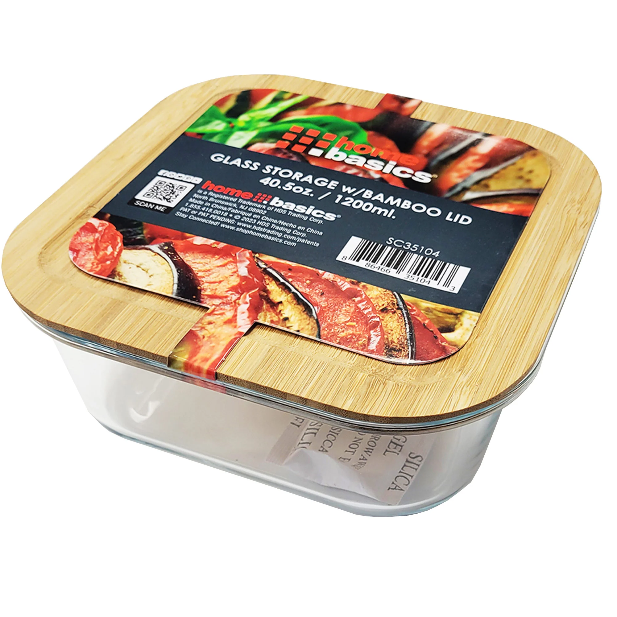 Efficiently organize your kitchen with the Home Basics Glass Storage Container with Bamboo Lid. Available in four practical sizes�?1 ounces, 17.5 ounces, 27 ounces, and 40.5 ounces—these square-shaped containers combine functionality with style.