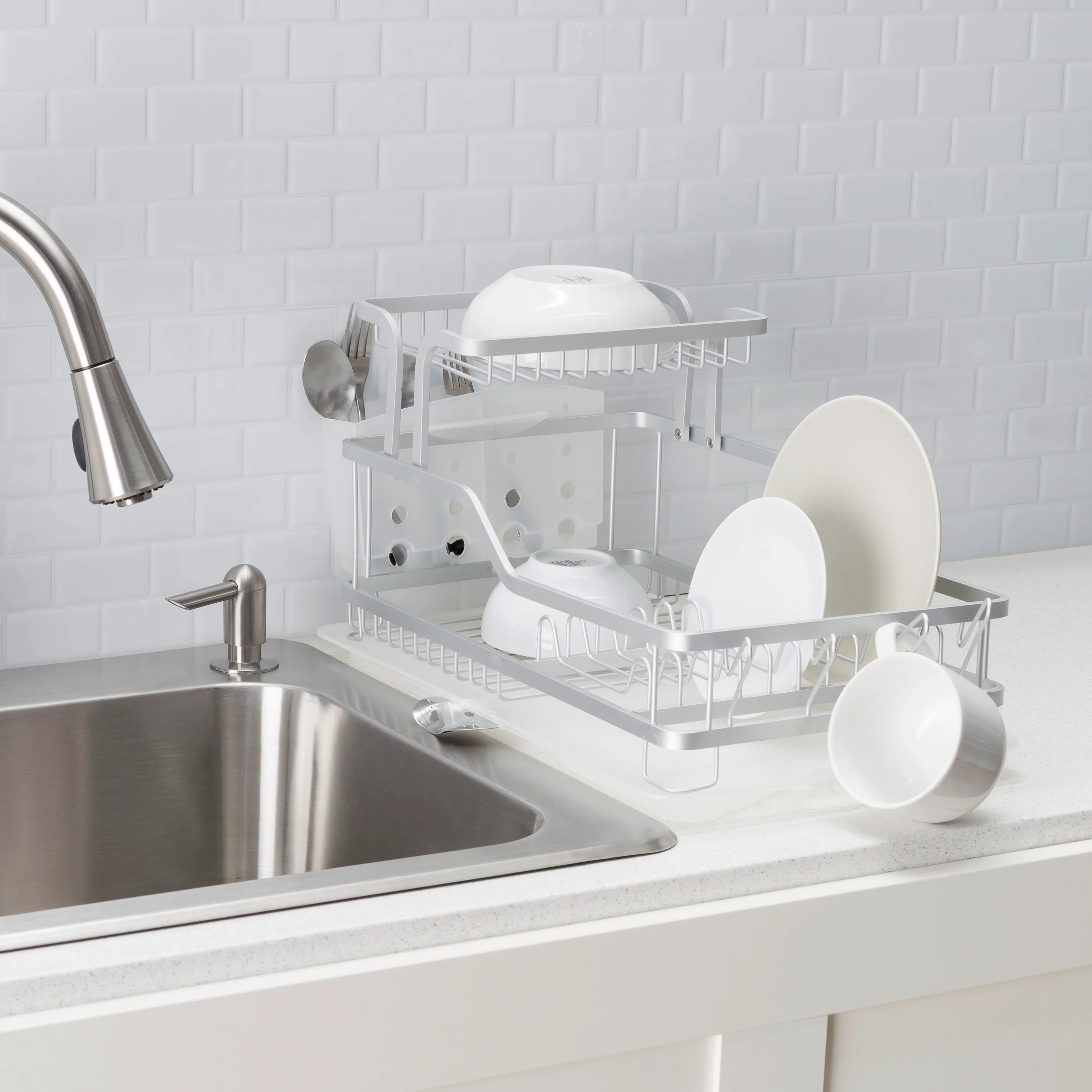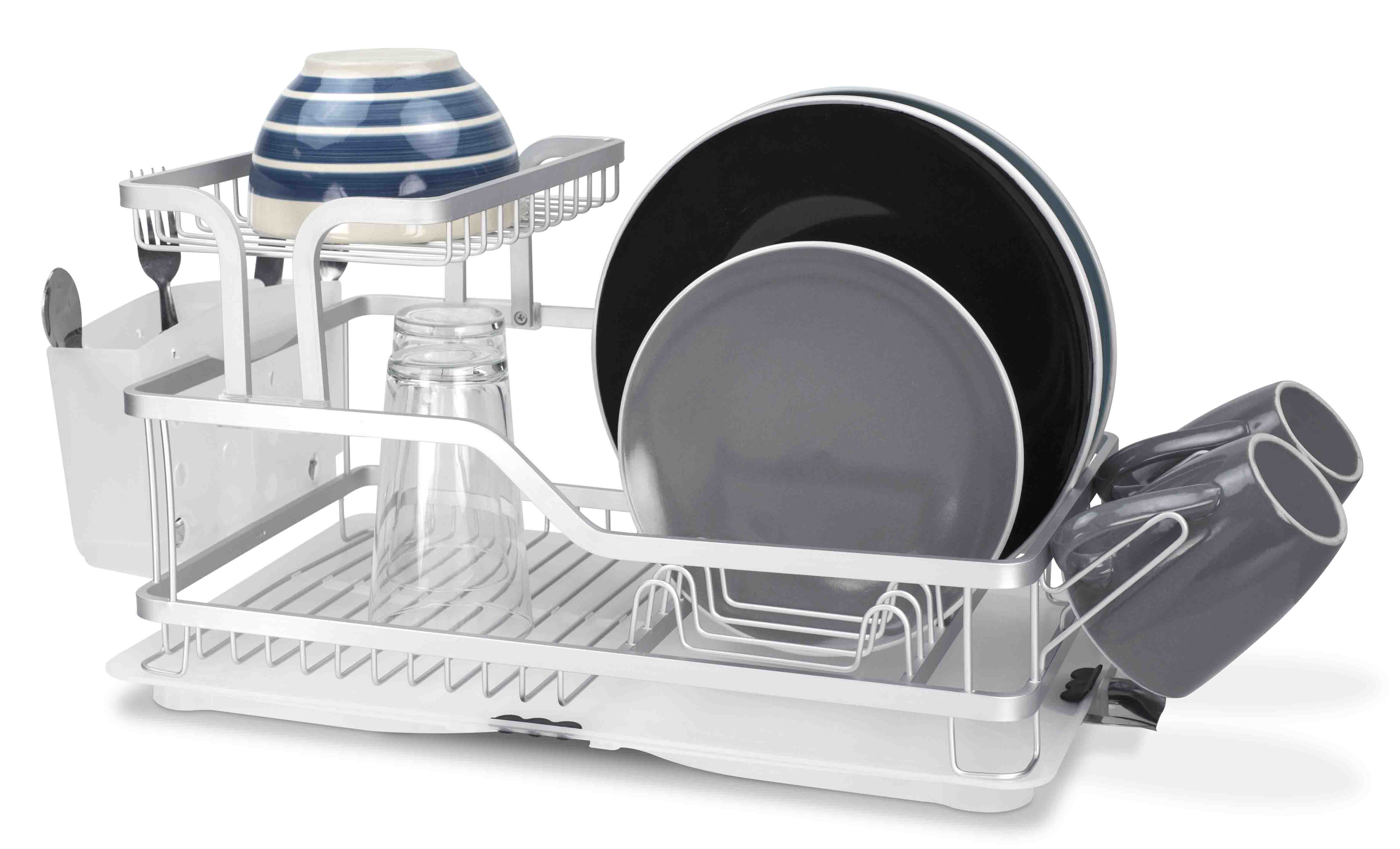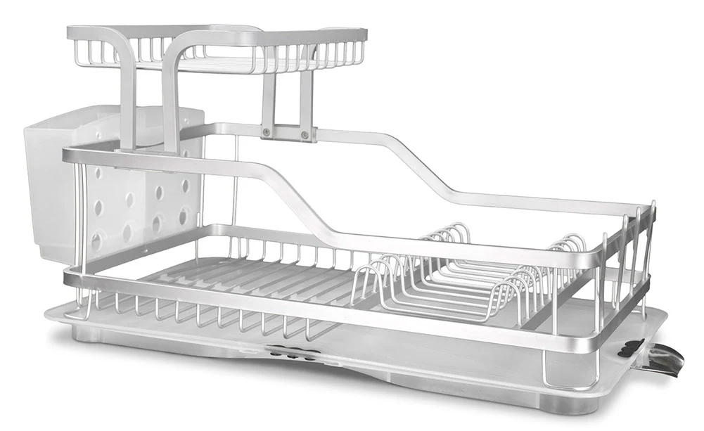 The Home Basics Rust-Proof Aluminum 2-Tier Dish Rack offers efficient and stylish dishware organization for your kitchen.