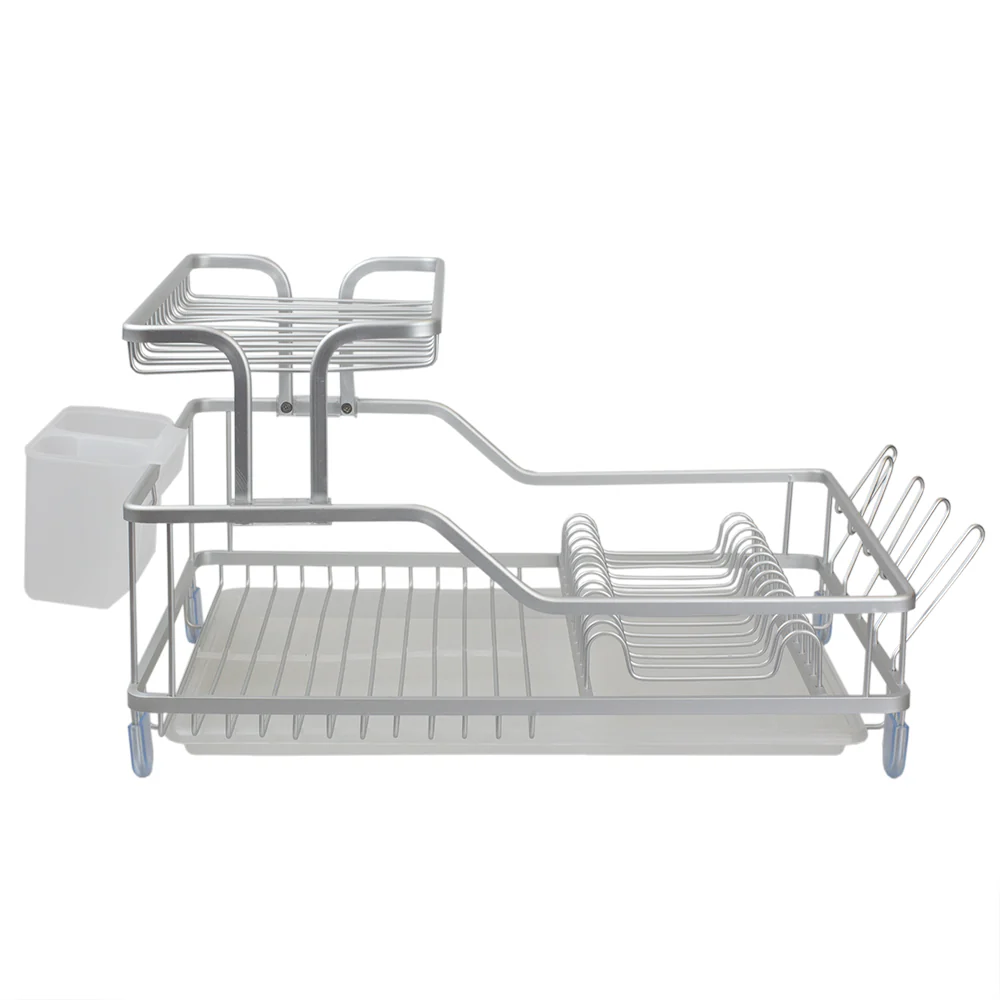 - Durable Construction: Crafted from rust-proof aluminum, this dish rack ensures long-lasting durability and resistance to corrosion. The premium plastic components, including the cutlery holder and tray, enhance its durability and functionality.