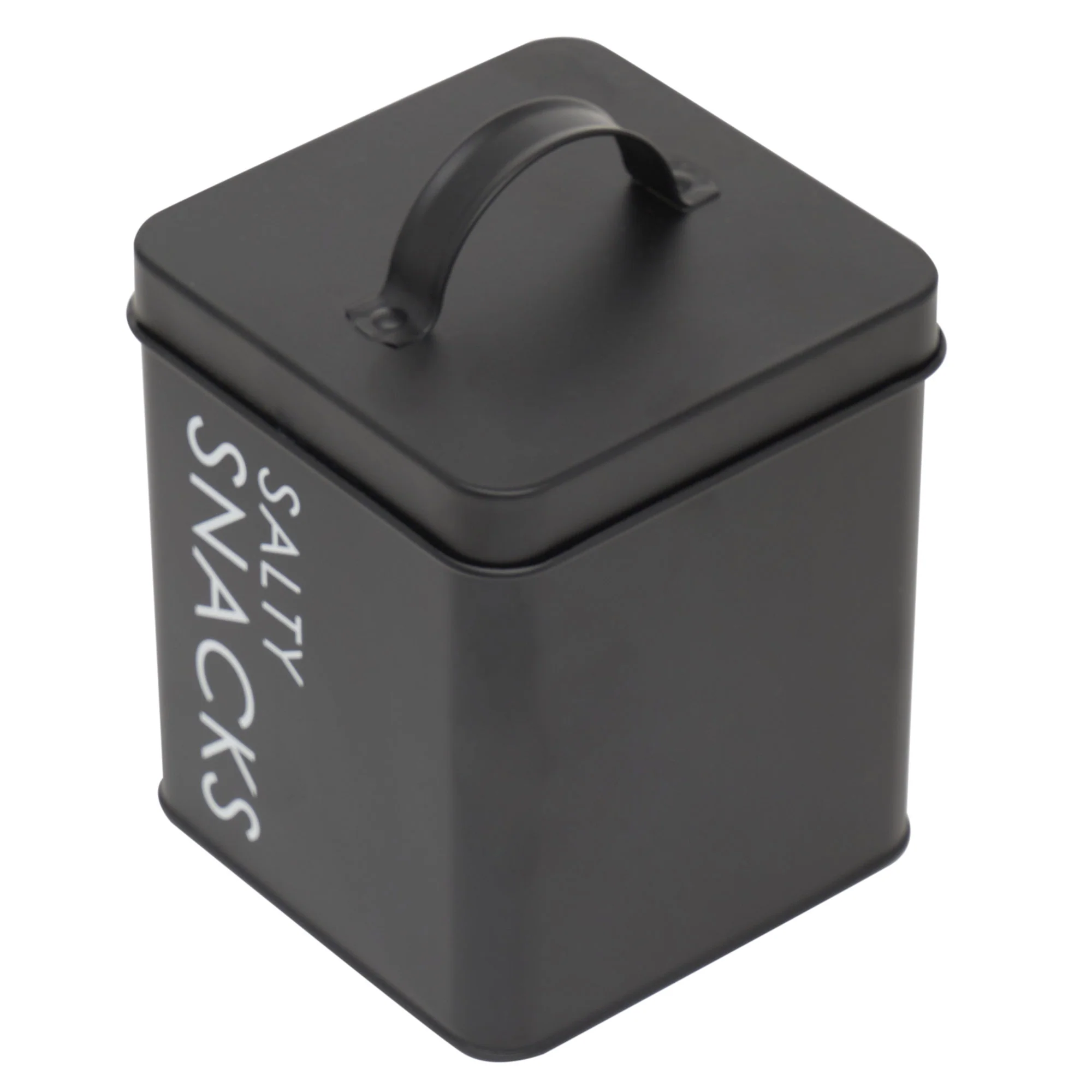 The Home Basics Tin Canister in Black, labeled "Salty Snacks," provides stylish and practical storage for your favorite treats. Measuring 4.5x4.5x5.5 inches, this small canister is perfect for keeping your salty snacks fresh and easily accessible.