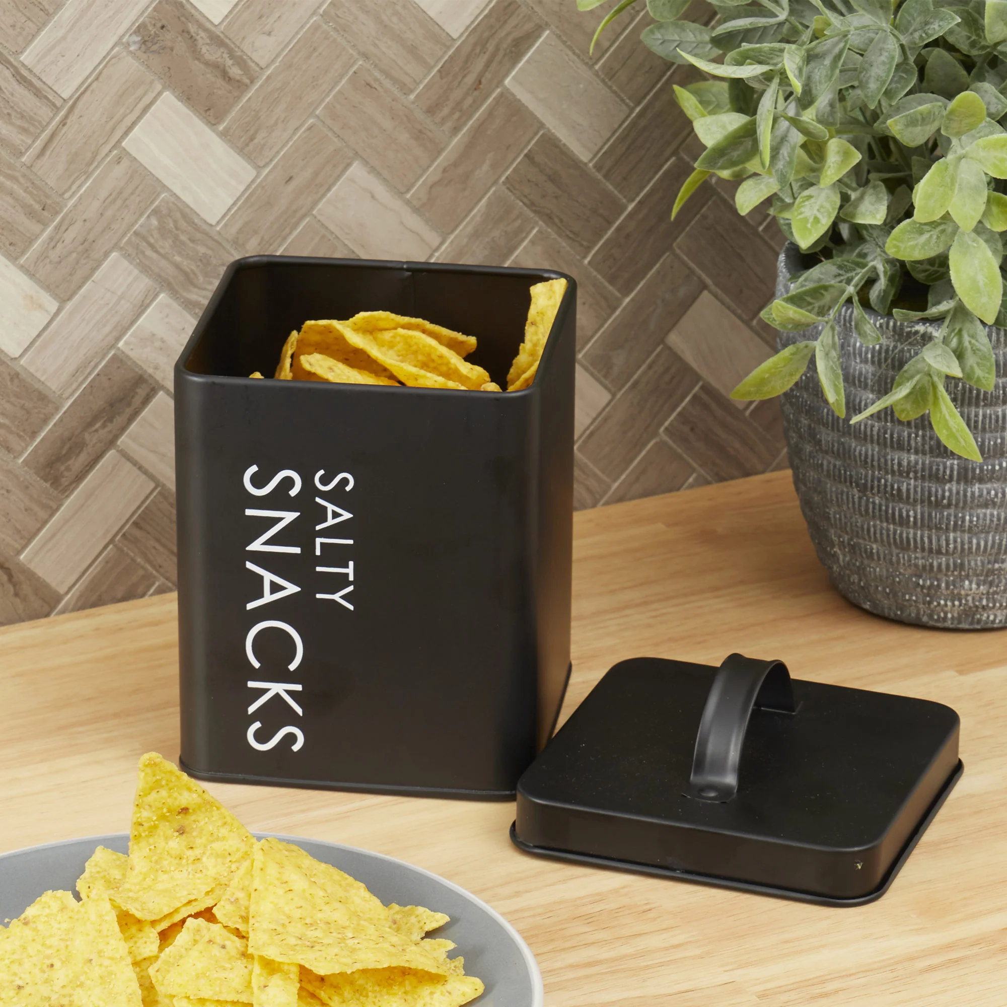 The Home Basics Tin Canister in Black is a practical and stylish solution for organizing and storing your salty snacks. Keep your kitchen tidy and your treats within reach with this compact and functional canister.