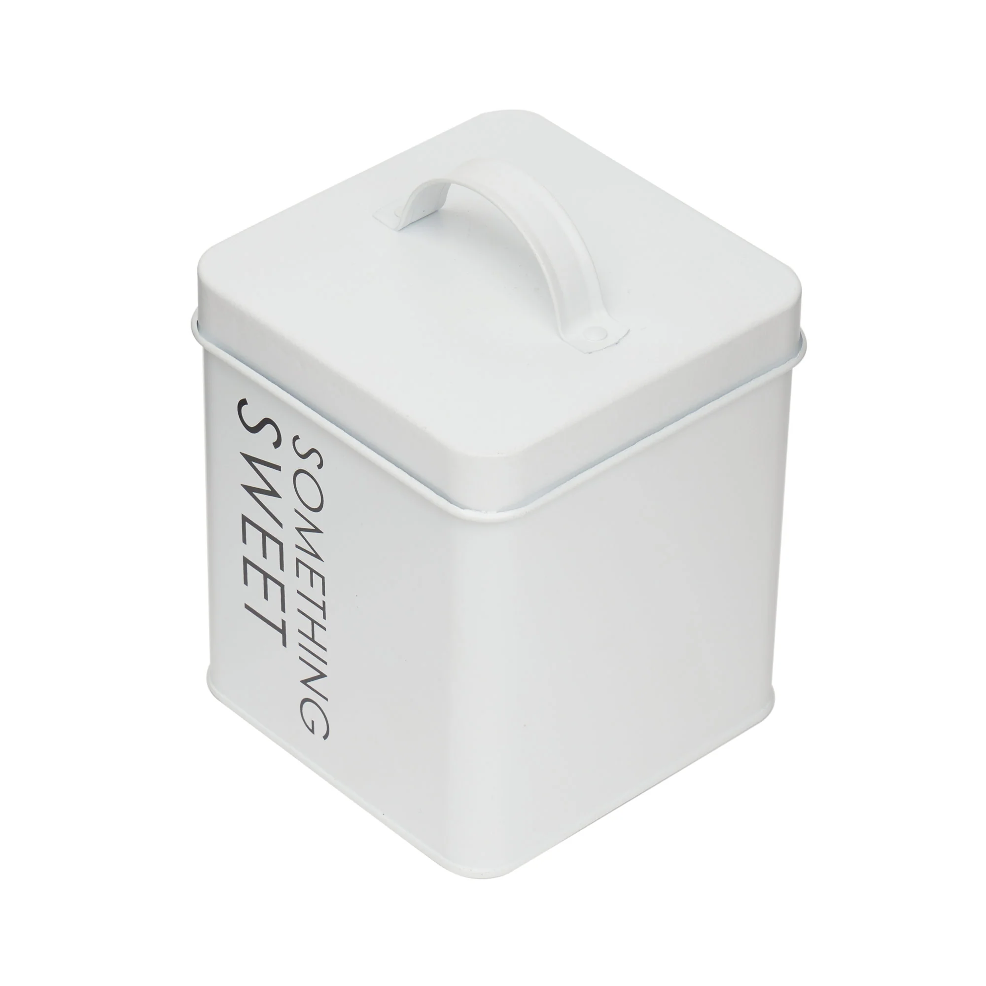 The Home Basics Tin Canister in White, labeled "Something Sweet," is a charming addition to your kitchen decor, offering practical storage for your favorite confections. With dimensions of 4.5x4.5x5.5 inches, this small canister fits perfectly on countertops or shelves.
