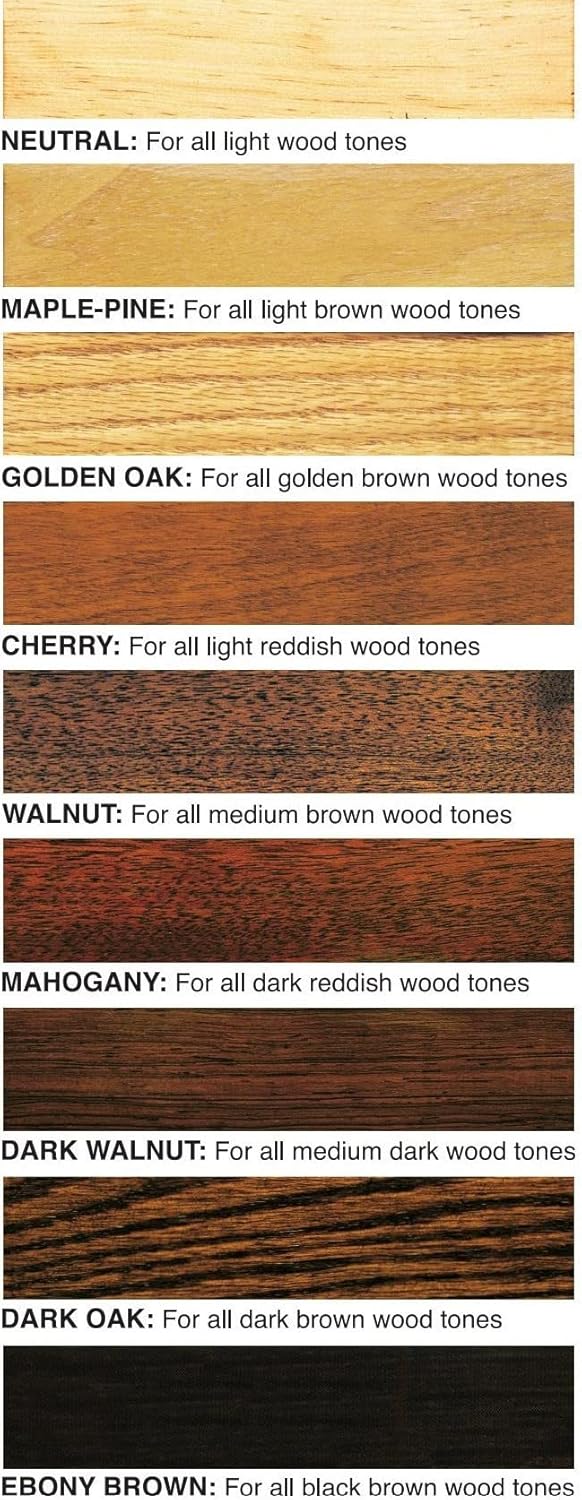 - Available in nine colors to match almost any wood finish tone; Neutral, Maple-Pine, Golden Oak, Cherry, Walnut, Mahogany, Dark Walnut, Dark Oak, and Ebony Brown