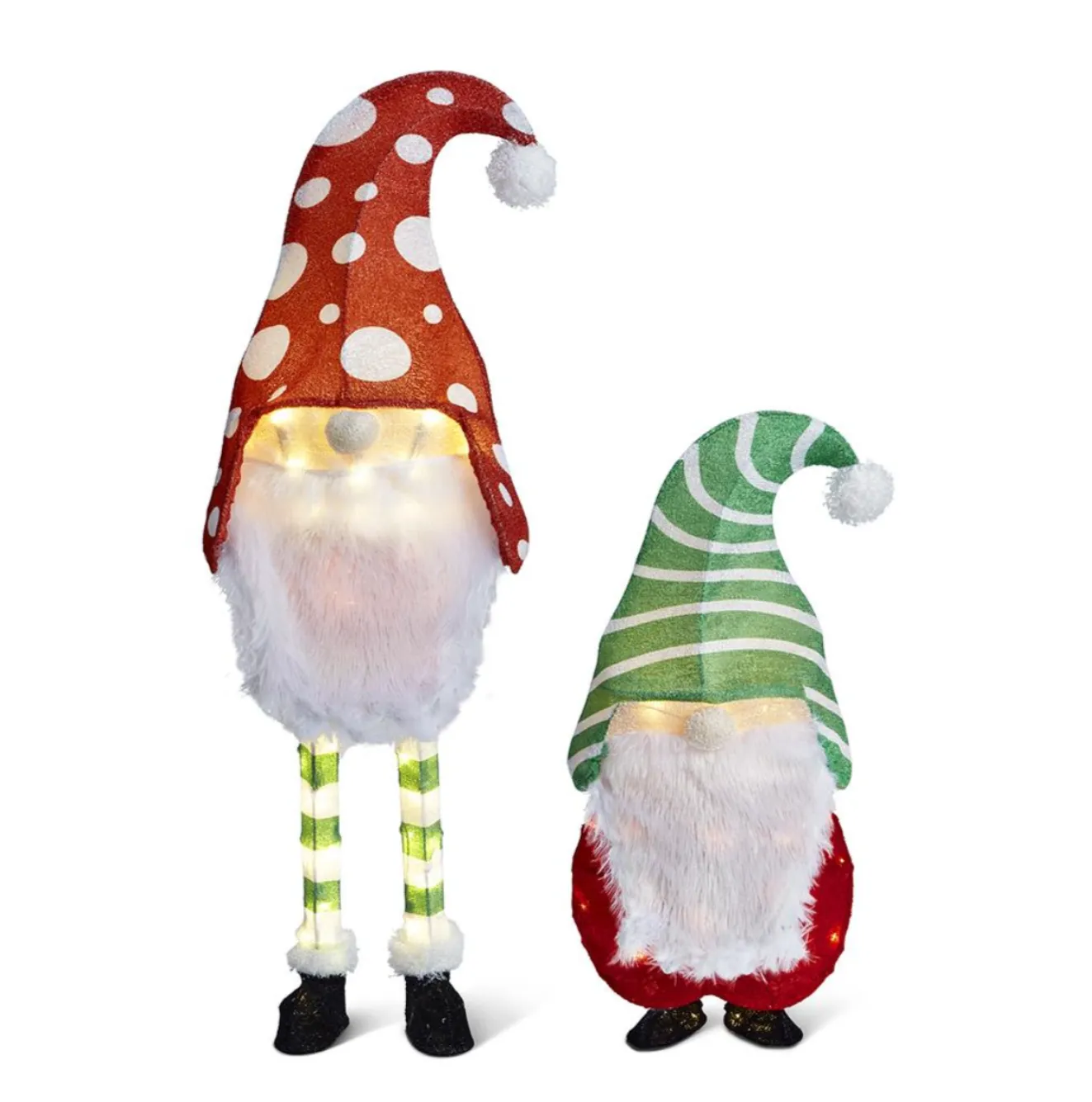 Each colorful little fellow is illuminated with warm white LEDs to brighten your yard. One of the gnomes sports a cheerful red polka dot stocking cap over his full snow-white beard, while his shorter brother dons a green striped hat. Both gnomes are constructed from durable prelit metal frames covered by weatherproof fabric.