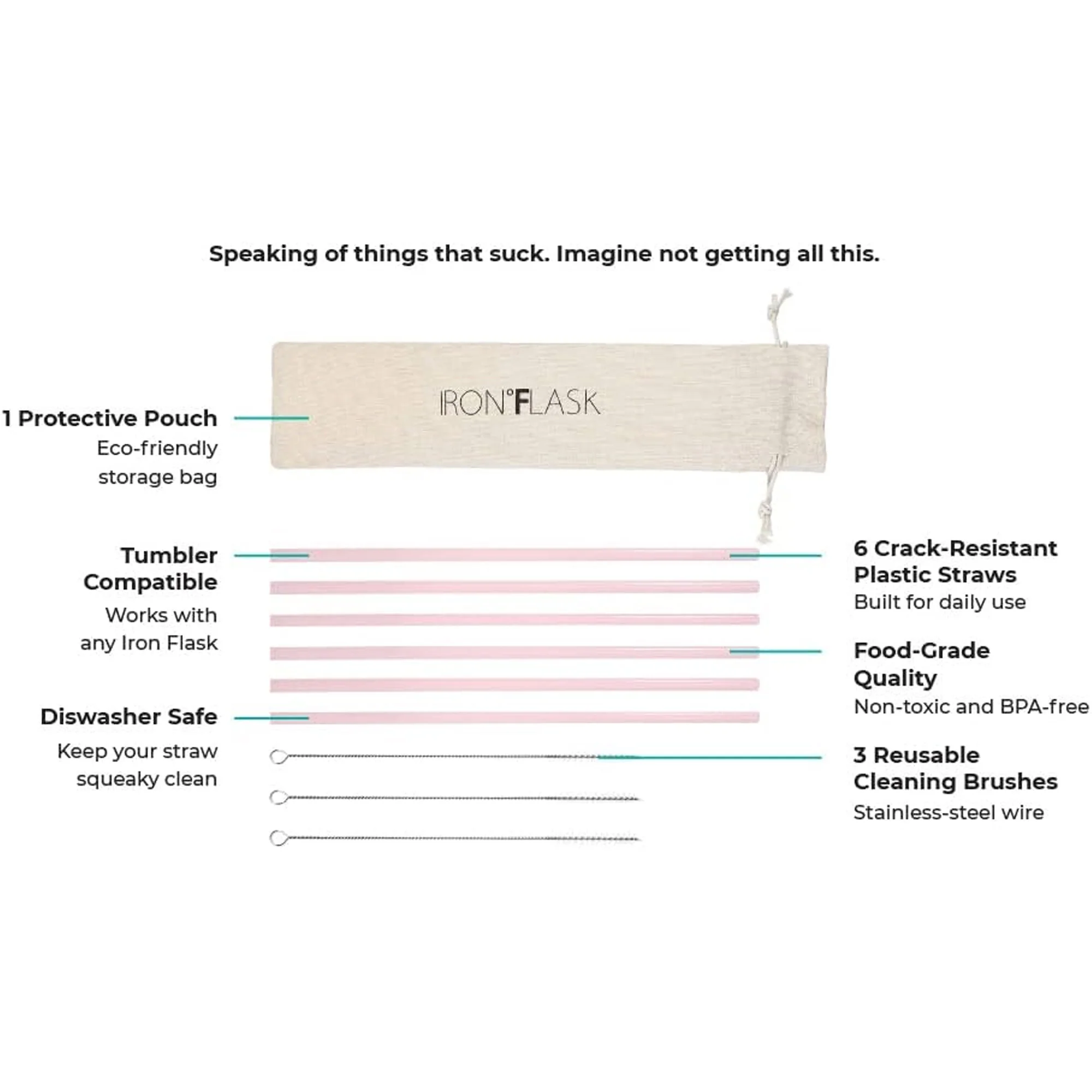 Ditch Plastic, Sip in Style: IRON °FLASK Reusable Straw Kit! Save the turtles and upgrade your drinkware with the IRON °FLASK Reusable Straw Kit! This eco-friendly set features six colorful, plastic straws with bendy silicone tips, perfect for sipping on the go without the guilt.