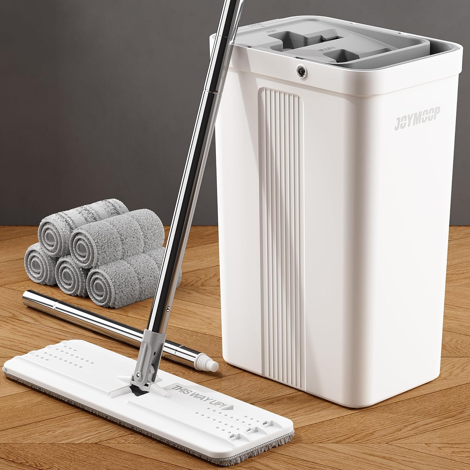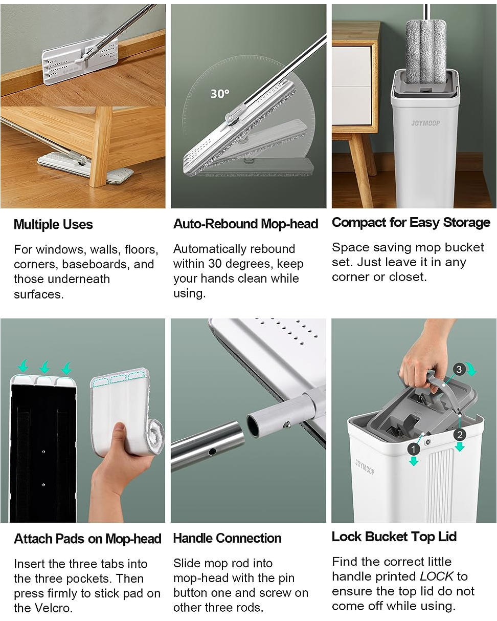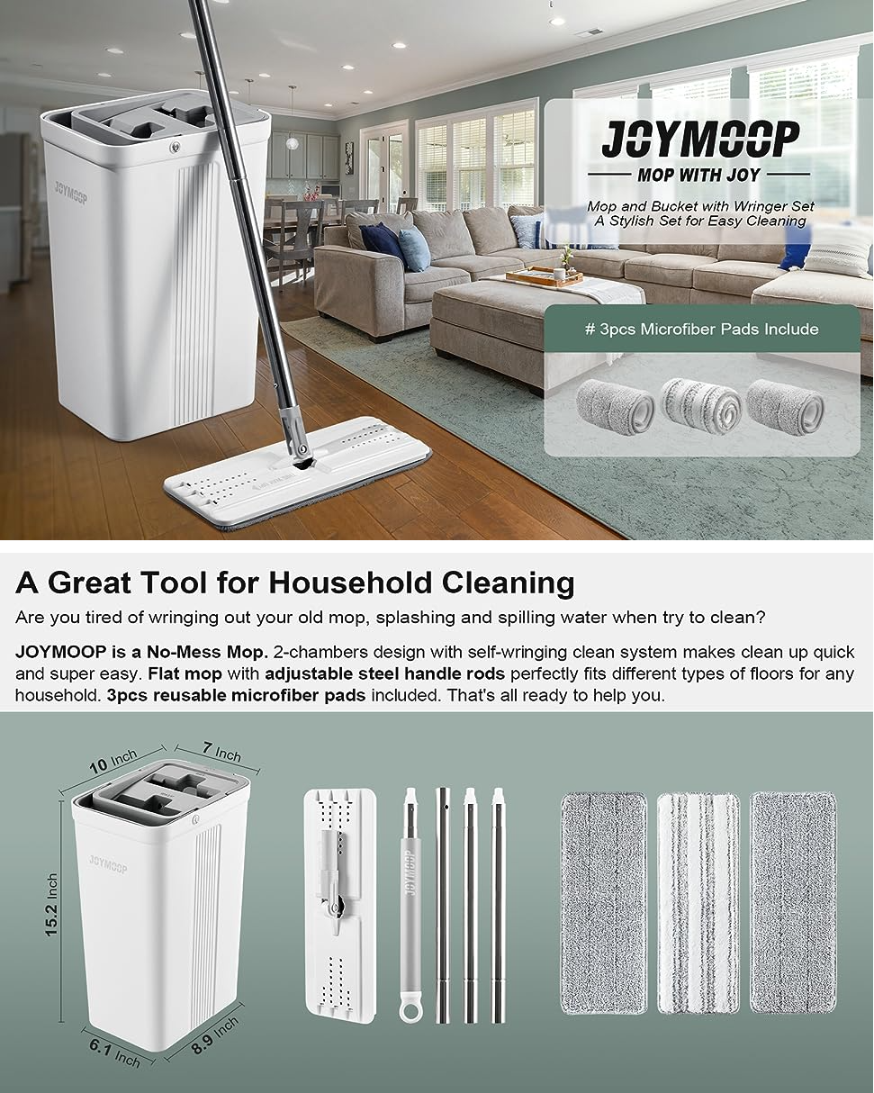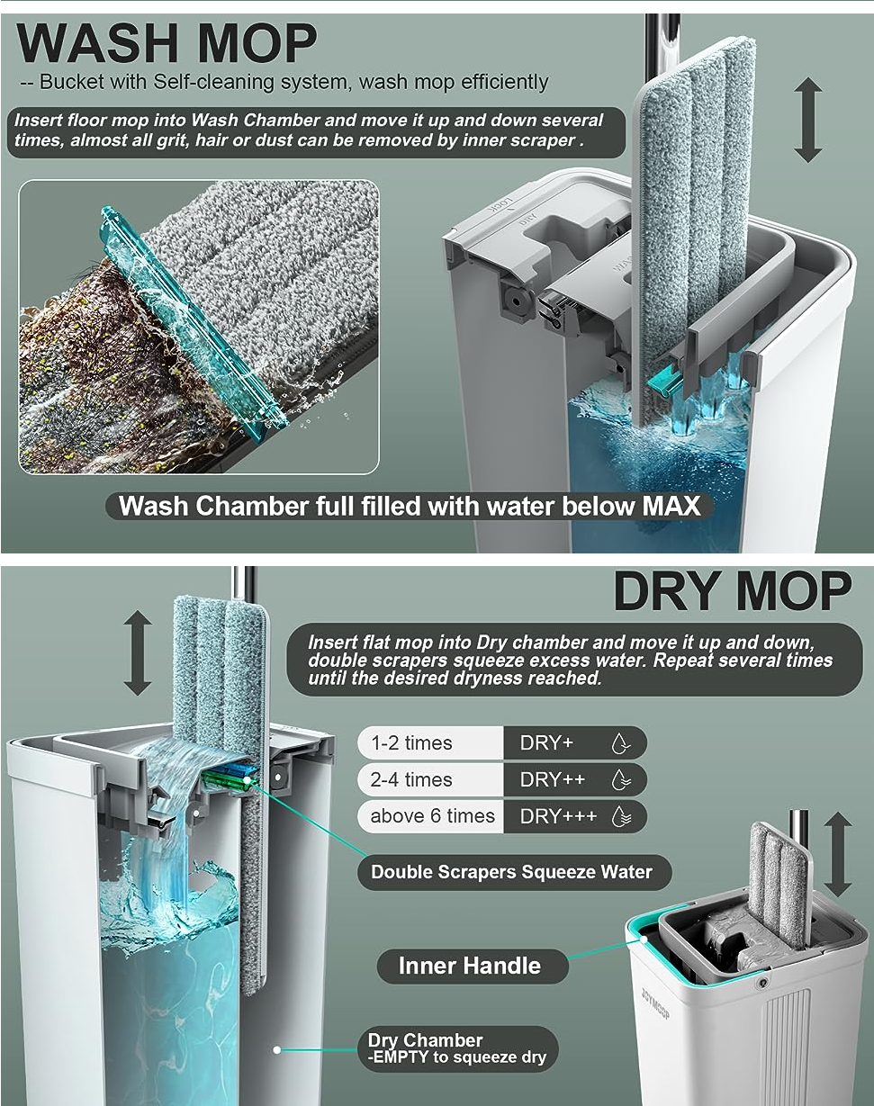- [HOUSEHOLD CLEANING TOOL] JOYMOOP mop and bucket with wringer set, 2 chambers of mop bucket, WASH and DRY, scratch dirt away in WASH chamber, squeeze out of water in DRY chamber, without hands cleaning. !NOTE:PLEASE WET MOP to avoid hard-insert Problem!