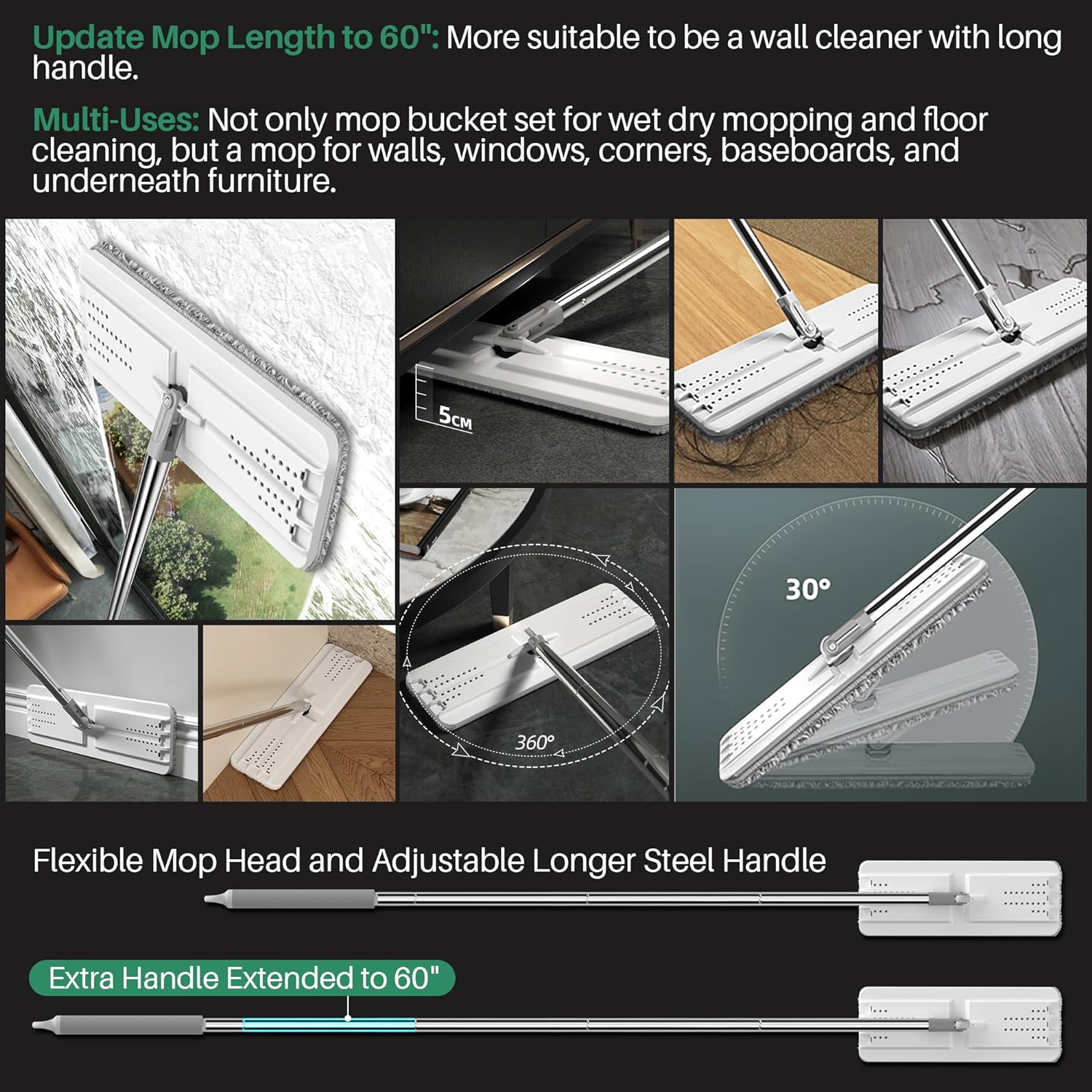 - [MOPS FOR FLOOR CLEANING] With 360° rotation mop head, it can reach to wall, any corners and those "under-the-whatever" places. And adjustable Stainless Steel Handle can be extended from 26.5 to 50.0 inches, do mopping with your whole family members by this Clean Home Mop.