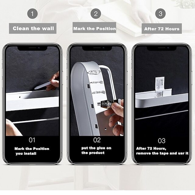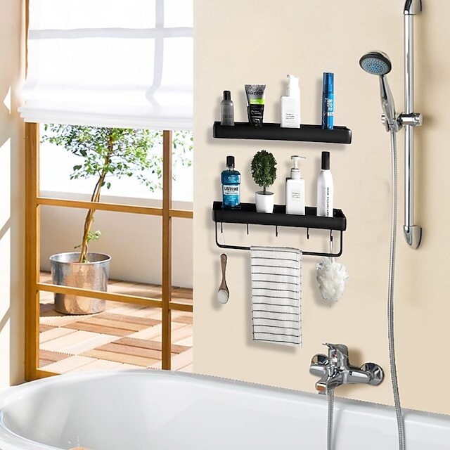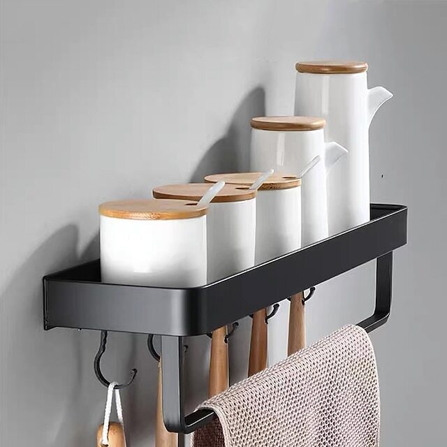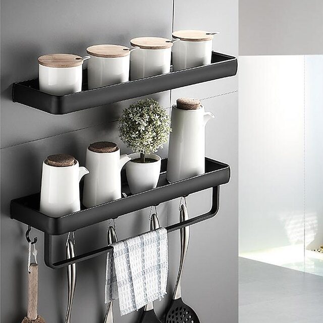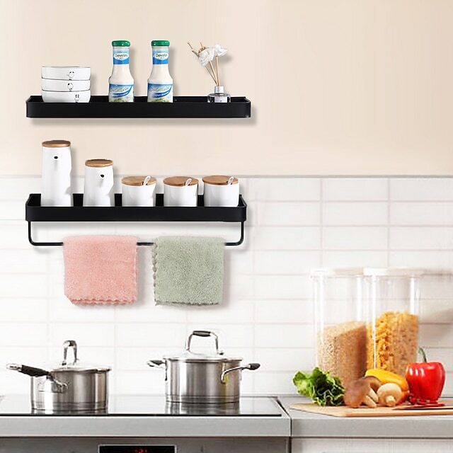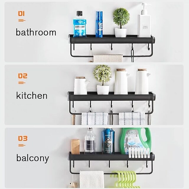 • 2. Additional Storage On The Wall: In the bathroom, the storage shelf can hold skincare items such as shampoo, conditioner, shower gel, lotions, and perfumes. In the kitchen, the shelf can be used to put spice and seasoning bottles, the towel holder can be used to hang towels or kitchen hooks to hang kitchenware. It also can be used in the dining room, bedroom, living room, and office.