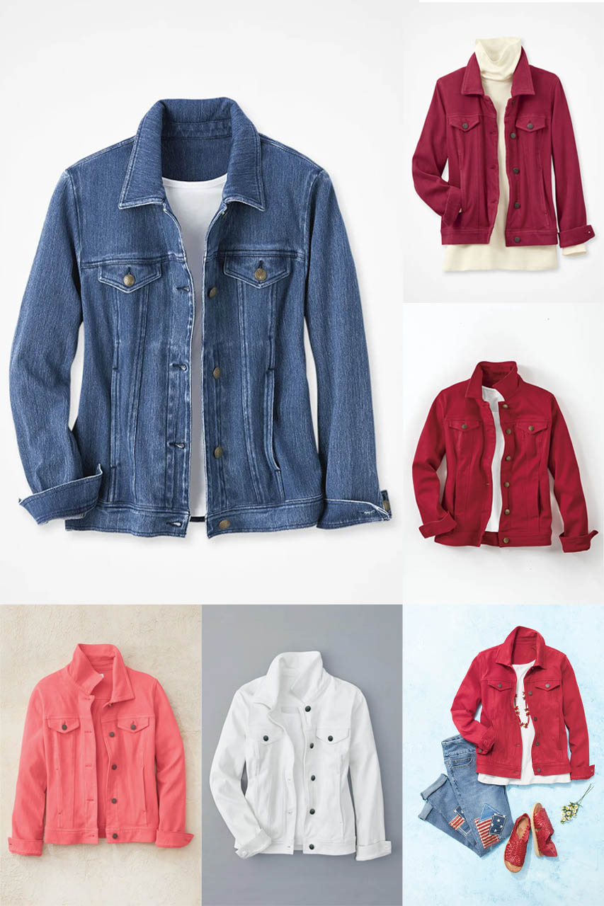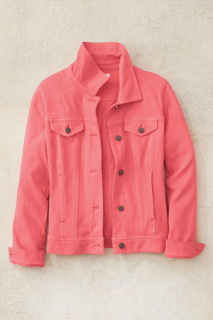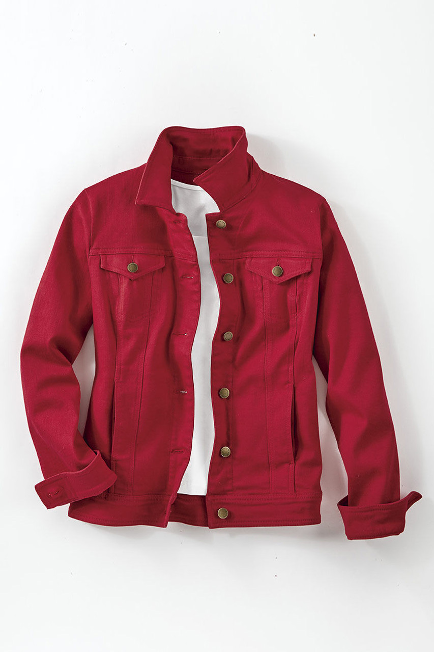 Comfortable, stretchy knit denim for all-day ease. Seamed front and back panels and front and back yokes, plus flap and on-seam pockets. Button front. Imported.