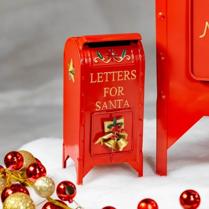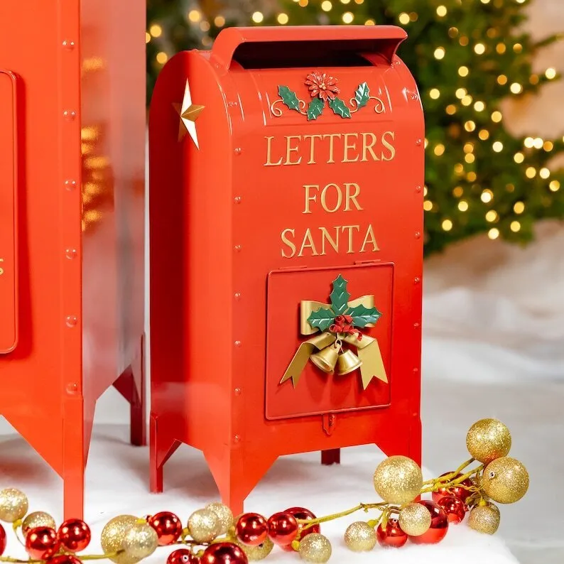 - Indoor/Outdoor - Weather & rust resistant - Powder coated iron - Hand painted in glossy red finish with gold accents - Removable jingle bells and holly - Real mail slots with lockable storage compartment - Sturdy yet lightweight - Freestanding (four legs)