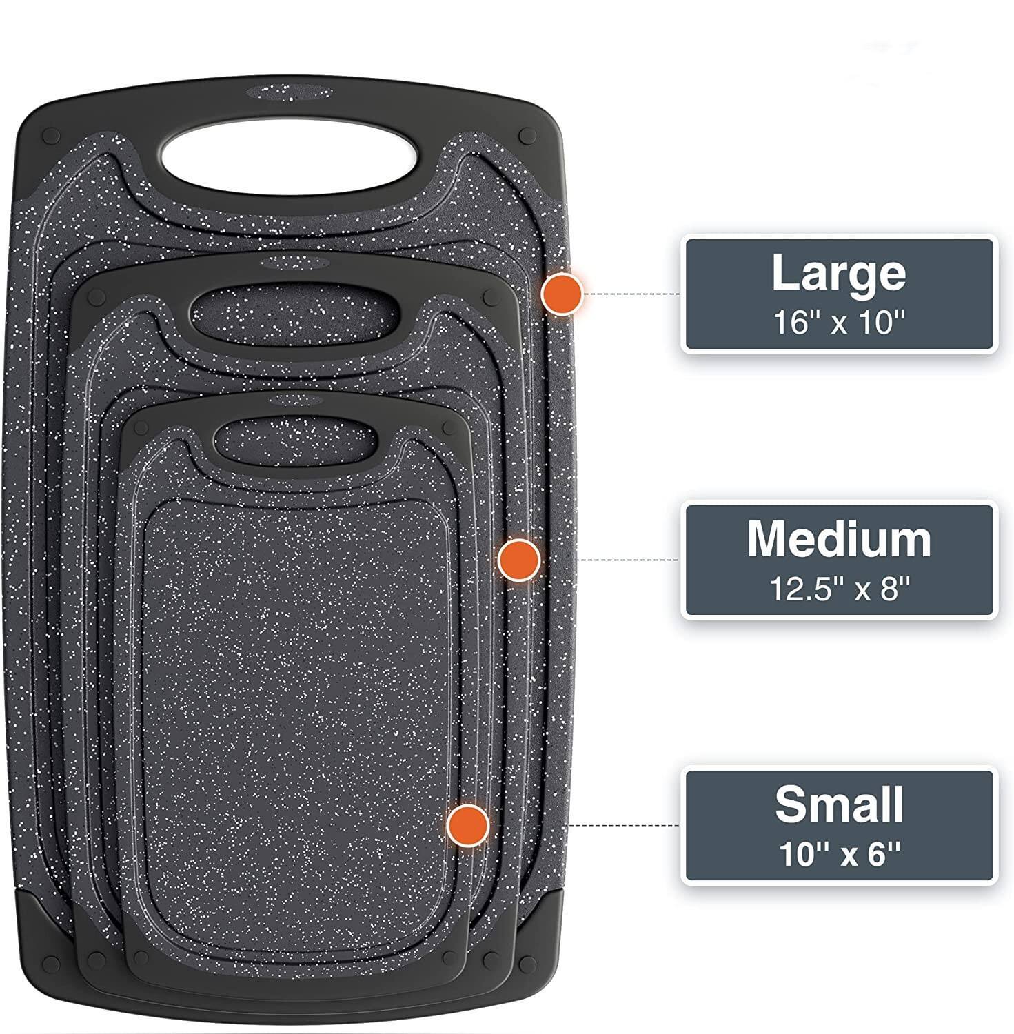 - Our Most Popular Set - 3 Chef Selected Sizes: Professional chefs and your family favorite cook agree that these dishwasher-safe cutting boards with juice groove combine the best of all worlds; a 10”x6” small cutting board for kitchen crumb defense, a 12.5”x 8” medium-large cutting board for prepping larger vegetables and meats, and a 16”x10” extra large cutting board; made for carving during memory-making get-togethers.