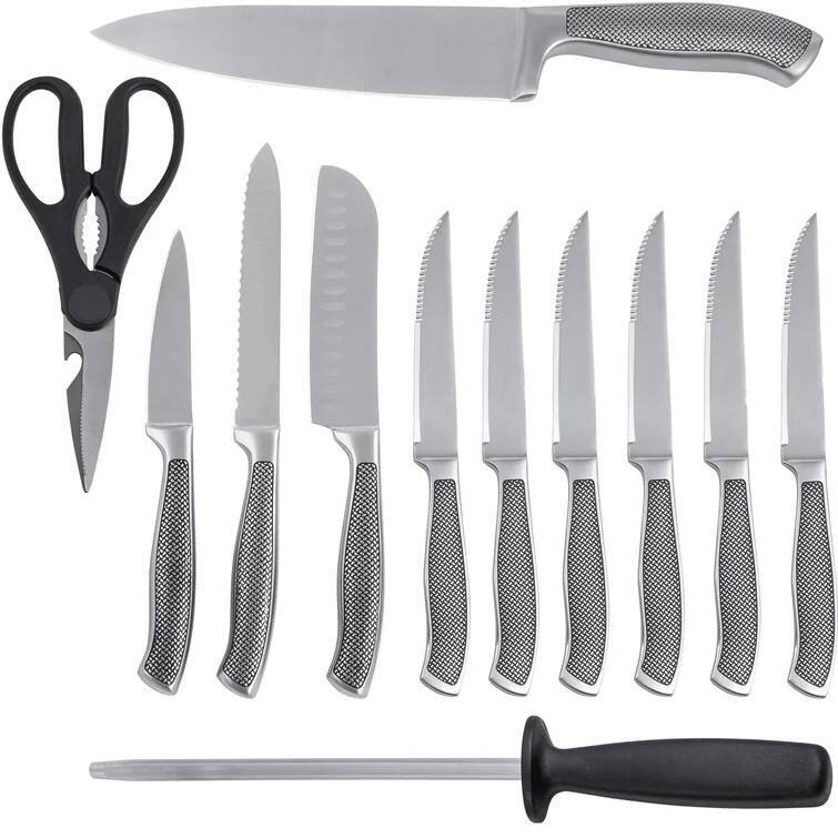 13 -Piece Block Set includes: 1 Chef knife (8-in.), 1 Santoku knife (5-in.), 1 Serrated utility knife (4.5-in.), 1 Parer (3.5-in.), 6 Steak knives (4.5-in.), 1 Pair of shears (8-in.), 1 Sharpener (8-in.), 1 Black block for storage