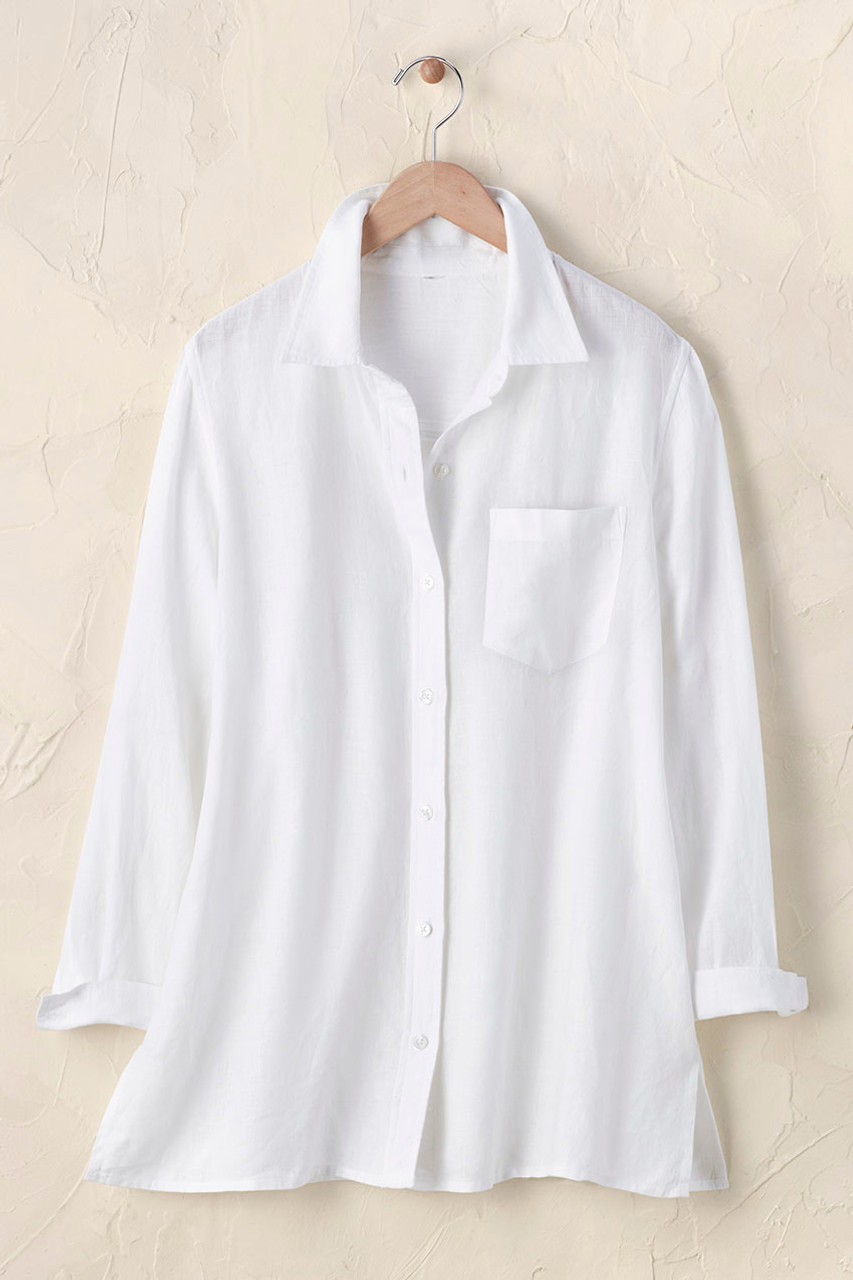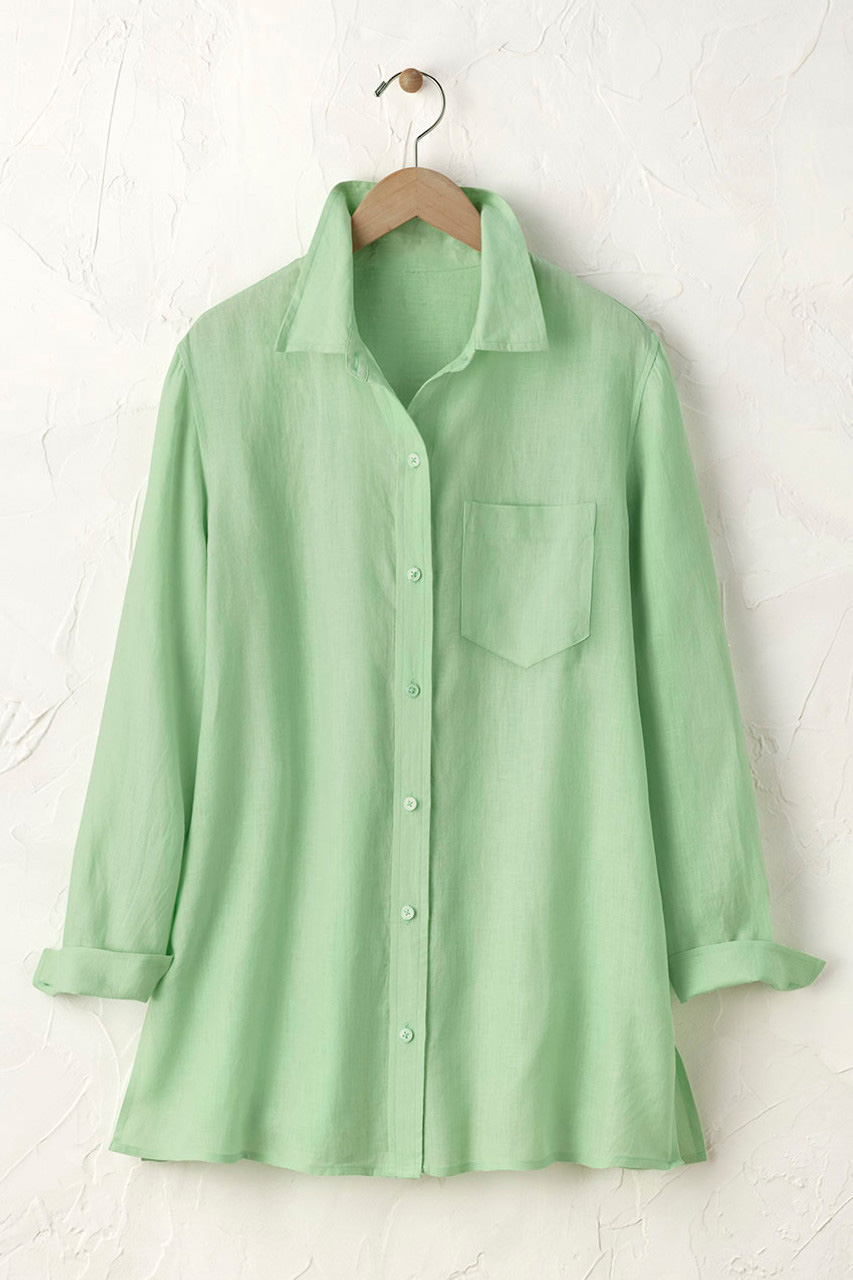 The lightweight big shirt you love, in European-grown linen – updated with a roomier fit, long sleeves and a great longer length. So it’s even easier to toss on as a top layer. or wear solo. Pleated back yoke, single chest pocket, side-slit hem.