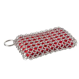 - Durable stainless steel chainmail designed to clean Lodge Cast Iron and Carbon Steel cookware