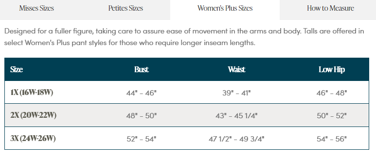 - Body Length: Misses (26" long); Petites (25"); Women’s (28")