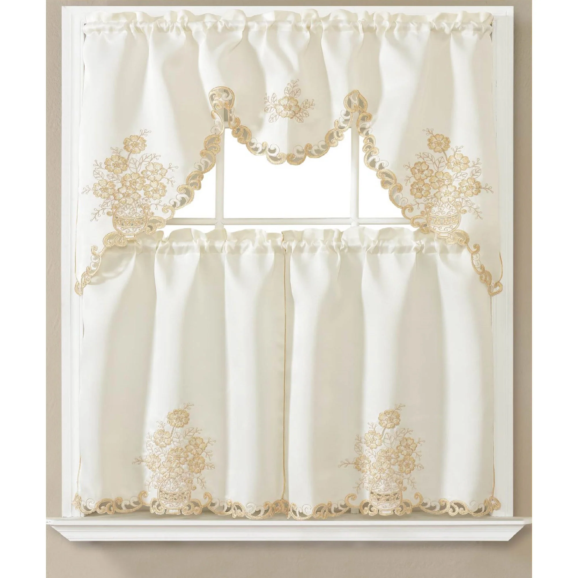 Lucy Lights Up Your Kitchen: Luxurious Satin in Two Warm Choices! Tired of boring kitchen windows? Infuse your space with warmth and charm with the Lucy 3-Piece Kitchen Curtain Set! This glamorous set features a dramatic swag (60" x 36") and two stylish tiers (30" x 36" each), all adorned with beautiful embroidery on a luxuriously soft satin base. Choose between two inviting color combinations: Beige and Gold for a touch of timeless elegance, or Beige and Burgundy for a richer, more sophisticated look. Both options are crafted from easy-care polyester, making them as practical as they are beautiful.
