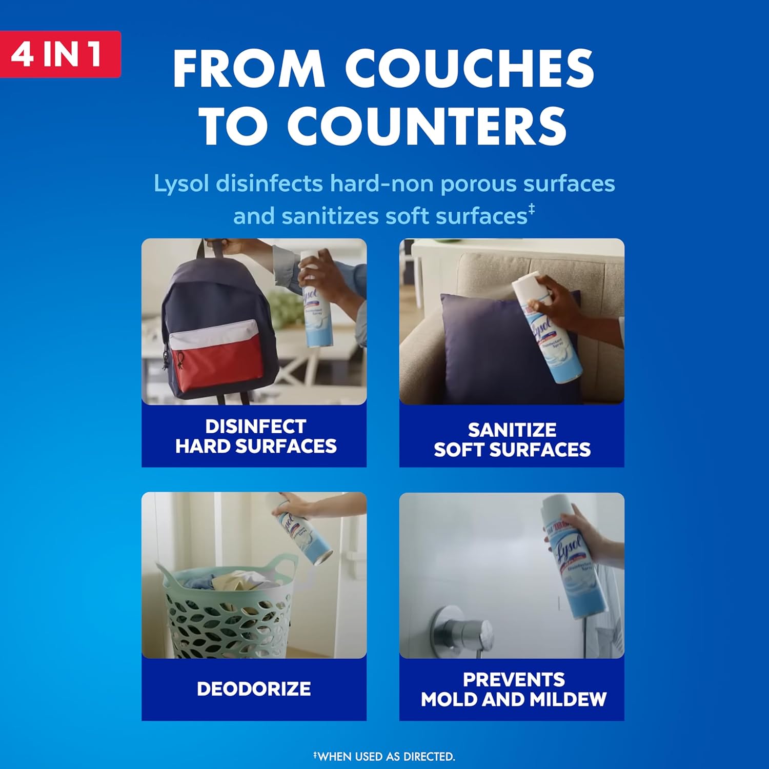 - FRESH SCENT: Lysol neutralizes tough odors and adds a fresh scent for up to 24 hours. Use this product daily to disinfect your soft surfaces. Leave behind a crisp linen scent, effectivley replacing odors and refreshing your space with a clean fragrance.