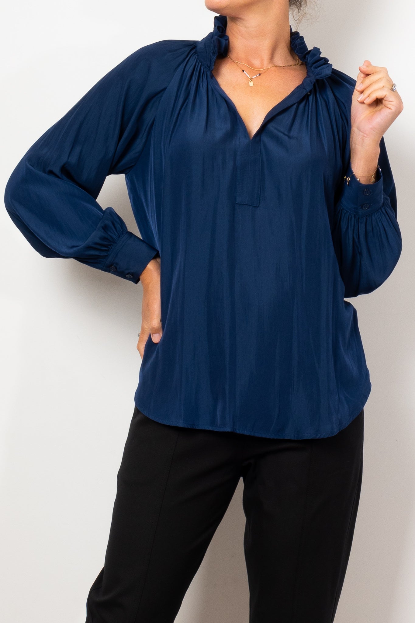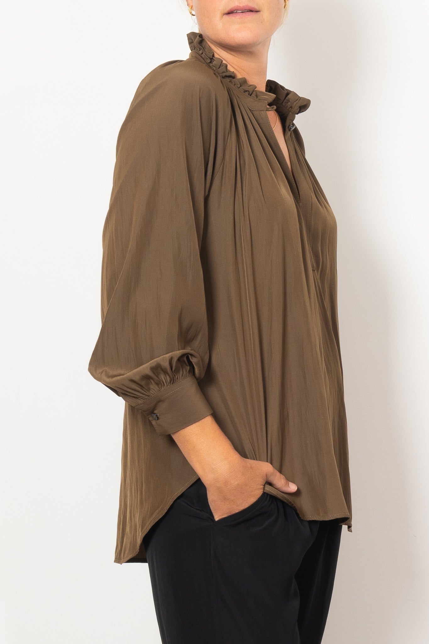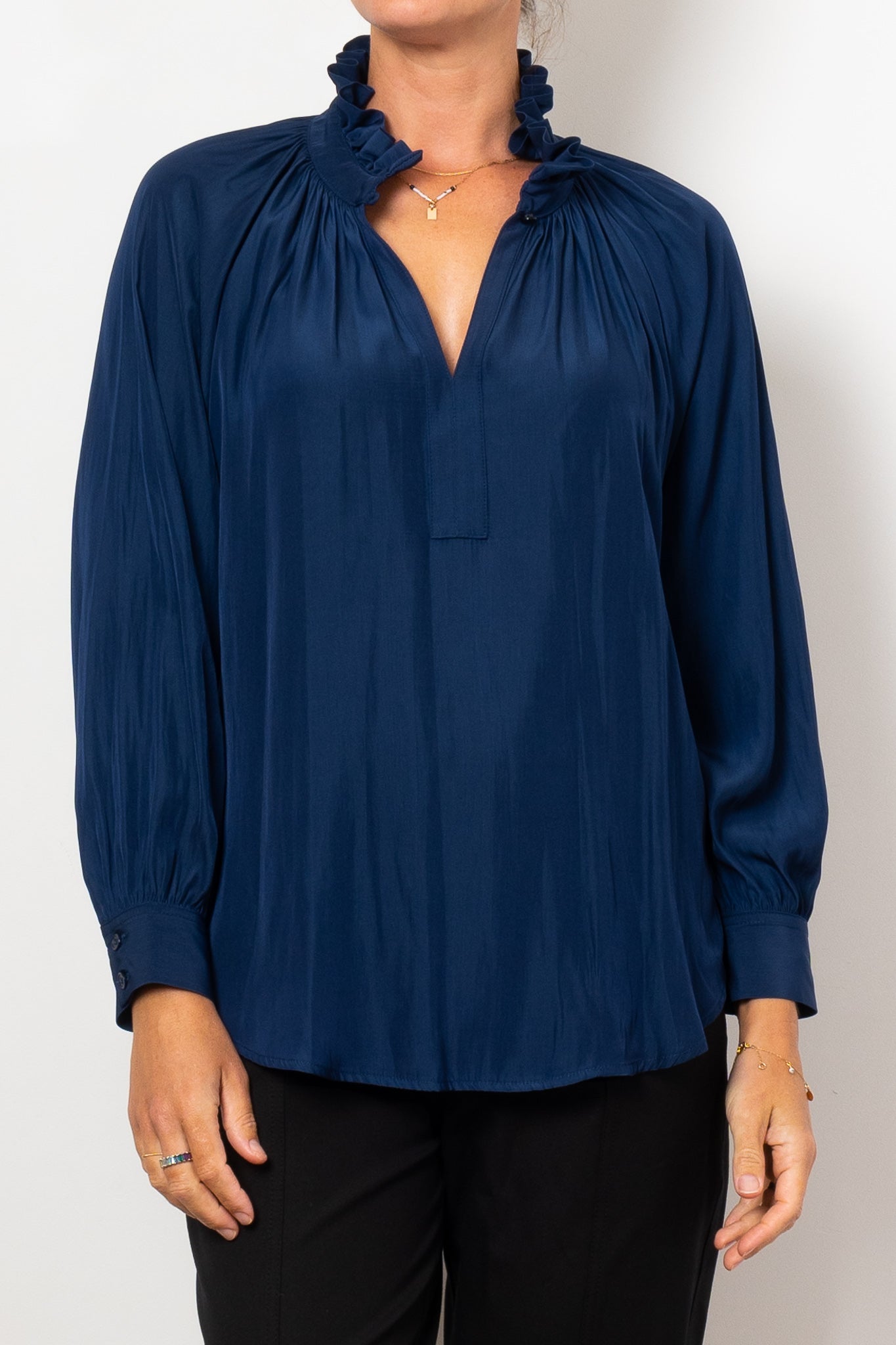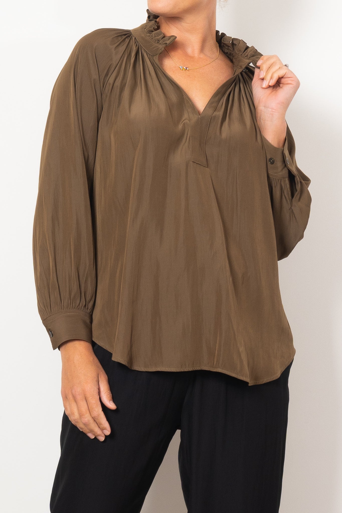 Introducing the Mela Purdie Fleur Blouse in Mache, crafted from luxurious, non-stretch Japanese fabric. This blouse features a relaxed fluidity and smooth lustre surface, perfect for adding an elegant touch to any outfit. With a feminine silhouette and full length button closure. Made with love in Australia.