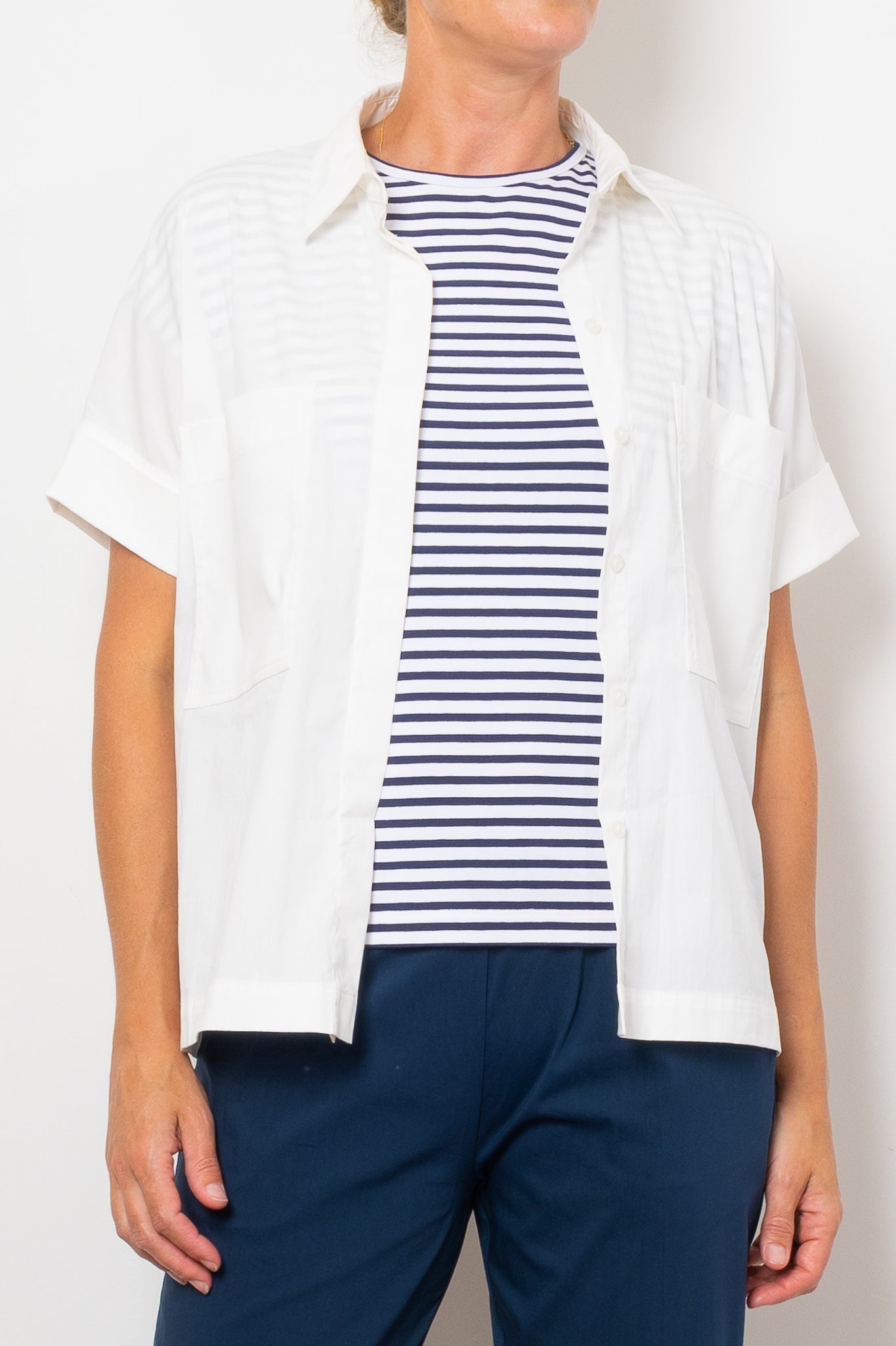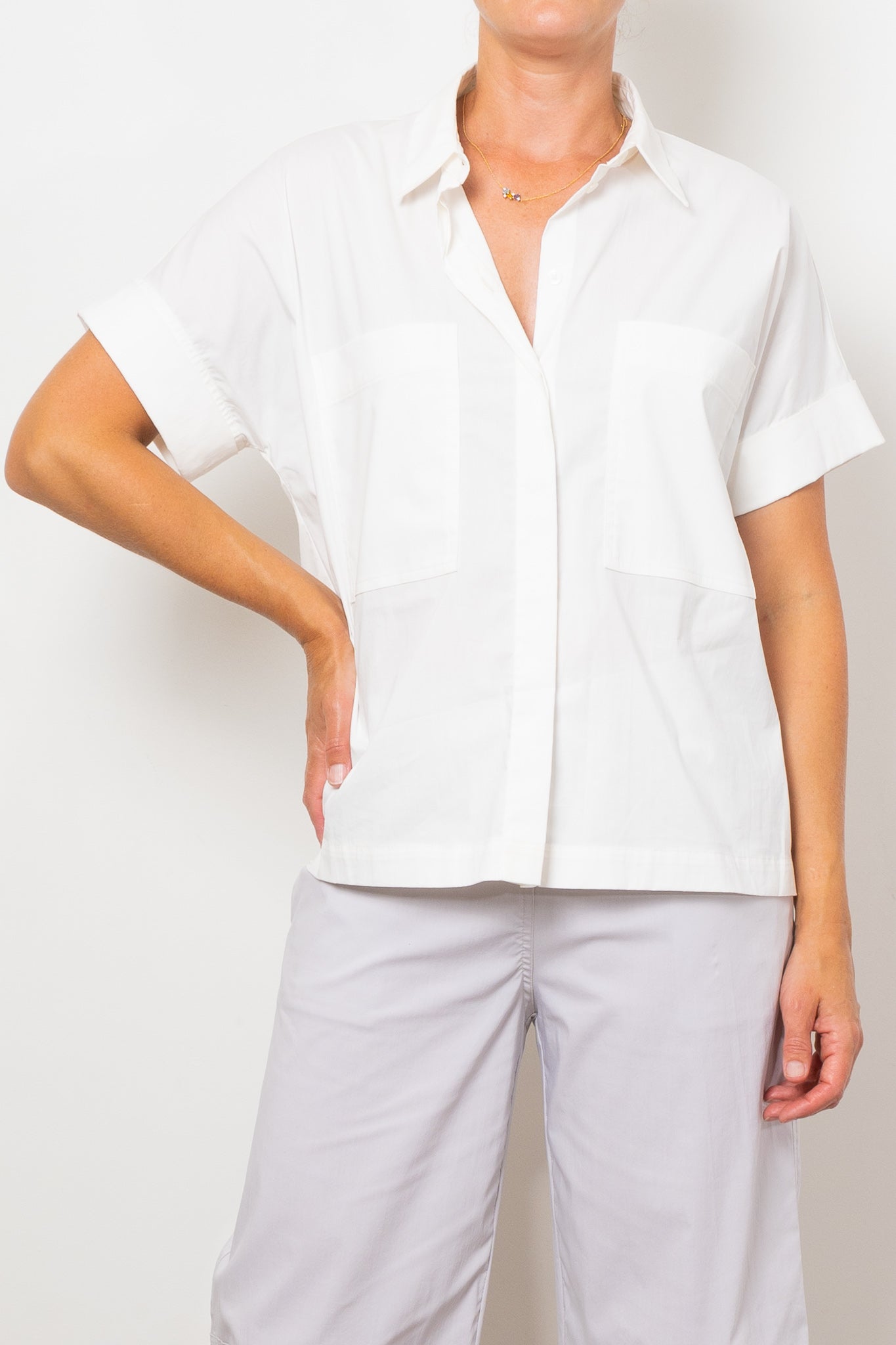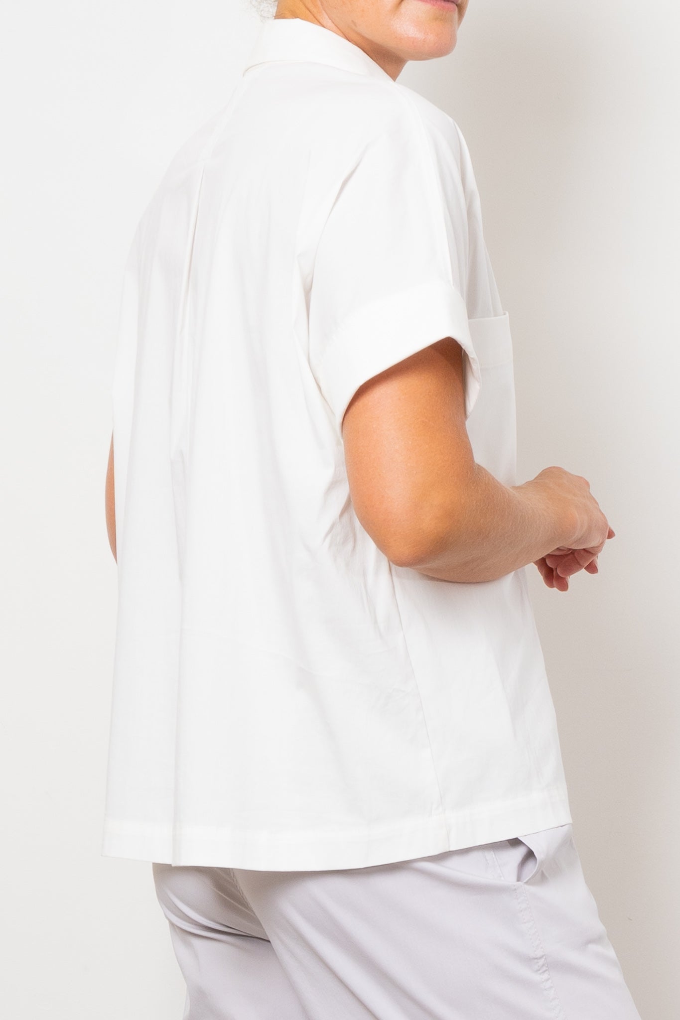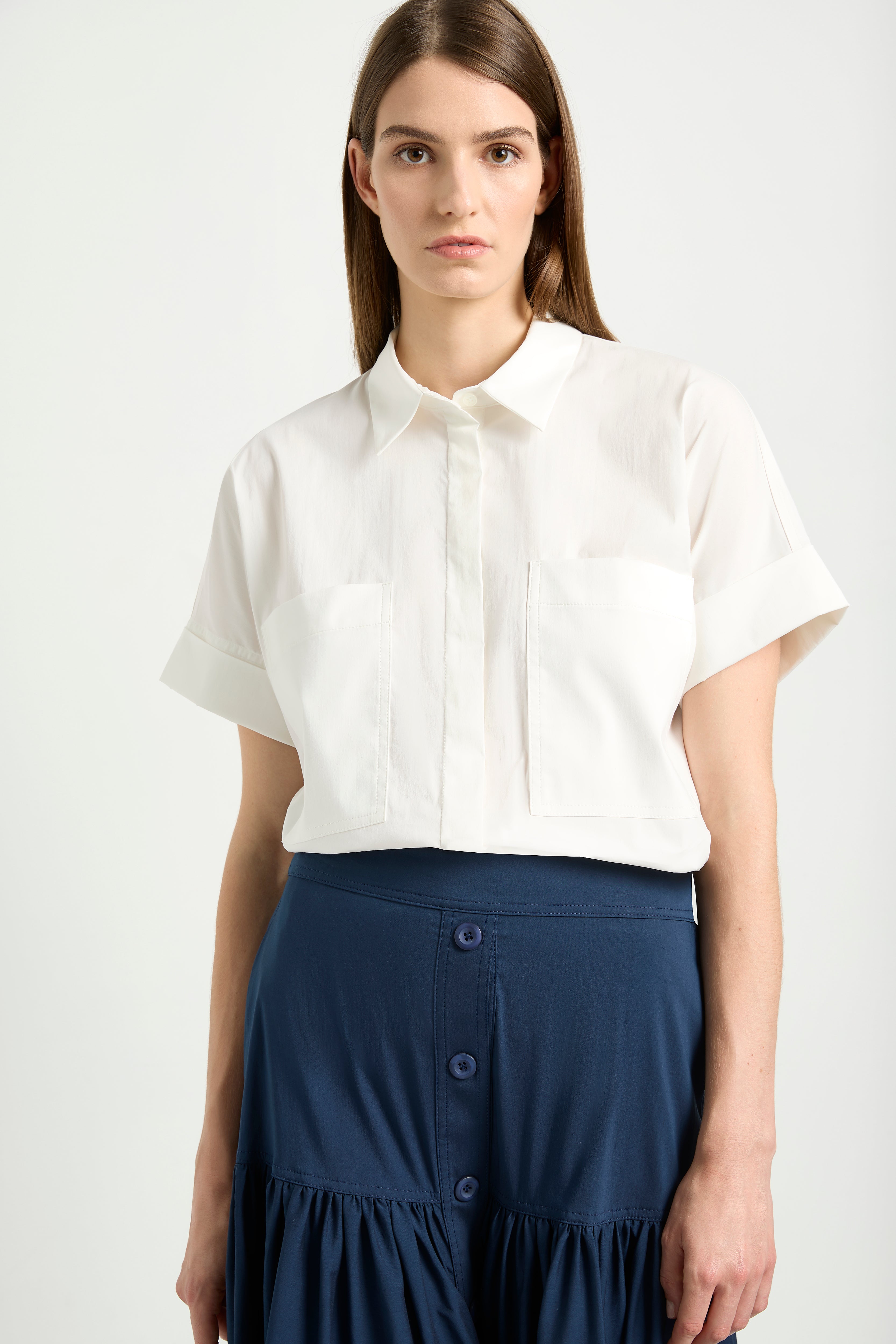 Introducing the Mela Purdie Shell Shirt Microprene: a luxuriously crisp and modern take on the classic wardrobe staple. Crafted from premium European cotton-rich fabric with a hint of stretch, this timeless shirt offers a generous relaxed fit and mid-body length - perfect for business and everyday wear. The striking stud accents and cargo pockets lend an on-trend finishing touch. Make a sophisticated statement.