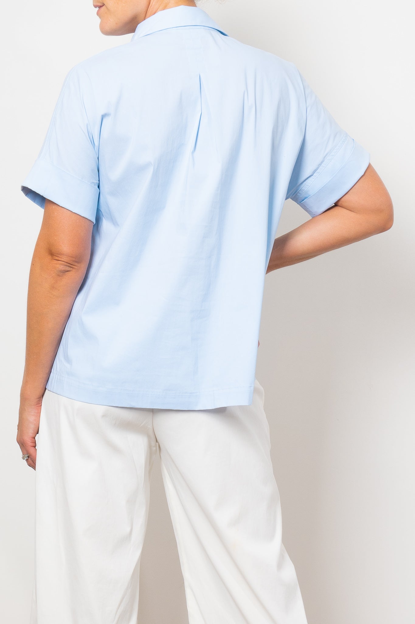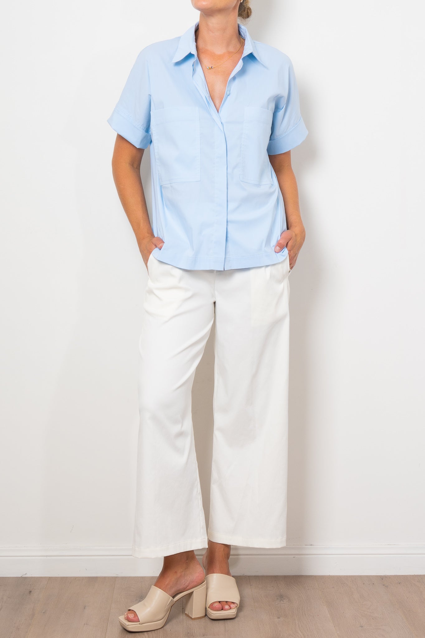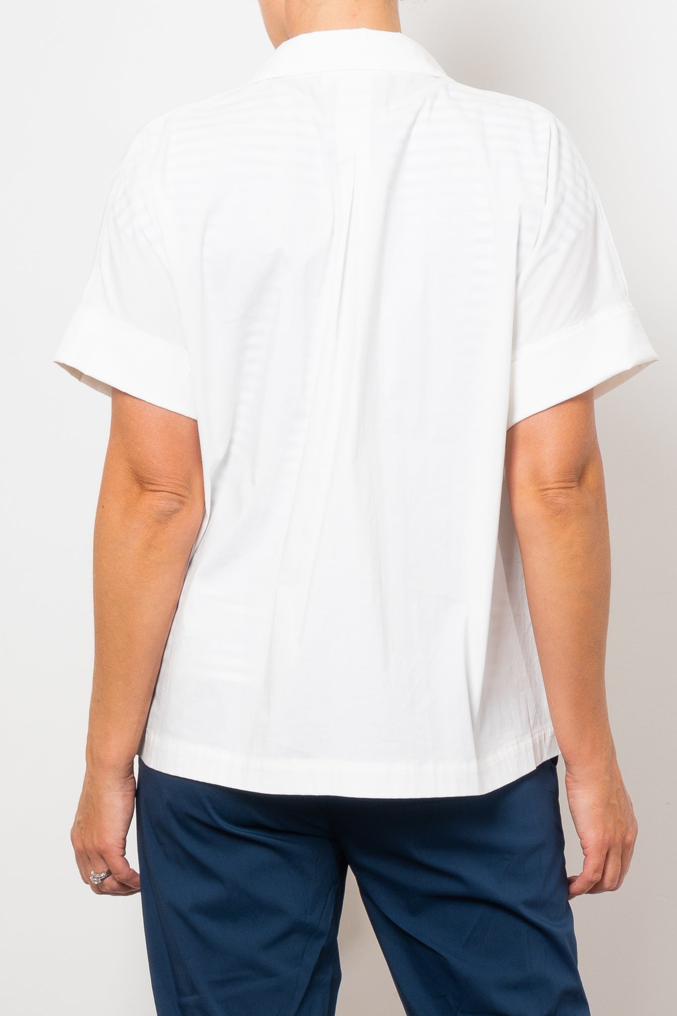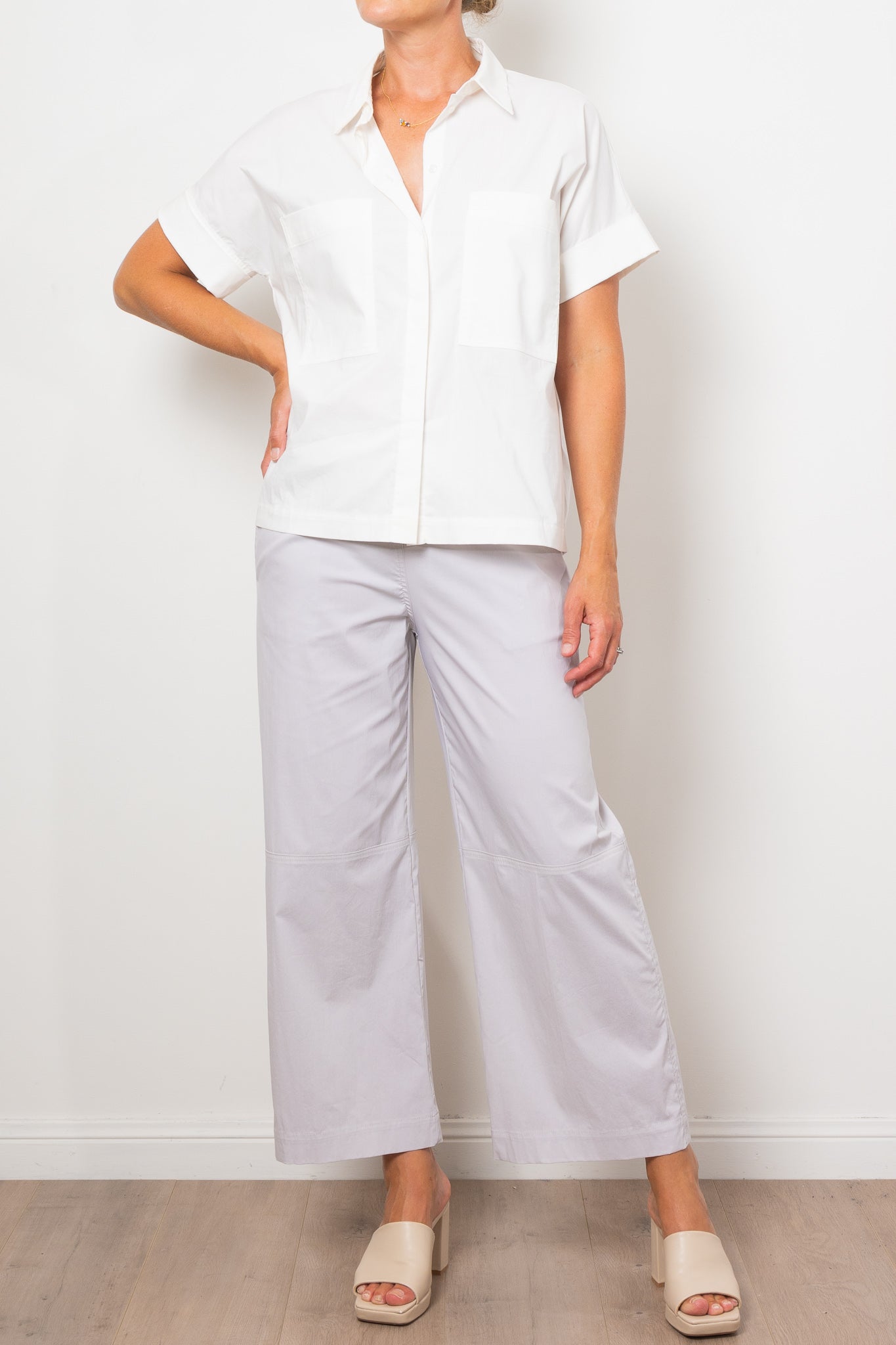 Introducing the Mela Purdie Shell Shirt Microprene: a luxuriously crisp and modern take on the classic wardrobe staple. Crafted from premium European cotton-rich fabric with a hint of stretch, this timeless shirt offers a generous relaxed fit and mid-body length - perfect for business and everyday wear. The striking stud accents and cargo pockets lend an on-trend finishing touch. Make a sophisticated statement.