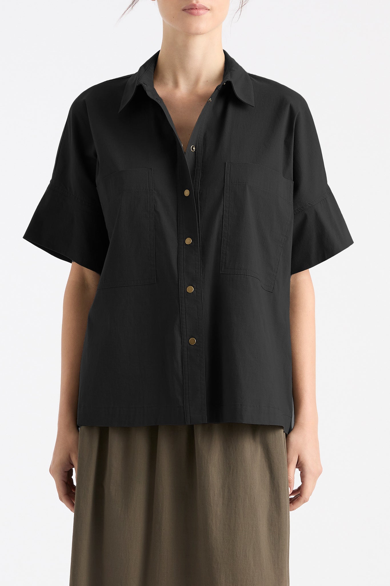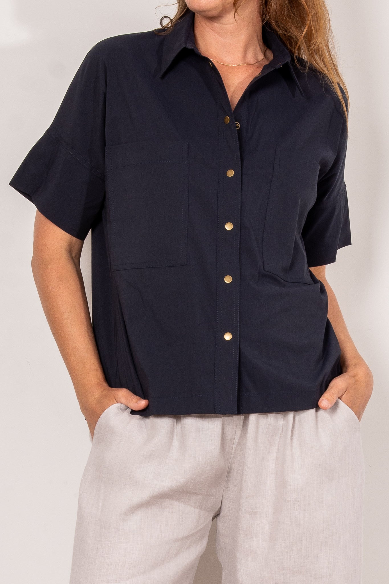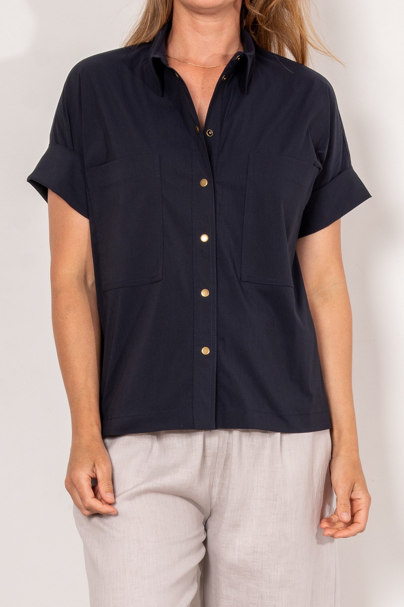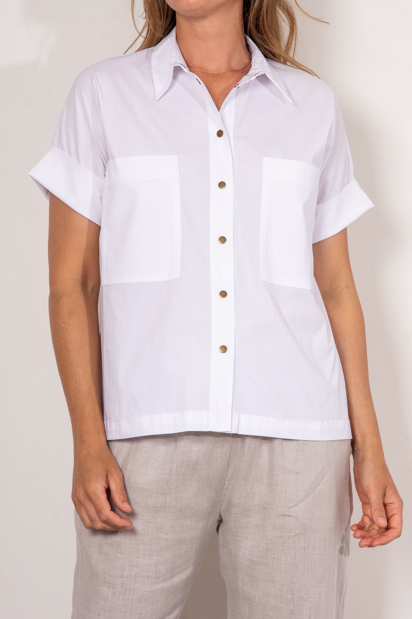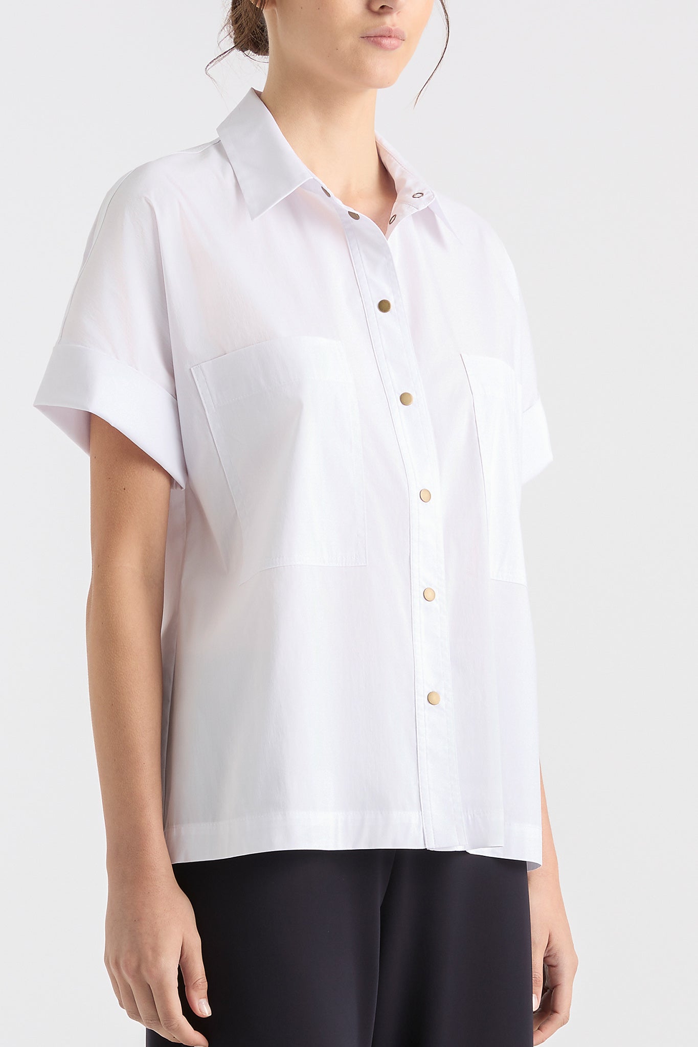 The Mela Purdie Stud Shell Shirt is a modern wardrobe must-have, crafted from cotton-rich Microprene fabric with high stretch for a polished finish. The shirt features cargo pockets and stylish stud accents, plus a generous relaxed fit and mid body length. It also has a crisp stand collar, concealed front placket with stud closure and mid-length sleeves which can be rolled up. Enjoy comfortable all-day wear in this fashionable shirt, designed and made in Australia.