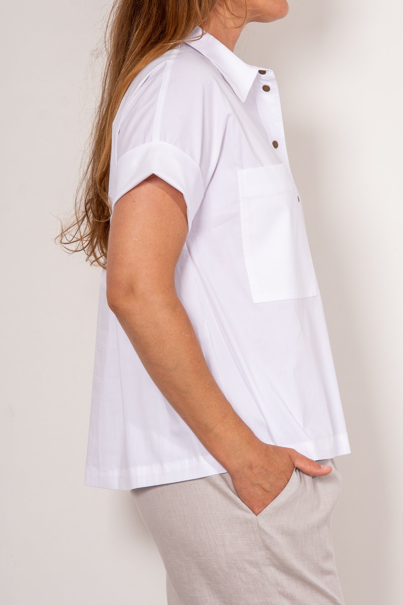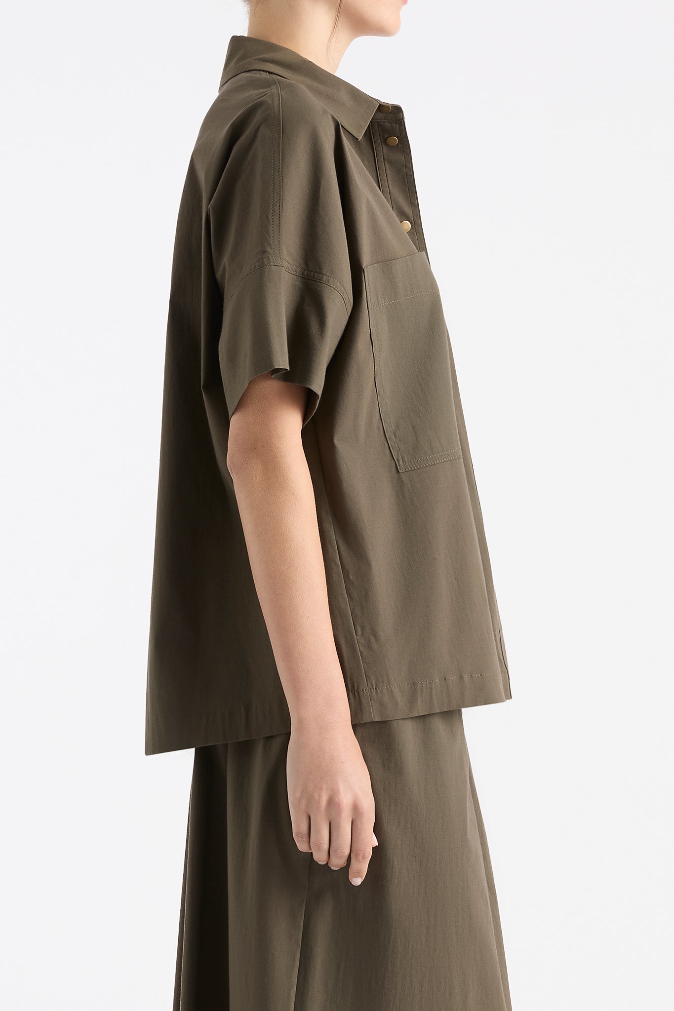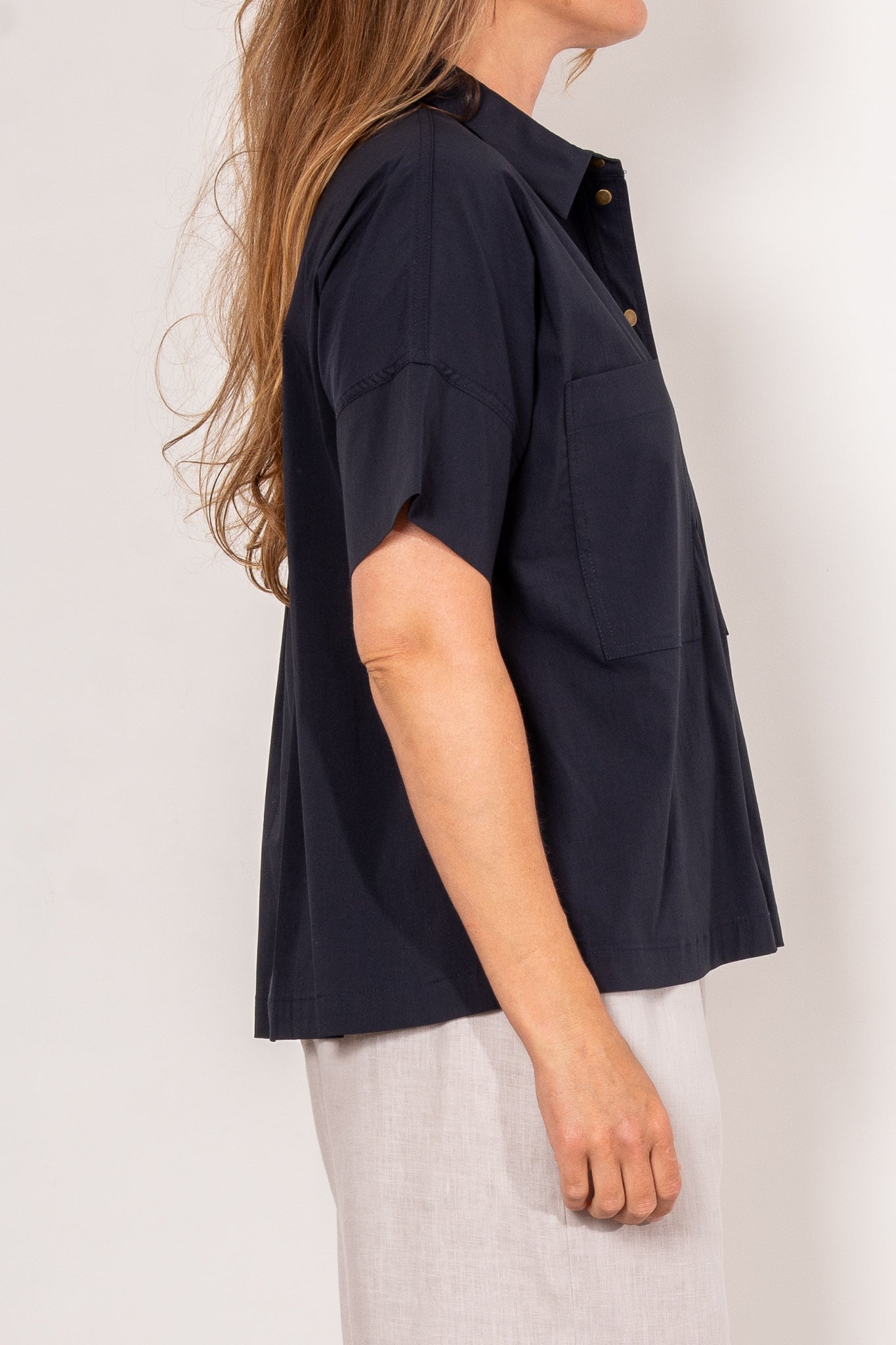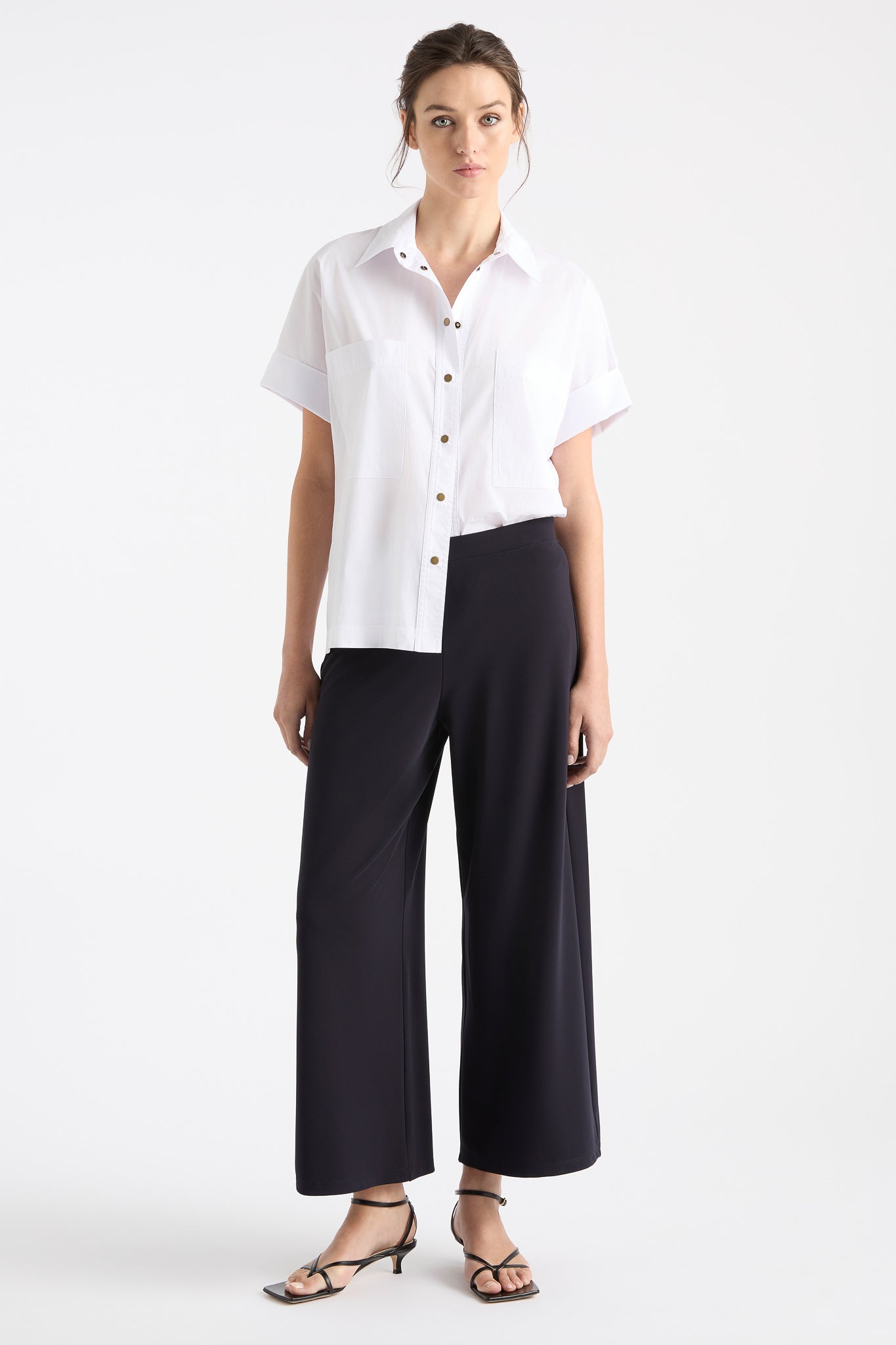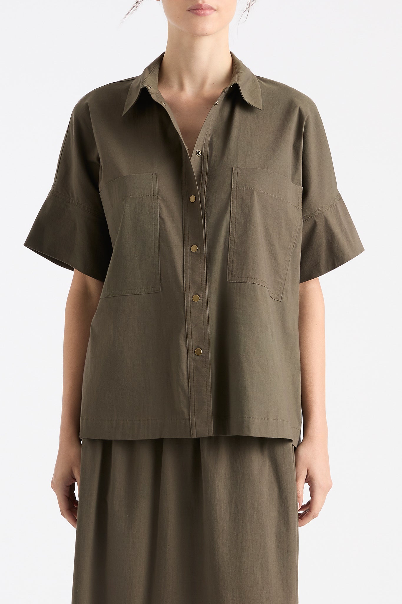The Mela Purdie Stud Shell Shirt is a modern wardrobe must-have, crafted from cotton-rich Microprene fabric with high stretch for a polished finish. The shirt features cargo pockets and stylish stud accents, plus a generous relaxed fit and mid body length. It also has a crisp stand collar, concealed front placket with stud closure and mid-length sleeves which can be rolled up. Enjoy comfortable all-day wear in this fashionable shirt, designed and made in Australia.