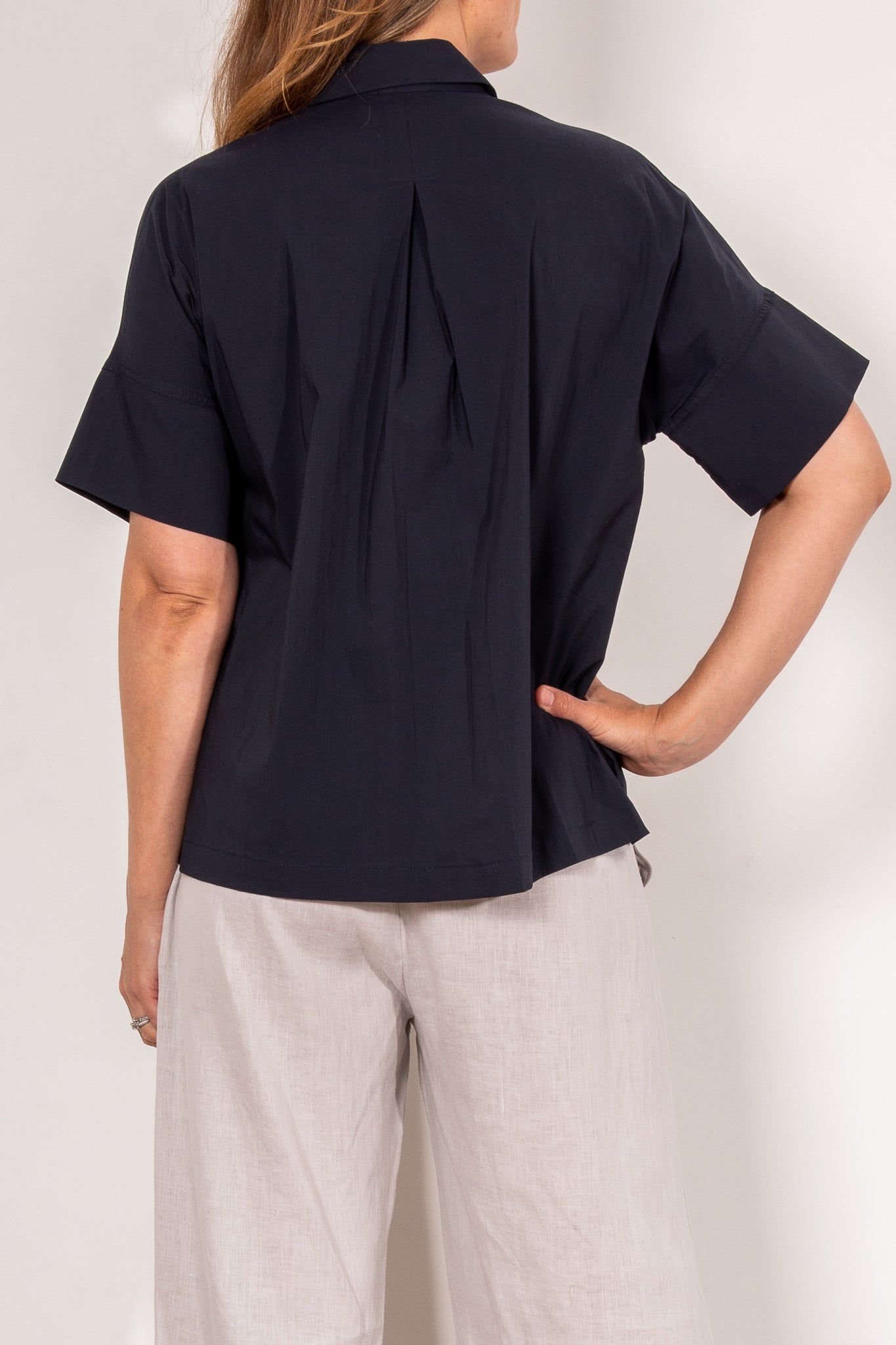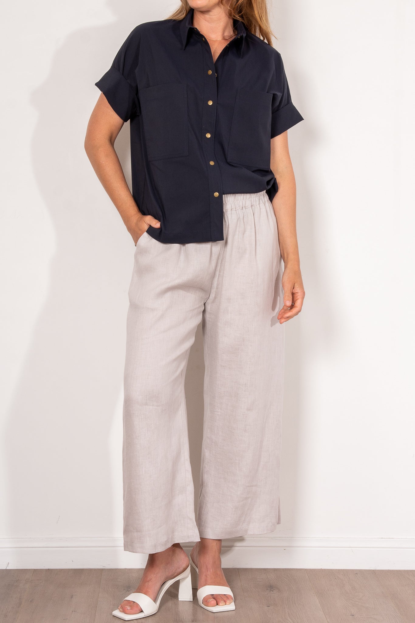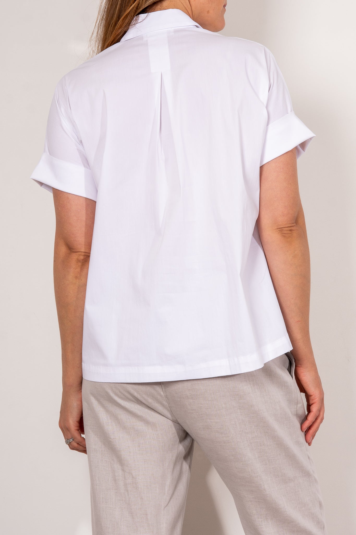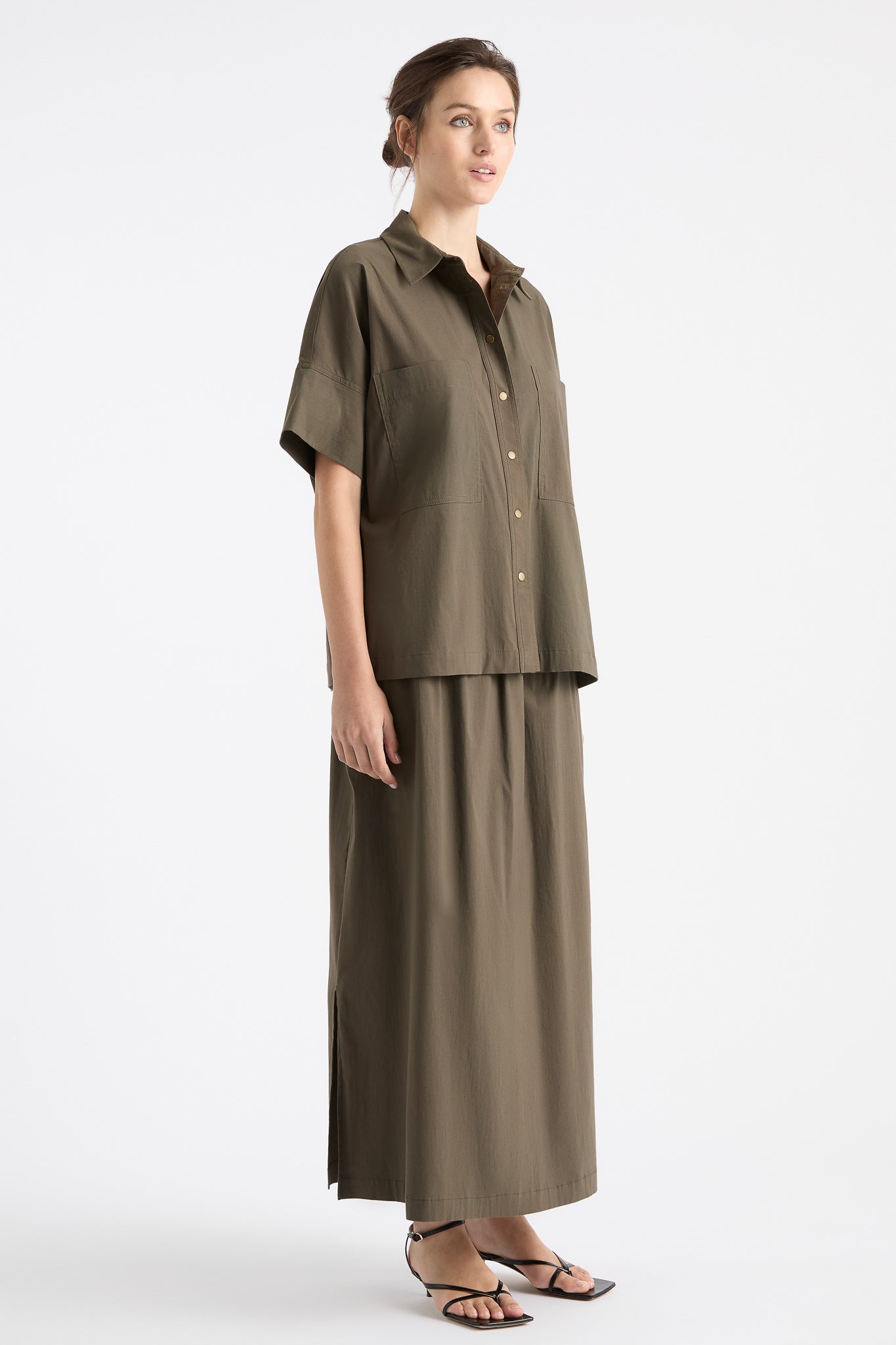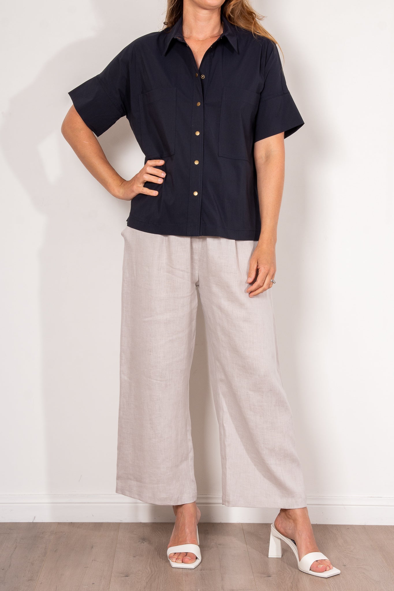 The Mela Purdie Stud Shell Shirt is a modern wardrobe must-have, crafted from cotton-rich Microprene fabric with high stretch for a polished finish. The shirt features cargo pockets and stylish stud accents, plus a generous relaxed fit and mid body length. It also has a crisp stand collar, concealed front placket with stud closure and mid-length sleeves which can be rolled up. Enjoy comfortable all-day wear in this fashionable shirt, designed and made in Australia.