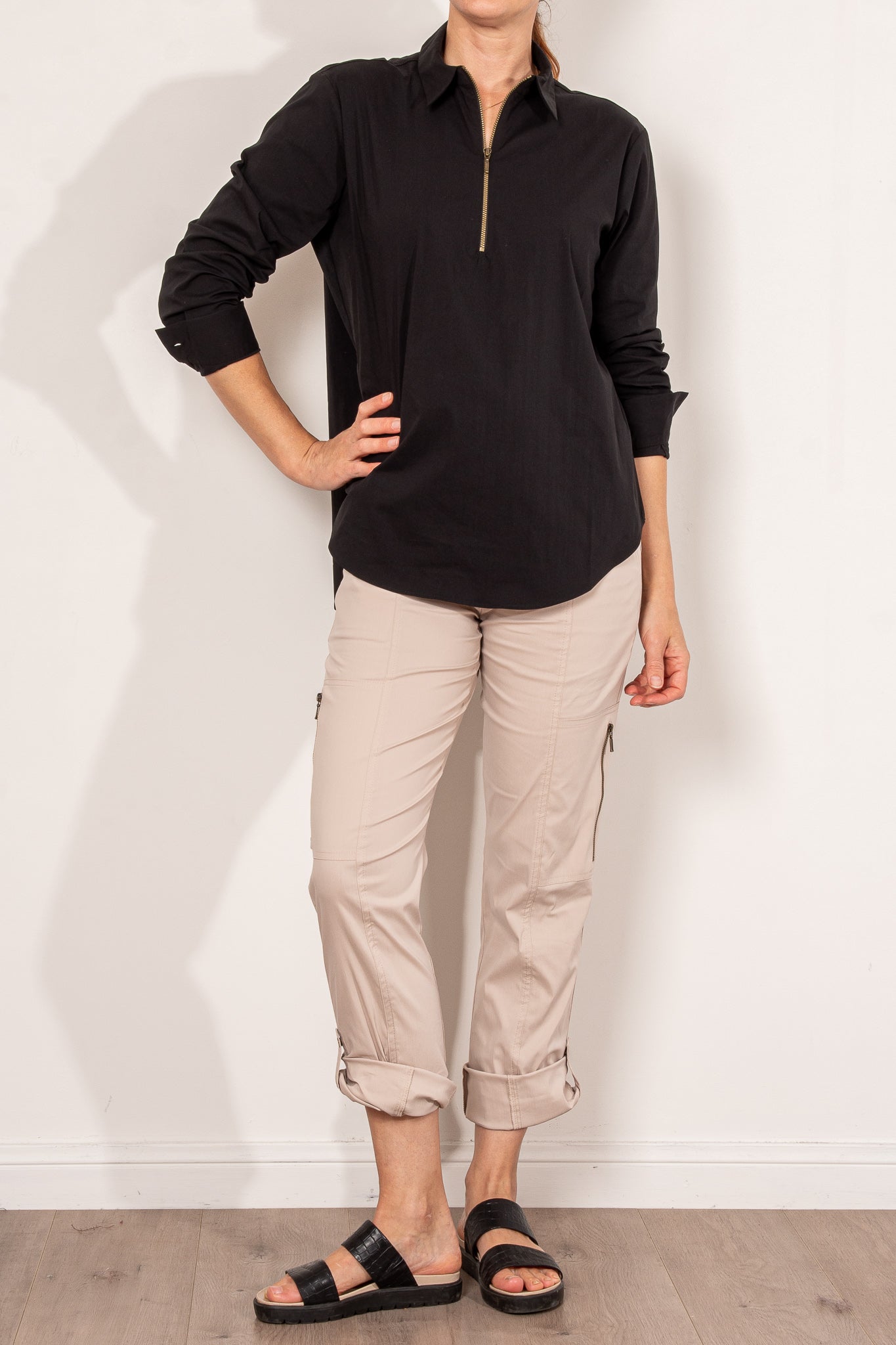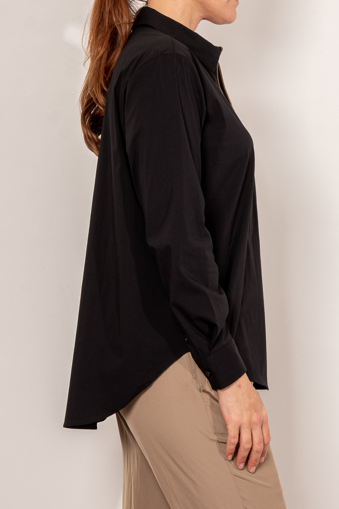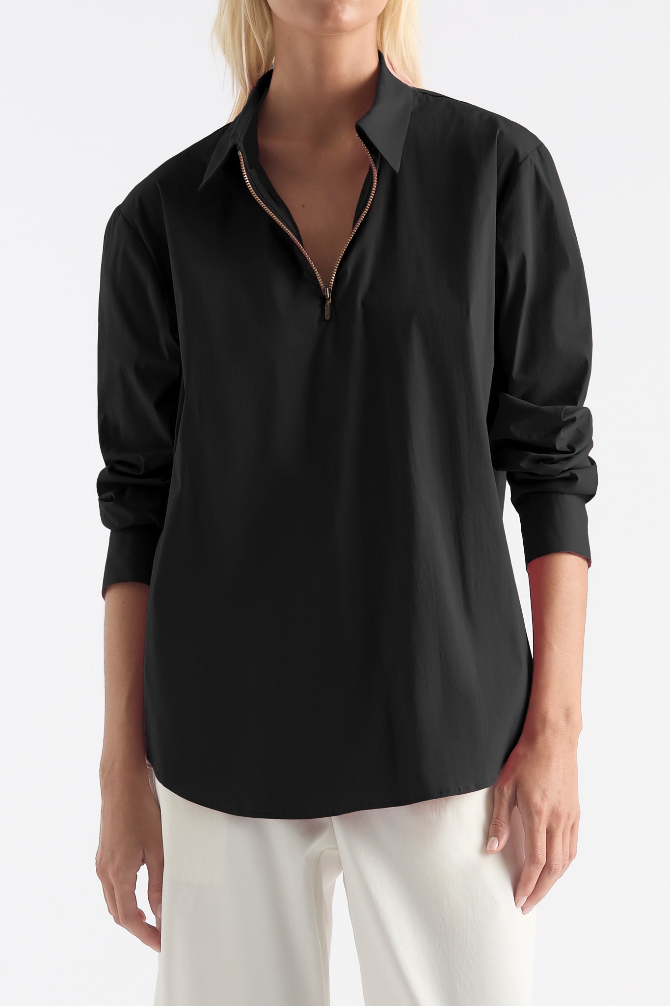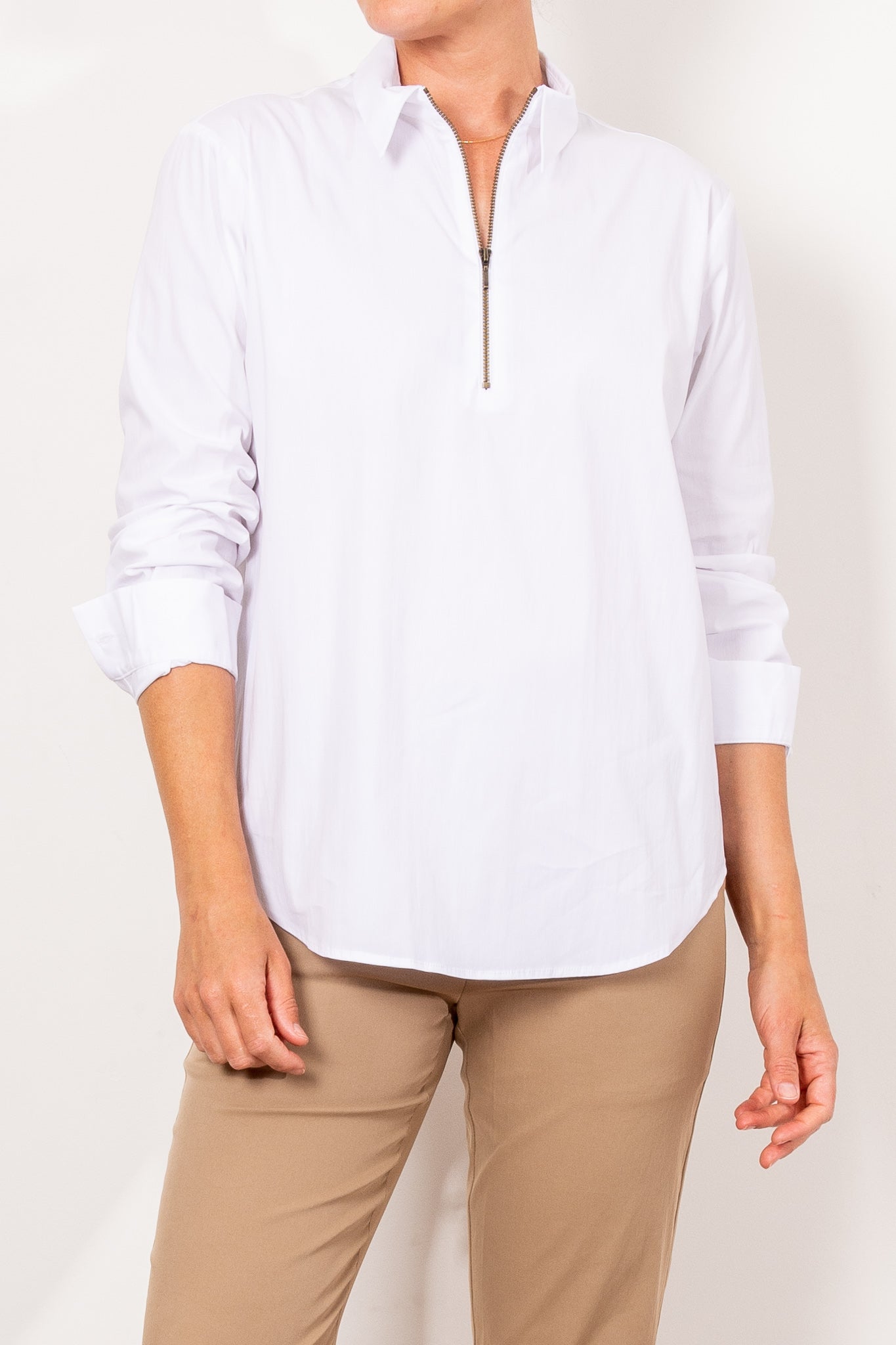 Feel beautiful and confident in the Mela Purdie Zip Front Shirt Microprene. This tailored fit top is made with a cotton-rich European fabrication and high-stretch fabric for ultimate comfort. With a crisp collar, full-length sleeves, and curved hemline, this shirt will have you looking fabulous! Live your best life in your stylish Australian-designed top.
