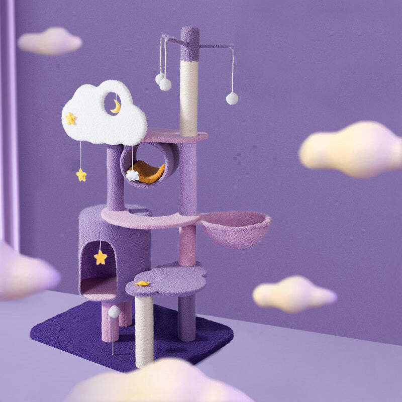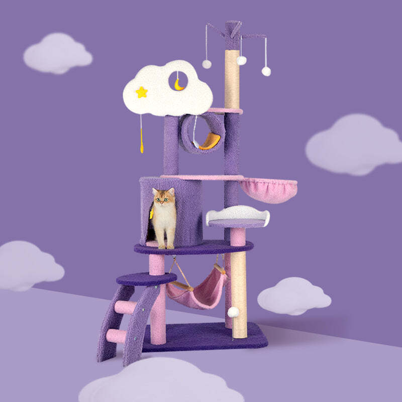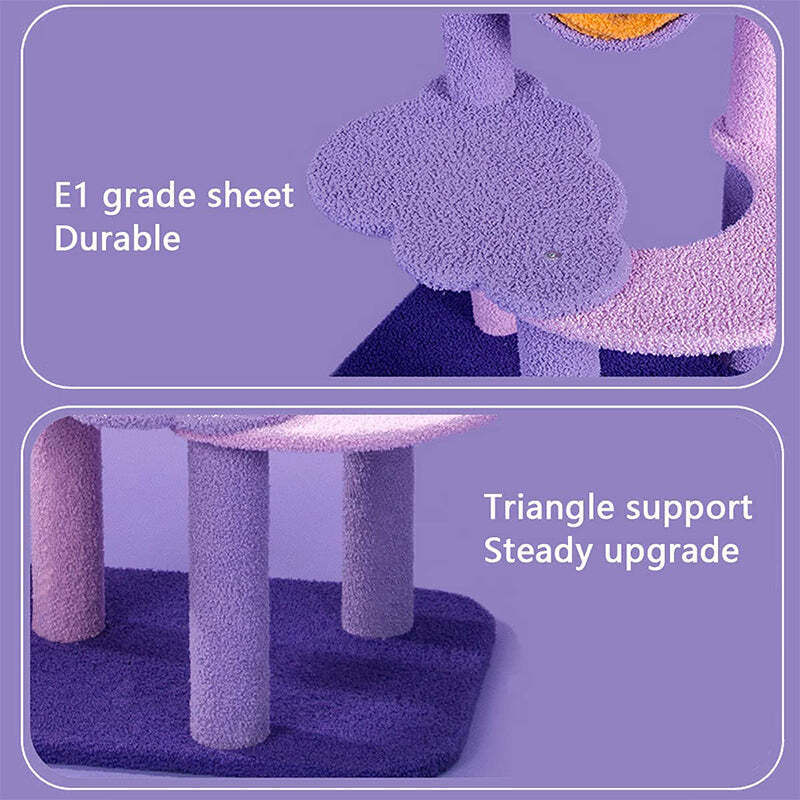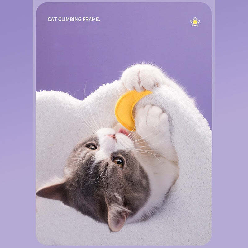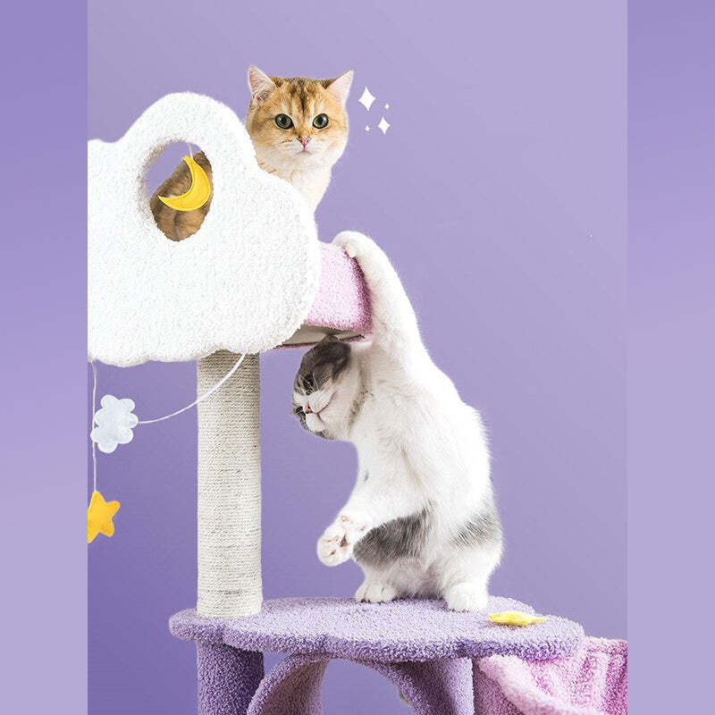 Hammocks and high seats allow your kitten to enjoy different pleasures while jumping up and down.The hanging moon and star attract the cat's attention and start hunting games.