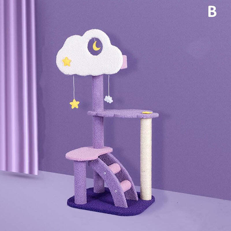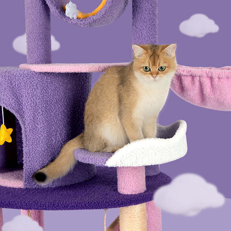 Hammocks and high seats allow your kitten to enjoy different pleasures while jumping up and down.The hanging moon and star attract the cat's attention and start hunting games.