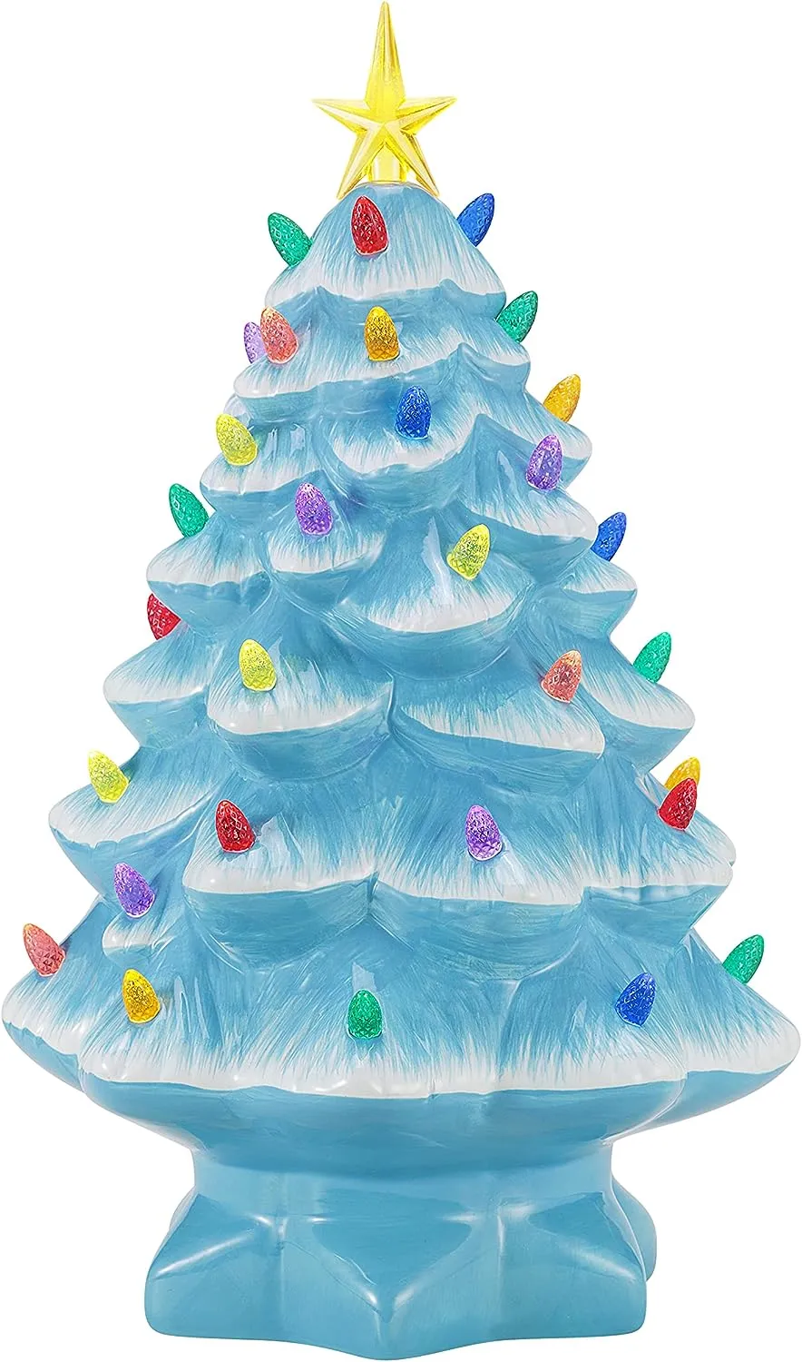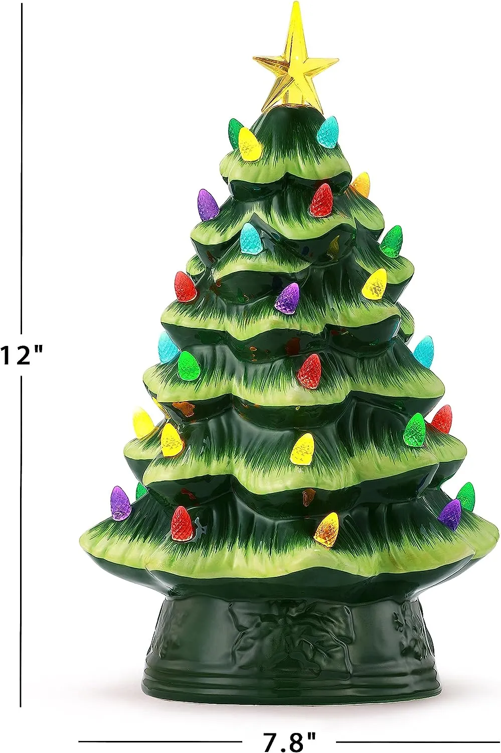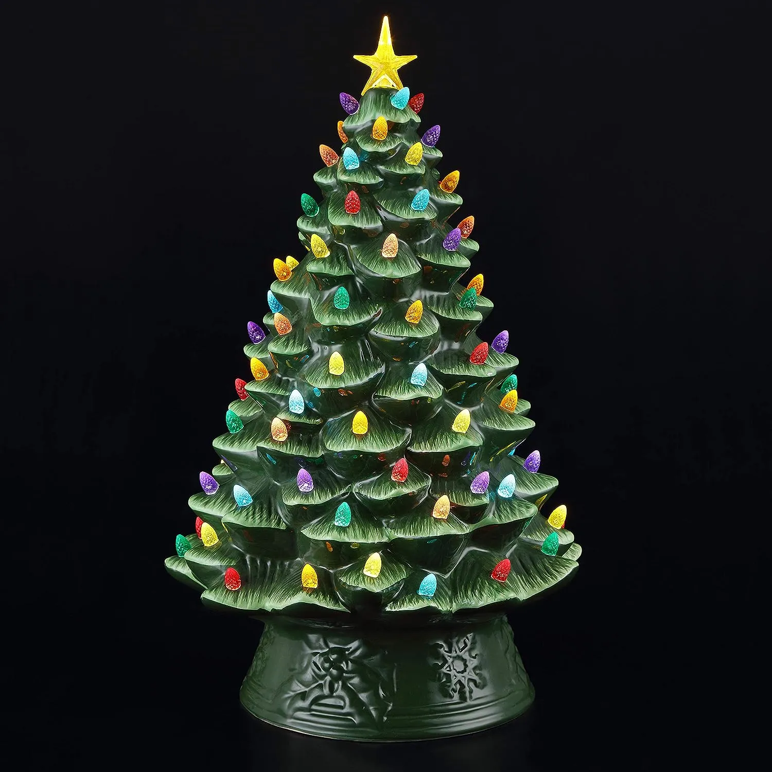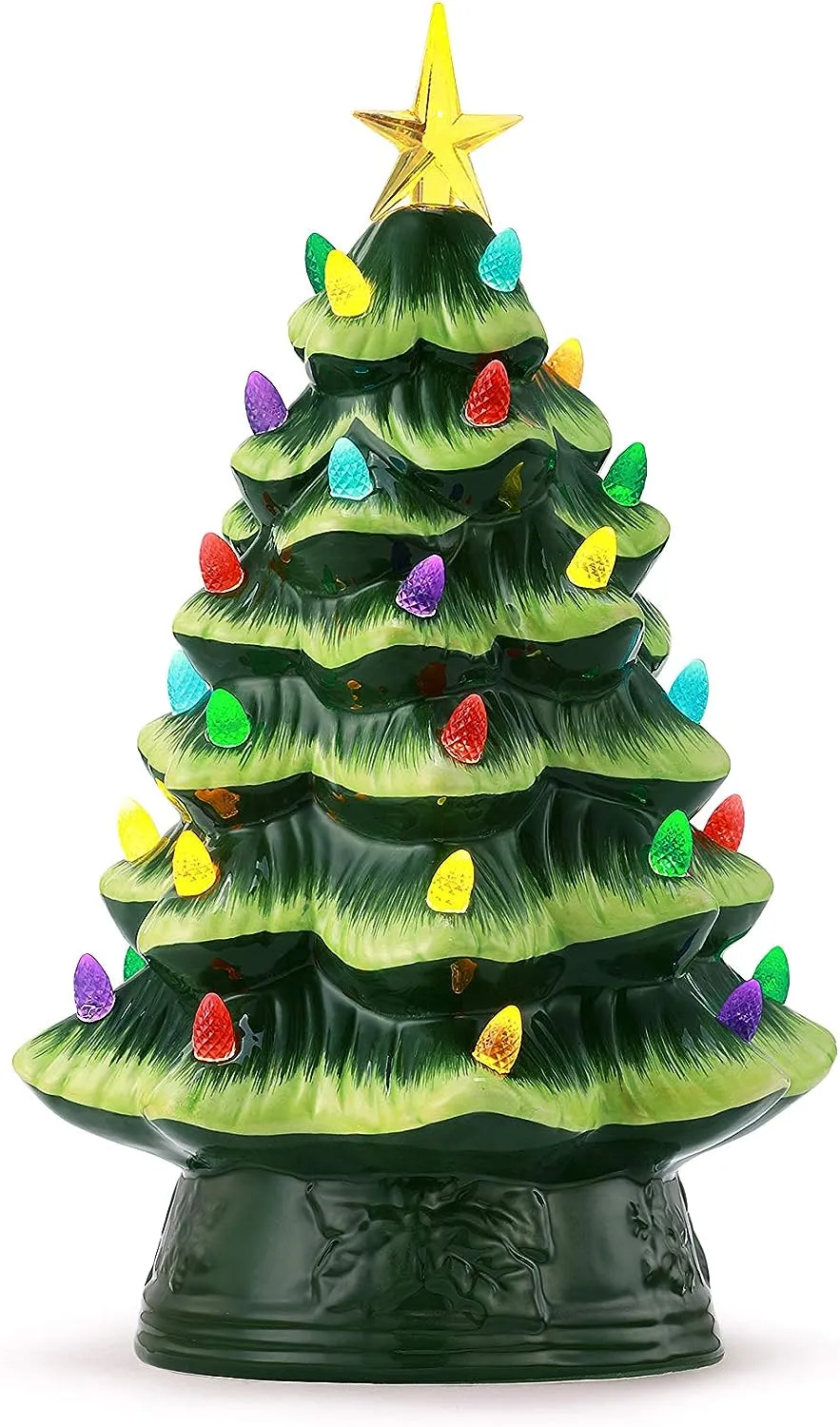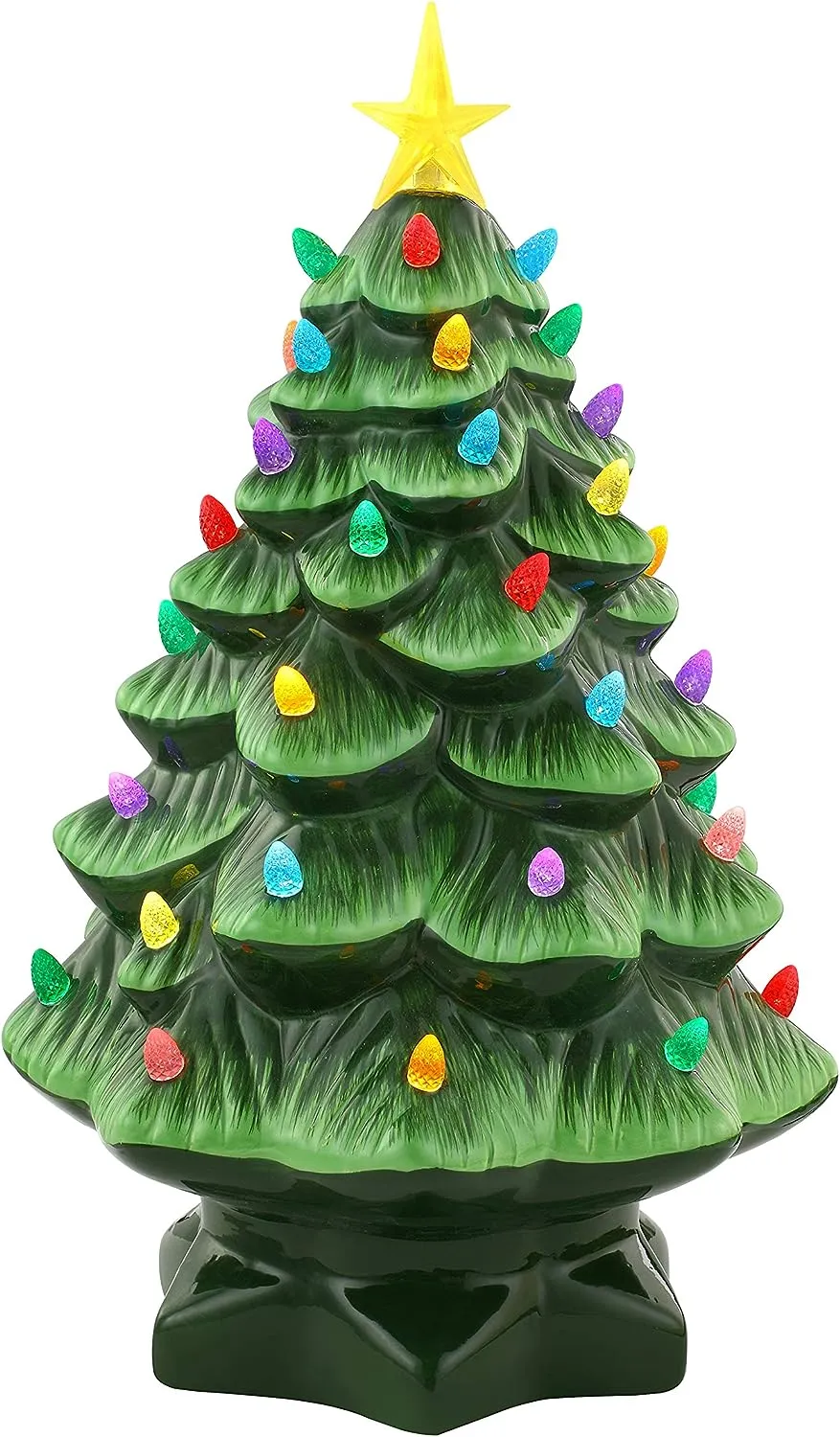 FEATURES LED LIGHTS: LED lights radiate through the multi-colored faceted bulbs, and a bright yellow star illuminates the top of the Christmas tree with a shiny hand-painted finish