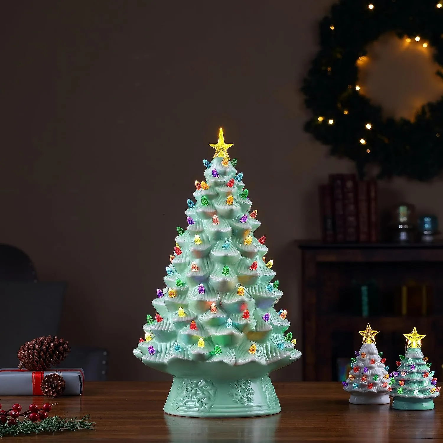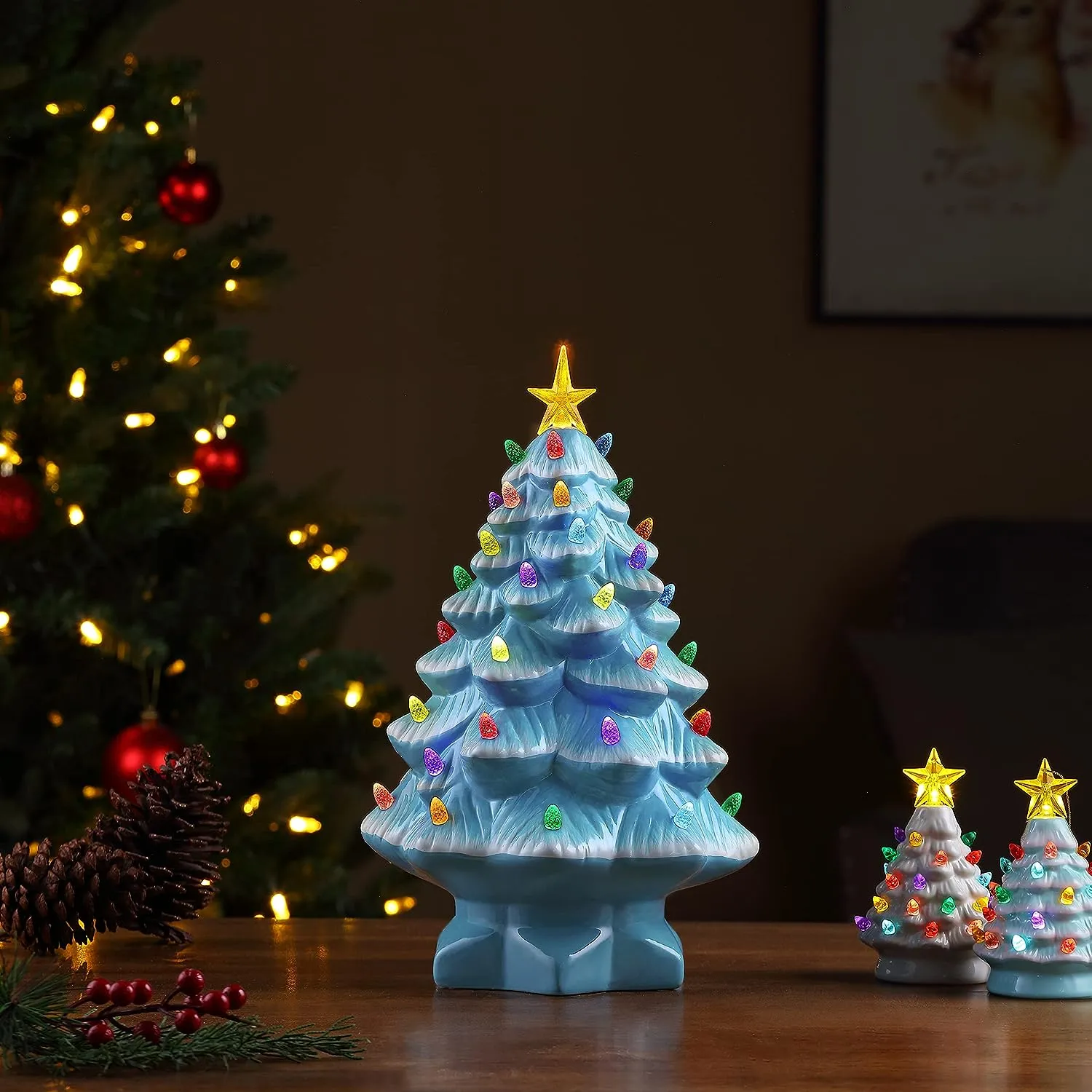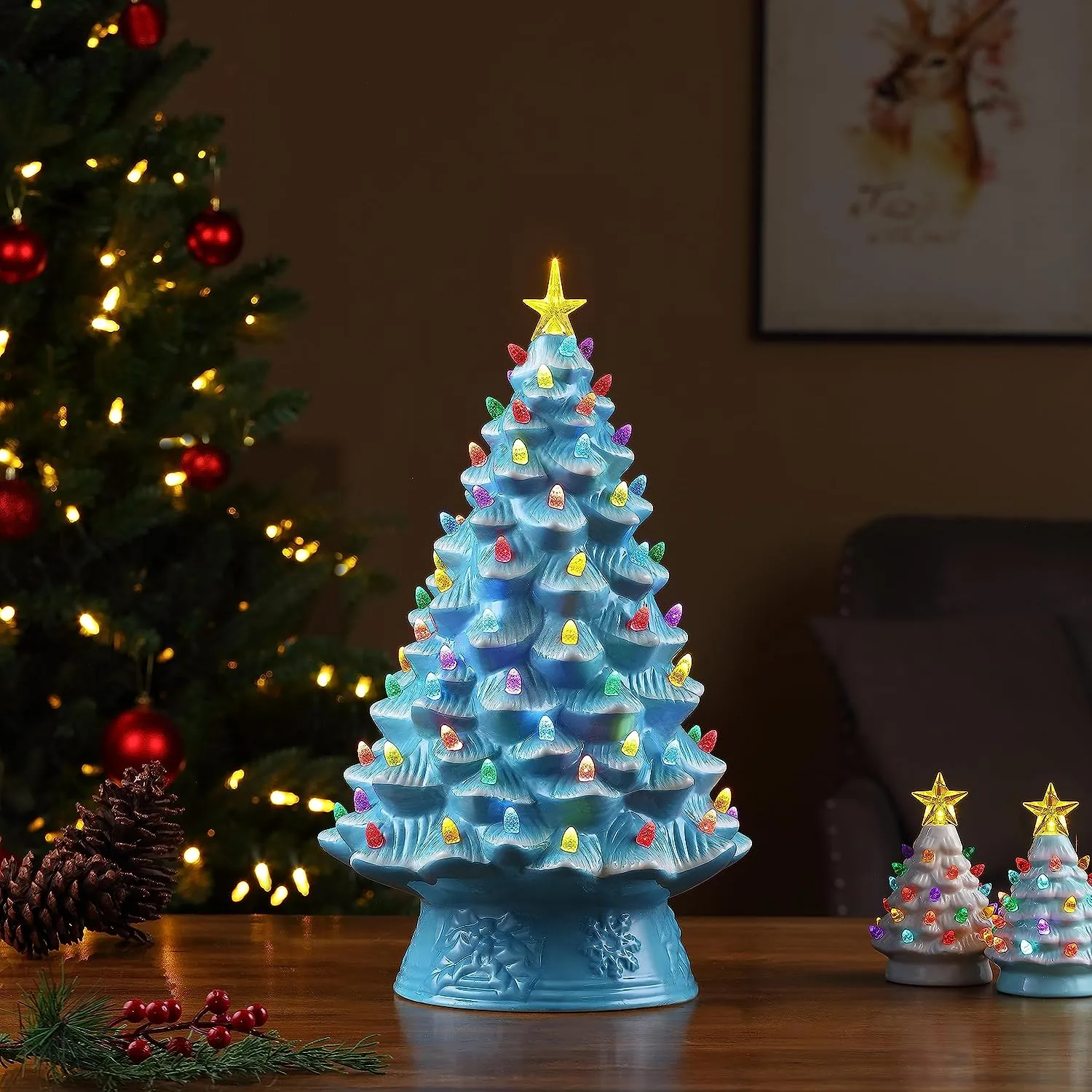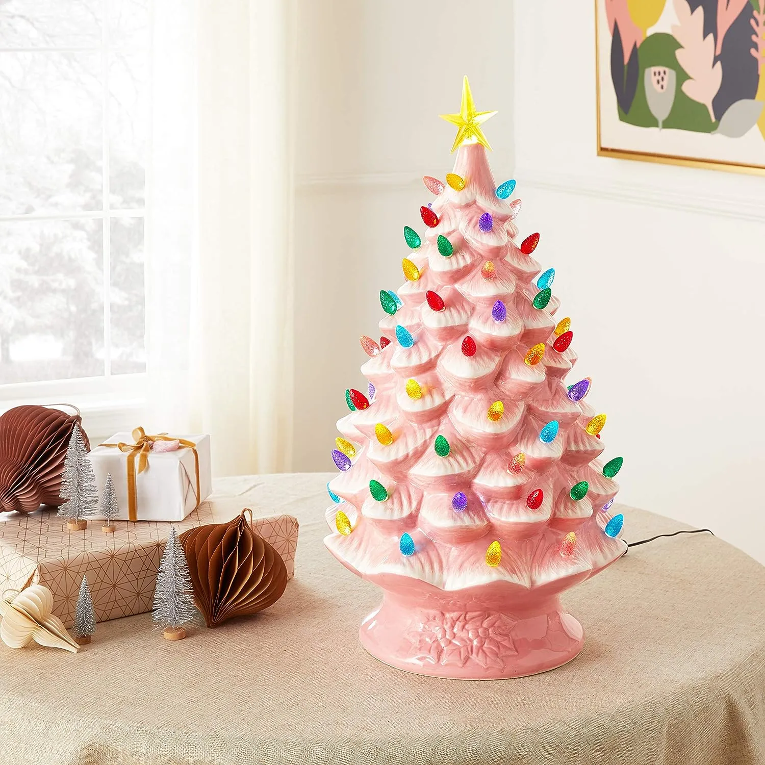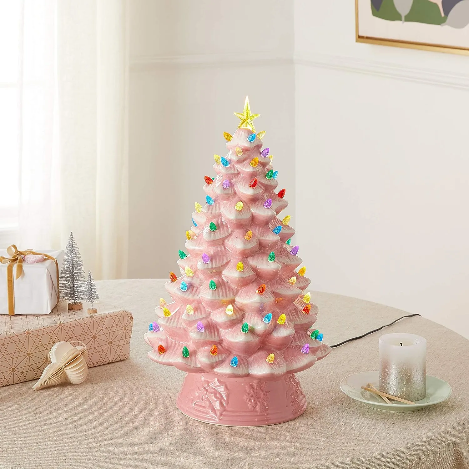 FEATURES LED LIGHTS: LED lights radiate through the multi-colored faceted bulbs, and a bright yellow star illuminates the top of the Christmas tree with a shiny hand-painted finish
